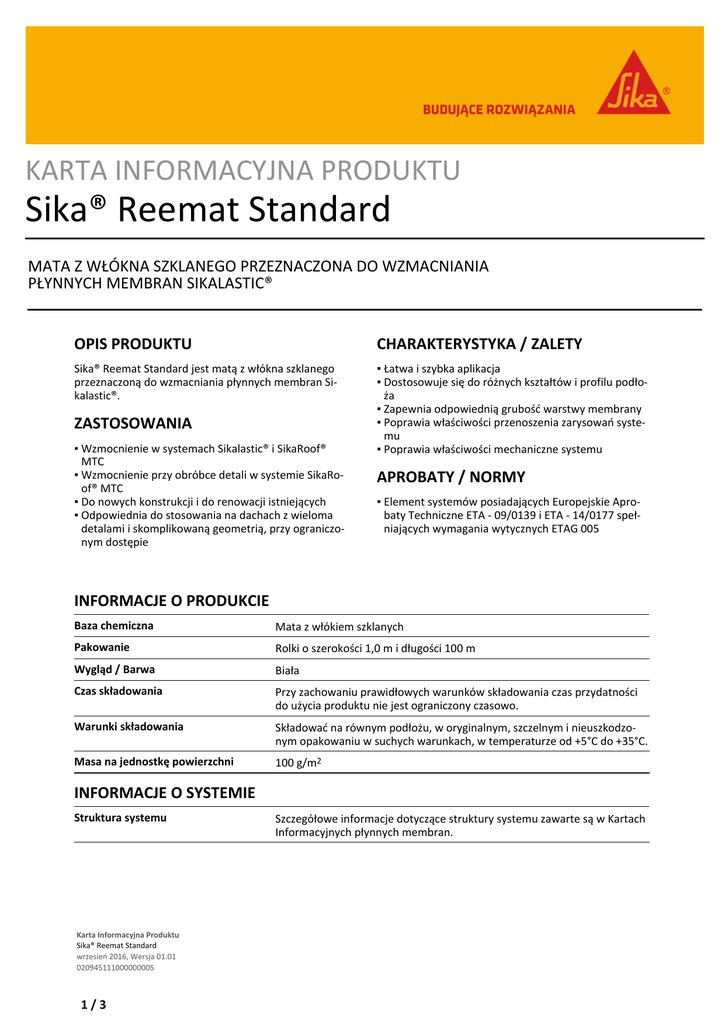 KARTA INFORMACYJNA PRODUKTU Sika® Reemat Standard MATA Z WŁÓKNA SZKLANEGO PRZEZNACZONA DO WZMACNIANIA PŁYNNYCH MEMBRAN SIKALASTIC® OPIS PRODUKTU CHARAKTERYSTYKA / ZALETY Sika® Reemat Standard jest matą z włókna szklanego przeznaczoną do wzmacniania płynnych membran Sikalastic®. ▪ Łatwa i szybka aplikacja ▪ Dostosowuje się do różnych kształtów i profilu podłoża ▪ Zapewnia odpowiednią grubość warstwy membrany ▪ Poprawia właściwości przenoszenia zarysowań systemu ▪ Poprawia właściwości mechaniczne systemu ZASTOSOWANIA ▪ Wzmocnienie w systemach Sikalastic® i SikaRoof® MTC ▪ Wzmocnienie przy obróbce detali w systemie SikaRoof® MTC ▪ Do nowych konstrukcji i do renowacji istniejących ▪ Odpowiednia do stosowania na dachach z wieloma detalami i skomplikowaną geometrią, przy ograniczonym dostępie APROBATY / NORMY ▪ Element systemów posiadających Europejskie Aprobaty Techniczne ETA - 09/0139 i ETA - 14/0177 spełniających wymagania wytycznych ETAG 005 INFORMACJE O PRODUKCIE Baza chemiczna Mata z włókiem szklanych Pakowanie Rolki o szerokości 1,0 m i długości 100 m Wygląd / Barwa Biała Czas składowania Przy zachowaniu prawidłowych warunków składowania czas przydatności do użycia produktu nie jest ograniczony czasowo. Warunki składowania Składować na równym podłożu, w oryginalnym, szczelnym i nieuszkodzonym opakowaniu w suchych warunkach, w temperaturze od +5°C do +35°C. Masa na jednostkę powierzchni 100 g/m2 INFORMACJE O SYSTEMIE Struktura systemu Karta Informacyjna Produktu Sika® Reemat Standard wrzesień 2016, Wersja 01.01 020945111000000005 1/3 Szczegółowe informacje dotyczące struktury systemu zawarte są w Kartach Informacyjnych płynnych membran. INSTRUKCJA APLIKACJI JAKOŚĆ PODŁOŻA Podłoże musi być mocne oraz mieć odpowiednią wytrzymałość, musi być czyste, suche, bez zanieczyszczeń, smarów i zatłuszczeń. W zależności od rodzaju podłoża musi być zagruntowane lub oczyszczone mechanicznie. Do wyrównania nierówności może być konieczne szlifowanie podłoża. Sika® Reemat Standard można stosować na betonie, papach i powłokach bitumicznych, metalach, cegle, azbestocemencie, dachówkach lub płytkach ceramicznych, drewnie. Szczegółowe informacje dotyczące jakości i przygotowania podłoża oraz materiałów gruntujących zawarte są w Zaleceniach stosowania odpowiednich płynnych membran. APLIKACJA Przed rozpoczęciem układania Sika® Reemat Standard należy upewnić się, że materiał grutnujący jest suchy w dotyku. Czas oczekiwania przed ułożeniem kolejnej warstwy podany jest w Karcie Informacyjnej materiału gruntującego. Obszary sąsiadujące, które mogą ulec uszkodzeniu lub zanieczyszczeniu jak np. poręcze lub balustrady muszą być zabezpieczone taśmą ochronną lub folią. Sika® Reemat Standard jest układana w połączeniu z systemem płynnych membran Sikalastic®. 1. Nanieść pierwszą warstwę płynnej membrany Sikalastic® w odpowiedniej ilości zgodnej z Kartą Informacyjną membrany. Nakładać membranę na taki obszar aby możliwe było osadzenie maty w płynnej membranie przed rozpoczęciem jej wiązania. 2. Rozwinąć i osadzić matę Sika® Reemat Standard wciskając ją w płynną membranę za pomocą wałka, usunąć pęcherzyki i zmarszczki. Minimalny zakład maty Sika® Reemat Standard wynosi 5 cm. Należy upewnić się, że zakłady maty są dokładnie nasycone membraną. 3. Na tym etapie może być konieczne dodanie niewielkiej ilości materiału aby wałek pozostawał mokry. 4. Po wyschnięciu membrany tak aby możliwe było chodzenie po niej nanieść kolejną warstwę płynnej membrany Sikalastic® w odpowiedniej ilości zgodnej z Kartą Informacyjną membrany. Zawsze rozpoczynać prace od uszczelniania detali a następnie układać membranę na powierzchniach poziomych. Szczegółowe informacje dotyczące aplikacji zawarte są w Zaleceniach stosowania odpowiednich płynnych membran. Karta Informacyjna Produktu Sika® Reemat Standard wrzesień 2016, Wersja 01.01 020945111000000005 2/3 OGRANICZENIA Ograniczenia zawarte są w Kartach Informacyjnych poszczególnych materiałów Sikalastic®. PODSTAWA DANYCH Wszelkie podane dane techniczne bazują na próbach i testach laboratoryjnych. Praktyczne wyniki pomiarów mogą nie być identyczne w związku z okolicznościami, na które producent nie ma wpływu. OGRANICZENIA LOKALNE EKOLOGIA, ZDROWIE I BEZPIECZEŃSTWO ZARZĄDZENIE (WE) NR-1907/2006-REACH Materiał ten odpowiada wymaganiom w rozumieniu Rozporządzenia Komisji Europejskiej nr 1907/2006 (REACH). Nie zawiera substancji, które mają skłonność do uwalniania się z materiału w normalnych lub przewidywalnych warunkach jego stosowania. W związku z powyższym, nie ma obowiązku rejestracji ze względu na substancje w materiale w rozumieniu artykułu 7.1 Rozporządzenia. Na podstawie aktualnie posiadanej wiedzy, materiał ten nie zawiera SVHC (substancji wzbudzających szczególnie duże obawy), według listy propozycji opublikowanej przez Europejską Agencję Chemikaliów, w stężeniu większym niż 0,1 % wagowo. NOTA PRAWNA Informacje, a w szczególności zalecenia dotyczące działania i końcowego zastosowania produktów Sika Poland Spółka z o.o. z siedzibą w Warszawie (dalej: „Sika”) są podane w dobrej wierze, przy uwzględnieniu aktualnego stanu wiedzy i doświadczenia Sika i odnoszą się do produktów składowanych, przechowywanych i używanych zgodnie z zaleceniami podanymi przez Sika. Z uwagi na występujące w praktyce zróżnicowanie materiałów, substancji, warunków i sposobu ich używania i umiejscowienia, pozostające całkowicie poza zakresem wpływu Sika, właściwości produktów podane w informacjach, pisemnych zaleceniach i innych wskazówkach udzielonych przez Sika nie mogą być podstawą do przyjęcia odpowiedzialności Sika w przypadku używania produktów niezgodnie z zaleceniami podanymi przez Sika. Użytkown