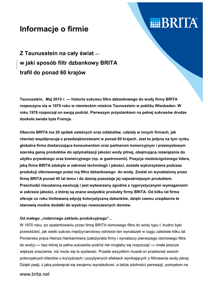 Informacje o firmie Z Taunusstein na cały świat — w jaki sposób filtr dzbankowy BRITA trafił do ponad 60 krajów Taunusstein, Maj 2015 r. — historia sukcesu filtra dzbankowego do wody firmy BRITA rozpoczyna się w 1970 roku w niemieckim mieście Taunusstein w pobliżu Wiesbaden. W roku 1976 rozpoczął on swoją podróż. Pierwszym przystankiem na pełnej sukcesów drodze dookoła świata była Francja. Obecnie BRITA ma 20 spółek zależnych oraz oddziałów, udziały w innych firmach, jak również współpracuje z przedsiębiorstwami w ponad 60 krajach. Jest to jedyna na tym rynku globalna firma dostarczająca konsumentom oraz partnerom komercyjnym i przemysłowym szeroką gamę produktów do optymalizacji jakości wody pitnej, obejmującą rozwiązania do użytku prywatnego oraz komercyjnego (np. w gastronomii). Pozycja niedoścignionego lidera, jaką firma BRITA zdobyła w zakresie technologii i jakości, została wykorzystana podczas produkcji oferowanego przez nią filtra dzbankowego do wody. Został on wynaleziony przez firmę BRITA ponad 45 lat temu i do dzisiaj pozostaje jej najważniejszym produktem. Przechodzi nieustanną ewolucję i jest wytwarzany zgodnie z rygorystycznymi wymaganiami w zakresie jakości, z której są znane wszystkie produkty firmy BRITA. Od kilku lat firma oferuje co roku limitowaną edycję kolorystyczną dzbanków, dzięki czemu urządzenia te stanowią modne dodatki do wystroju nowoczesnych domów. Od małego „rodzinnego zakładu produkcyjnego”... W 1970 roku, po opatentowaniu przez firmę BRITA domowego filtra do wody typu I, trudno było przewidzieć, jak wielki sukces międzynarodowy odniesie ten wynalazek w ciągu zaledwie kilku lat. Pionierska praca Heinza Hankammera (założyciela firmy i wynalazcy pierwszego domowego filtra do wody) — bez której ta pełna sukcesów podróż nie mogłaby się rozpocząć — miała jeszcze większe znaczenie, niż może się to wydawać. Przede wszystkim musiał on przekonać swoich potencjalnych klientów o korzyściach i pozytywnych efektach wynikających z filtrowania wody pitnej. Dzięki pasji, z jaką poświęcał się swojemu wynalazkowi, a także zdolności perswazji, pomysłom na www.brita.net BRITA GmbH sprzedaż i niespożytej energii, udało mu się położyć fundamenty pod grupę utworzoną na bazie firmy BRITA oraz pod działalność biznesową, jaką grupa zajmuje się do dnia dzisiejszego. „Patrząc wstecz, możemy podziwiać umiejętność przewidywania i niezłamaną determinację, którymi wykazał się mój ojciec, rozwijając nową technologię w najdrobniejszych szczegółach — był zawsze całkowicie pewien swojego sukcesu, ale nigdy nie wiedział na pewno, czy uda mu się utworzyć niszę na rynku” — mówi Markus Hankammer, syn założyciela firmy. „Solidarność — na początku pomiędzy członkami rodziny, a później w ramach całej struktury korporacyjnej — oraz oczywiście wysoka jakość produktów i ich wydajność filtrowania wody pozwoliły nam przekonać klientów w każdym zakątku świata do korzyści płynących z używania filtrów do wody pitnej”. Heinz Hankammer zabrał swój pierwszy produkt — przygotowany w przydomowym ogródku — na wystawę połączoną z targami i użył go, aby zademonstrować tzw. test herbaty. Ludzie stali się (dosłownie) naocznymi świadkami korzyści wynikających z optymalizacji jakości wody przy użyciu produktu BRITA. Przygotowano dwie filiżanki herbaty: jedną z użyciem wody przefiltrowanej przez filtr BRITA, a drugą z użyciem wody bieżącej, po czym obie wystudzono. Na powierzchni herbaty przygotowanej z wody bieżącej uformowała się cienka warstwa osadu, natomiast herbata zaparzona z użyciem wody przefiltrowanej przez urządzenie BRITA miała o wiele bardziej przejrzysty i apetyczny wygląd, a przy tym mogła rozwinąć swój pełny aromat. ...po lidera na rynku europejskim,... Pod koniec lat 70. i na początku lat 80. wytwarzany przez firmę domowy filtr do wody typu II odniósł sukces, wychodząc poza Taunusstein i rynek niemiecki najpierw do Francji, potem do Hiszpanii, a wreszcie także do Wielkiej Brytanii. Zostały wówczas położone fundamenty umożliwiające sprzedaż produktów na całym świecie. Ten rozdział historii sukcesu firmy rozpoczął się od założenia spółki zależnej w Wielkiej Brytanii (w 1981 roku), która do dzisiaj pozostaje jedną z najsilniejszych spółek działających w ramach grupy BRITA. W końcu w Wielkiej Brytanii, regionie znanym ze znacznego spożycia herbaty, istnieje ogromne zapotrzebowanie na wodę o optymalnej jakości. Do czasu, gdy dział sprzedaży utworzył w 1987 roku swoje przedstawicielstwo w Szwajcarii, w Niemczech fraza „filtrowana przez BRITA” stała się już synonimem najwyższej jakości filtracji wody dla gospodarstw domowych. Filtr dzbankowy do wody firmy BRITA stał się synonimem urządzenia do filtracji wody. Do chwili otwarcia przez firmę BRITA zakładu produkcyjnego w Wielkiej Brytanii w 1994 roku filtrowanie wody przez produkty BRITA stało się już popularne w wielu domach — od Europy Zachodniej (np. w krajach Beneluksu) po Europę Wschodnią (np. w Polsce). Strona 2 / 4 BRITA GmbH ...który z czasem zmienił się w gracza światowego... W roku 1986 Ameryka „odkryła” filtrację wody dla potrzeb gospodarstw domowych. Heinz Hankammer ponownie zaprezentował swój produkt osobiście, a jego talent handlowy szybko pozwolił mu odnieść sukces. Wkrótce dołączyły także pozostałe kontynenty: w 1993 roku założono spółkę zależną w Australii. W roku 1996 firma BRITA weszła w spółkę joint venture w Indiach, otwierając sobie drogę na rynek azjatycki, a zaledwie dwa lata później Republika Południowej Afryki wprowadziła filtry BRITA do standardowego użytku. Od 1999 roku Markus Hankammer, syn założyciela firmy, jest jej CEO. Udało mu się wprowadzić filtry do wody BRITA na kolejne rynki dzięki założe
