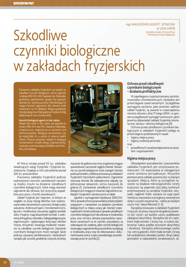 mgr MA£GORZATA GO£OFIT- SZYMCZAK dr LIDIA ZAPÓR Szkodliwe czynniki biologiczne w zak³adach fryzjerskich Ochrona przed szkodliwymi czynnikami biologicznymi – dzia³ania profilaktyczne fot. Craig Jewell. Pracownicy zak³adów fryzjerskich s¹ nara¿eni na szkodliwe czynniki biologiczne: wirusy (gatunki z rodzaju HBV, HCV i HIV), bakterie (np. chlamydie, gronkowce, paciorkowce), grzyby oraz paso¿yty zewnêtrzne. Zanieczyszczenia mikrobiologiczne mog¹ stanowiæ zagro¿enie dla zdrowia osób nara¿onych na ich dzia³anie. Mog¹ wywo³ywaæ choroby alergiczne, infekcje górnych i dolnych dróg oddechowych oraz choroby skóry. Harmful biological agents in hair salons People who work in hair salons are exposed to viruses (HBV, HCV and HIV), bacteria (chlamydia, streptococcus, staphylococcus bacteria) and external parasites. Biological contaminants can be responsible for a variety of adverse health effects. Physical symptoms related to biological contamination include allergy, hypersensitivity, respiratory and toxicological problems and infectious skin diseases. Centralny Instytut Ochrony Pracy – Pañstwowy Instytut Badawczy W zapobieganiu rozprzestrzenianiu siê drobnoustrojów chorobotwórczych niezbêdne jest przestrzeganie zasad sanitarnych. Szczegó³owe wymagania sanitarne, jakie powinien spe³niaæ zak³ad fryzjerski, s¹ zawarte w rozporz¹dzeniu ministra zdrowia z dnia 17 lutego 2004 r. w sprawie szczegó³owych wymagañ sanitarnych, jakim powinny odpowiadaæ zak³ady fryzjerskie, kosmetyczne, tatua¿u i odnowy biologicznej [9]. Ochrona przed szkodliwymi czynnikami biologicznymi w zak³adach fryzjerskich polega na przestrzeganiu podstawowych zasad: • higieny miejsca pracy • higieny osobistej personelu oraz • prawid³owych zasad postêpowania ze sprzêtem i wyposa¿eniem. Higiena miejsca pracy W Polsce istnieje ponad 50 tys. zak³adów świadcz¹cych us³ugi fryzjerskie i fryzjersko-kosmetyczne. Znajduje w nich zatrudnienie ponad 200 tys. pracowników. Pracownicy zak³adów fryzjerskich podczas wykonywania czynności zawodowych nara¿eni s¹ miêdzy innymi na dzia³anie szkodliwych czynników biologicznych, które mog¹ stanowiæ zagro¿enie dla zdrowia, byæ przyczyn¹ wypadków przy pracy i chorób zawodowych. Zak³ad fryzjerski jest miejscem, w którym ze wzglêdu na du¿¹ rotacjê klientów oraz wykonywanie wielu ró¿norodnych czynności, istnieje ryzyko zaka¿enia drobnoustrojami chorobotwórczymi, ³¹cznie z mo¿liwości¹ naruszenia ci¹g³ości pow³ok skóry. Fryzjerzy maj¹ bezpośredni kontakt z ow³osion¹ skór¹ g³owy cz³owieka. Zabiegi pielêgnacyjne, regeneracyjne i upiêkszaj¹ce dotycz¹ce w³osów (mycie, strzy¿enie) stwarzaj¹ mo¿liwośæ nara¿enia na szkodliwe czynniki biologiczne. Zaka¿enie czynnikami biologicznymi mo¿e nast¹piæ tak¿e podczas u¿ywania zainfekowanych, niesterylnych narzêdzi, jak: szczotki, grzebienie, no¿yczki, brzytwy, 20 01/2009 maszynki do golenia oraz inne urz¹dzenia mog¹ce spowodowaæ naruszenie ci¹g³ości tkanek. Nara¿enie na czynniki biologiczne mo¿e nast¹piæ równie¿ podczas kontaktu z bielizn¹ stosowan¹ w zak³adach fryzjerskich (rêcznikami i pelerynkami). Zagro¿enie stanowi¹ równie¿ źle zabezpieczone odpady, np. jednorazowe rêkawiczki, ostrza maszynek do golenia [1]. Zestawienie szkodliwych czynników biologicznych mog¹cych stwarzaæ zagro¿enie w zak³adach fryzjerskich zamieszczono w tabeli. Zgodnie z wymaganiami dyrektywy 2000/54/ WE w sprawie ochrony pracowników przed ryzykiem zwi¹zanym z nara¿eniem na dzia³anie czynników biologicznych w miejscu pracy, jak równie¿ rozporz¹dzeniem ministra zdrowia w sprawie szkodliwych czynników biologicznych dla zdrowia w środowisku pracy oraz ochrony zdrowia pracowników zawodowo nara¿onych na te czynniki, pracodawcy s¹ zobowi¹zani do ustalenia, jakie czynniki biologiczne stwarzaj¹ce zagro¿enie dla pracowników wystêpuj¹ w środowisku pracy oraz do dokonywania i dokumentowania oceny ryzyka zawodowego powodowanego przez te czynniki [2]. Obowi¹zkiem pracodawców i pracowników zak³adów fryzjerskich jest utrzymywanie pomieszczeñ i ich wyposa¿enia w nienagannym stanie sanitarno-porz¹dkowym. Wszystkie pomieszczenia zak³adu powinny byæ na bie¿¹co sprz¹tane. Miejsca, które s¹ szczególnie nara¿one na dzia³anie mikroorganizmów (strefy krytyczne), np. pojemniki, tace, blaty, na których przechowywane s¹ narzêdzia fryzjerskie, umywalki, zag³ówki foteli, wyciêcia na szyjê oparæ foteli przy stanowisku mycia g³owy, wewnêtrzna obrêcz suszarki stacjonarnej – nale¿y po ka¿dym u¿yciu myæ i dezynfekowaæ [1, 9]. Narzêdzia stosowane w zak³adzie fryzjerskim (no¿yczki, brzytwy, maszynki do golenia) powinny byæ czyste i po ka¿dym u¿yciu poddawane zabiegowi dezynfekcji. Narzêdzia lub ich czêści, które mia³y kontakt z krwi¹ (np. w trakcie skaleczenia) nale¿y poddaæ procesom dezynfekcji i sterylizacji. Narzêdzia jednorazowego u¿ytku (np. ostrza golarek), które mia³y kontakt z krwi¹ lub wydzielinami cz³owieka (potem, ślin¹) nale¿y gromadziæ w odpowiednio oznakowanych, za- Tabela SZKODLIWE CZYNNIKI BIOLOGICZNE MOG¥CE STWARZAÆ ZAGRO¯ENIE W ZAK£ADACH FRYZJERSKICH [3-8] An overview of dangerous biological agents which might pose a hazard in hair salons [3-8] Kategoria czynnika/gatunek Grupa zagro¿enia* Wirusy/wirus zapalenia w¹troby typu C (HCV) 3 Wirusy/wirus zapalenia w¹troby typu B (HBV) 3 Wirus/ludzki wirus upośledzenia odporności (HIV-1, HIV-2) 3 Bakterie/Chlamydie/ Chlamydia pneumoniae 2 Bakterie/gronkowiec z³ocisty/ Staphylococcus aureus 2 Bakterie/paciorkowiec ropotwórczy/ Streptococcus pyogenes 2 Grzyby/dermatofity/ Epidermophyton floccosum 2 Grzyby/dermatofity/ Trichophyton spp. 2 Paso¿yty /świerzbowiec ludzki/ Sarcoptes scabiei 1 Paso¿yty /wesz g³owowa ludzka/ Pediculus humanus capitis 1 Przenoszenie bezpośrednie (zranienie zainfekowan¹ brzytw¹, ¿yletk¹, no¿yczkami), przez krew i