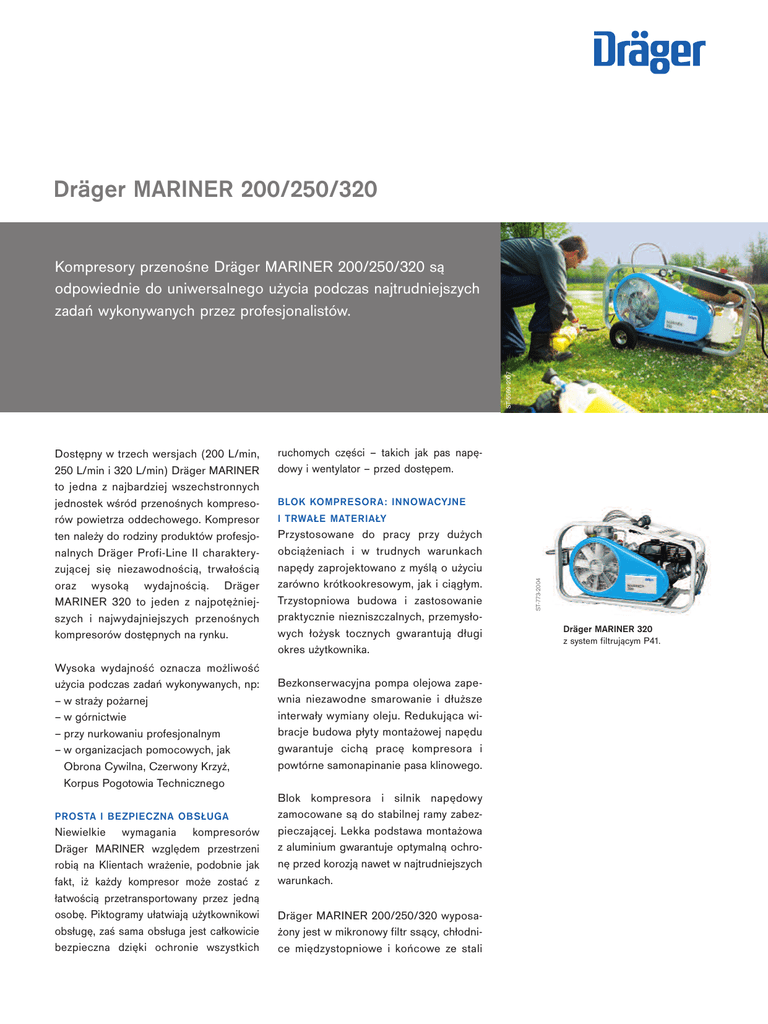 Dräger MARINER 200/250/320 ST-5569-2007 Kompresory przenośne Dräger MARINER 200/250/320 są odpowiednie do uniwersalnego użycia podczas najtrudniejszych zadań wykonywanych przez profesjonalistów. Wysoka wydajność oznacza możliwość użycia podczas zadań wykonywanych, np: – w straży pożarnej – w górnictwie – przy nurkowaniu profesjonalnym – w organizacjach pomocowych, jak Obrona Cywilna, Czerwony Krzyż, Korpus Pogotowia Technicznego PROSTA I BEZPIECZNA OBSŁUGA Niewielkie wymagania kompresorów Dräger MARINER względem przestrzeni robią na Klientach wrażenie, podobnie jak fakt, iż każdy kompresor może zostać z łatwością przetransportowany przez jedną osobę. Piktogramy ułatwiają użytkownikowi obsługę, zaś sama obsługa jest całkowicie bezpieczna dzięki ochronie wszystkich ruchomych części – takich jak pas napędowy i wentylator – przed dostępem. BLOK KOMPRESORA: INNOWACYJNE I TRWAŁE MATERIAŁY Przystosowane do pracy przy dużych obciążeniach i w trudnych warunkach napędy zaprojektowano z myślą o użyciu zarówno krótkookresowym, jak i ciągłym. Trzystopniowa budowa i zastosowanie praktycznie niezniszczalnych, przemysłowych łożysk tocznych gwarantują długi okres użytkownika. Bezkonserwacyjna pompa olejowa zapewnia niezawodne smarowanie i dłuższe interwały wymiany oleju. Redukująca wibracje budowa płyty montażowej napędu gwarantuje cichą pracę kompresora i powtórne samonapinanie pasa klinowego. Blok kompresora i silnik napędowy zamocowane są do stabilnej ramy zabezpieczającej. Lekka podstawa montażowa z aluminium gwarantuje optymalną ochronę przed korozją nawet w najtrudniejszych warunkach. Dräger MARINER 200/250/320 wyposażony jest w mikronowy filtr ssący, chłodnice międzystopniowe i końcowe ze stali ST-773-2004 Dostępny w trzech wersjach (200 L/min, 250 L/min i 320 L/min) Dräger MARINER to jedna z najbardziej wszechstronnych jednostek wśród przenośnych kompresorów powietrza oddechowego. Kompresor ten należy do rodziny produktów profesjonalnych Dräger Profi-Line II charakteryzującej się niezawodnością, trwałością oraz wysoką wydajnością. Dräger MARINER 320 to jeden z najpotężniejszych i najwydajniejszych przenośnych kompresorów dostępnych na rynku. Dräger MARINER 320 z system filtrującym P41. 02 | DRägER MARINER 200/250/320 nierdzewnej, filtr międzystopniowy i międzystopniowe zawory bezpieczeństwa. Kompresor napędzany jest pasem klinowym. Opcjonalne jednostki z napędem elektrycznym dostarczane są z okablowaniem ochrony silnika i zasilającym. Dla jednostek 230V / 50Hz i 400V / 50Hz zapewniania jest dodatkowa wtyczka. Szeroki zakres wyposażenia dodatkowego oznacza możliwość dostosowania kompresora do wymagań Klienta. Kompresory są standardowo wyposażone w jedno do czterech przyłączy napełniających. Ekonomiczną eksploatację zapewniają wkłady nowego systemu filtrującego Triplex® P21, P31 lub P41 umożliwiające użycie filtra do czasu całkowitego nasycenia. OPATENTOWANY SYSTEM FILTRUJĄCY POWIETRZA ODDECHOWEGO System filtrujący gwarantuje ultraczyste powietrze oddechowe zgodne z rygorystyczną normą powietrza oddechowego DIN EN 12021. Węże napełniające Wentylator ST-5485-2007 Rama aluminiowa Uchwyt DRägER MARINER 200/250/320 | 03 DANE TECHNICZNE Dräger MARINER 200/250/320 Ciśnienie robocze typu Napęd maks. 330 bar1) Benzynowy, czterosuwowy MARINER 200-B Trójfazowy MARINER 200-E Benzynowy, czterosuwowy MARINER 250-B Trójfazowy MARINER 250-E Benzynowy, czterosuwowy MARINER 320-B Trójfazowy MARINER 320-E 1) Jednostki można także przełączyć na PN 200 / 300 bar F.A.D. L/min 200 200 250 250 320 320 Prędkość obrot. min. -1 1450 1250 1450 1450 1450 1450 Moc kW 6.1 3.0 6.6 5.5 9.6 7.5 System filtr. TRIPLEX P21 P21 P31 P31 P31 P31 Wymiary (L x W x H) cm (przybliż.) 125 x 59 x 63 125 x 59 x 63 125 x 59 x 63 125 x 59 x 63 130 x 65 x 70 130 x 65 x 70 INFROMACJE ZAMÓWIENIOWE Dräger MARINER 200/250/320 Model MARINER 200-B MARINER 200-E MARINER 250-B MARINER 250-E MARINER 320-B MARINER 320-E PN 225 bar 65 31 119 65 31 116 65 31 113 65 31 110 65 31 107 65 31 104 PN 330 bar 65 31 120 65 31 117 65 31 114 65 31 111 65 31 108 65 31 105 PN 225/330 bar 65 31 121 65 31 118 65 31 115 65 31 112 65 31 109 65 31 106 Waga netto kg (ok.) 115 115 120 135 138 154 DRägER MARINER 200/250/320 90 46 636 | 07.09-1 | Marketing Communications | CR | PR | ED | Zastrzegamy prawo zmian! | © 2009 Dräger Safety Ag & Co. KgaA 04 | CENTRALA: Dräger Safety Ag & Co. KgaA Revalstraße 1 23560 Lübeck, Niemcy www.draeger.com PRZEDSTAWICIELSTWA: SIEDZIBA GŁÓWNA BY TOM ul. Chorzowska 25 41 – 902 Bytom Tel. 32 280 31 11 Faks 32 282 10 32 BIURO HANDLOWE K ATOWICE ul. Żelazna 1 40 – 851 Katowice Tel. 32 388 76 60 Faks 32 601 26 24 BIURO HANDLOWE RUMIA ul. grunwaldzka 22 84 – 230 Rumia Tel. 58 671 77 70 Faks 58 671 05 50 BIURO HANDLOWE WARSZAWA Al. Jerozolimskie 174 02 – 489 Warszawa Tel. 22 333 73 04 Faks 22 333 73 05 BIURO HANDLOWE GŁOGÓW Plac Konstytucji 3 Maja 1 67 – 200 głogów Tel. 76 728 63 18 Faks 76 728 63 68