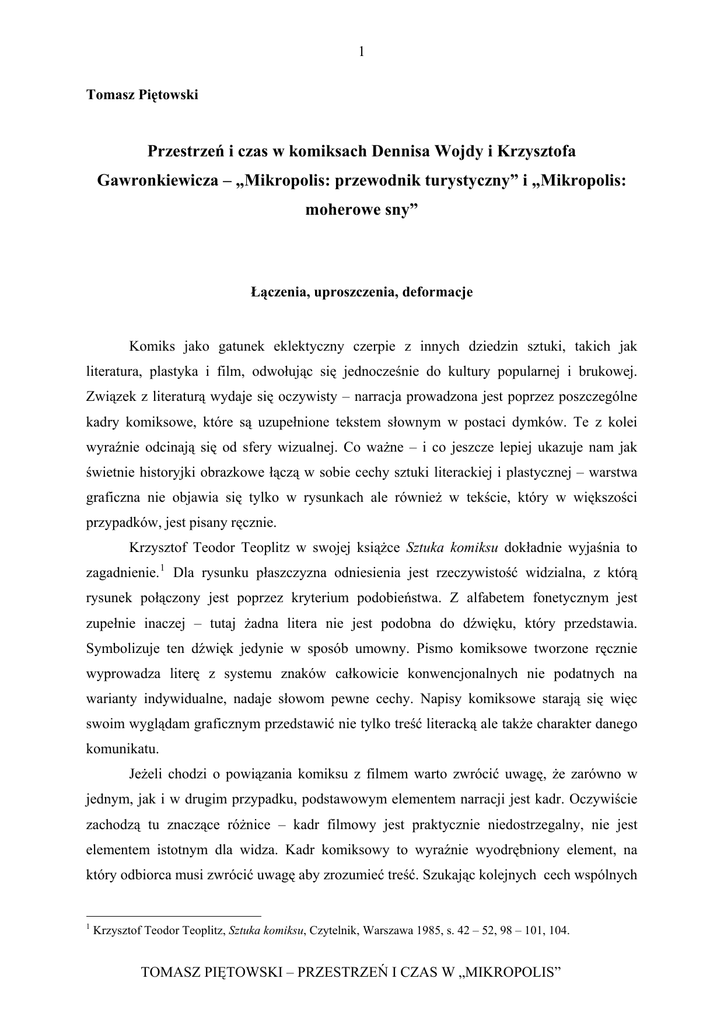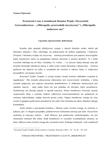 1 Tomasz Piętowski Przestrzeń i czas w komiksach Dennisa Wojdy i Krzysztofa Gawronkiewicza – „Mikropolis: przewodnik turystyczny” i „Mikropolis: moherowe sny” Łączenia, uproszczenia, deformacje Komiks jako gatunek eklektyczny czerpie z innych dziedzin sztuki, takich jak literatura, plastyka i film, odwołując się jednocześnie do kultury popularnej i brukowej. Związek z literaturą wydaje się oczywisty – narracja prowadzona jest poprzez poszczególne kadry komiksowe, które są uzupełnione tekstem słownym w postaci dymków. Te z kolei wyraźnie odcinają się od sfery wizualnej. Co ważne – i co jeszcze lepiej ukazuje nam jak świetnie historyjki obrazkowe łączą w sobie cechy sztuki literackiej i plastycznej – warstwa graficzna nie objawia się tylko w rysunkach ale również w tekście, który w większości przypadków, jest pisany ręcznie. Krzysztof Teodor Teoplitz w swojej książce Sztuka komiksu dokładnie wyjaśnia to zagadnienie. 1 Dla rysunku płaszczyzna odniesienia jest rzeczywistość widzialna, z którą rysunek połączony jest poprzez kryterium podobieństwa. Z alfabetem fonetycznym jest zupełnie inaczej – tutaj żadna litera nie jest podobna do dźwięku, który przedstawia. Symbolizuje ten dźwięk jedynie w sposób umowny. Pismo komiksowe tworzone ręcznie wyprowadza literę z systemu znaków całkowicie konwencjonalnych nie podatnych na warianty indywidualne, nadaje słowom pewne cechy. Napisy komiksowe starają się więc swoim wyglądam graficznym przedstawić nie tylko treść literacką ale także charakter danego komunikatu. Jeżeli chodzi o powiązania komiksu z filmem warto zwrócić uwagę, że zarówno w jednym, jak i w drugim przypadku, podstawowym elementem narracji jest kadr. Oczywiście zachodzą tu znaczące różnice – kadr filmowy jest praktycznie niedostrzegalny, nie jest elementem istotnym dla widza. Kadr komiksowy to wyraźnie wyodrębniony element, na który odbiorca musi zwrócić uwagę aby zrozumieć treść. Szukając kolejnych cech wspólnych 1 Krzysztof Teodor Teoplitz, Sztuka komiksu, Czytelnik, Warszawa 1985, s. 42 – 52, 98 – 101, 104. TOMASZ PIĘTOWSKI – PRZESTRZEŃ I CZAS W „MIKROPOLIS” 2 warto zauważyć wyszczególnione przez filmoznawców plany, identyczne dla tych obu dziedzin sztuki: ogólny (obraz miejsca akcji), pełny (postaci pokazane w całości, tło traci na znaczeniu), amerykański (postaci ukazane od kolan w górę), półzbliżenie (tło niemal wyeliminowane), zbliżenie (na przekład twarz), detal (na przykład oko). 2 Oczywiście mylne jest stwierdzenie, że komiks od początku swojego istnienia zaczerpnął ze sztuki filmowej onomatopeje. 3 Warto jednak zastanowić się nad przytoczonym przez Jerzego Szydłaka w książce Sztuka komiksu poglądem Maryli Hopfinger, która twierdzi, iż komiks jest dziełem ułomnie audio – wizualnym. 4 Nie trudno się domyślić na czym owa ułomność polega – pojedyncze kadry zamiast ruchomych obrazów, onomatopeje naśladujące dźwięki, dymki udające literaturę no i wreszcie rysunek będący jedynie bladym odbiciem rzeczywistości. Świat komiksowy to przestrzeń we wszystkich swych wymiarach u p r o s z c z o n a. Do jeszcze ciekawszych wniosków dojdziemy, gdy przypomnimy sobie same narodziny komiksu jako gatunku. Nazwa comic jest skrótem od angielskiego wyrażenia comic strip 5 określającego krótkie, zabawne historyjki obrazkowe drukowane w amerykańskiej prasie na początku XX wieku. Rysunek humorystyczny, który towarzyszył komiksowi, jest (co podkreśla Janusz Lalewicz w książce Przedstawianie i Znaczenie) 6 nie tylko uproszczony ale również celowo z d e f o r m o w a – ny. Komiks jest zatem gatunkiem, który łącząc w sobie inne dziedziny sztuki, upraszcza je, przekształca (tworząc na przykład onomatopeje) i deformuje zarazem. Ponadto zacierają się w nim (podobnie jak w każdej innej twórczości artystycznej) elementy rzeczywiste i irracjonalne, zarówno w sferze graficznej 7 jak i fabularnej. Mapa, rzeczywistość, historia Często mieszanie elementów realnych z nierealnymi przybiera formę gry, pewnej zabawy z czytelnikiem. We wstępie do komiksu Dennisa Wojdy i Krzysztofa 2 Jerzy Szyłak Poetyka komiksu: warstwa ikoniczna i językowa, Słowo/Obraz Terytoria, Gdańsk 2000, s. 44 – 51. Za pierwszy komiks uważa się powstałą w 1896 roku w Stanach Zjednoczonych serię „The Yellow Kid” autorstwa Richarda F. Outcaulta, pierwszy film dźwiękowy datowany jest na 1922 rok. Oczywiście w późniejszym okresie komiksowe onomatopeje wzorowały się na dźwiękach (a nawet scenach) filmowych, jednak z całą pewnością ich początków i genezy powstania nie możemy doszukiwać się na srebrnym ekranie. 4 Jerzy Szyłak, op. cit., s. 13. 5 Dosłownie: „komiczny pasek”. 6 Jerzy Szyłak, op. cit., s. 13. 7 Komiks nie może symulować rzeczywistości, gdyż przedstawia obraz uproszczony. 3 TOMASZ PIĘTOWSKI – PRZESTRZEŃ I CZAS W „MIKROPOLIS” 3 Gawronkiewicza Mikropolis: przewodnik turystyczny 8 tytułowa aglomeracja została niezwykle szczegółowo przedstawiona i opisana. Rozdział „informacje praktyczne” ma charakter broszury turystycznej. Na szczególną uwagę zwracają fakty dotyczące historii miasteczka – Mikropolis powstało 2000 lat temu. Jest to więc osada, która w jakiś sposób pamięta czasy dawne a nawet mityczne, przez co staje się wartościowsza. Komiks został wydany w 2001 r., cofając się w o dwa tysiąclecia dotrzemy do czasów Chrystusa a więc do okresu lepszego jakościowo. Inne zabiegi artystyczne służące urzeczywistnieniu fikcyjnego obszaru to na przykład podanie danych meteorologicznych: średniej temperatury rocznej, wilgotności powietrza, zachmurzenia itd., które ponadto zgadzają się mniej więcej z klimatem obszaru Europy Środkowej. Można to uznać za wskazówkę prowadzącą nas do rzeczywistej przestrzeni, która została odbita w komiksie. Poza tym, 