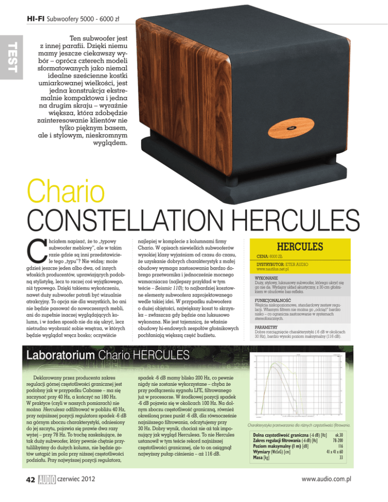 HI-FI Subwoofery 5000 - 6000 zł TEST Ten subwoofer jest z innej parafii. Dzięki niemu mamy jeszcze ciekawszy wybór – oprócz czterech modeli sformatowanych jako niemal idealne sześcienne kostki umiarkowanej wielkości, jest jedna konstrukcja ekstremalnie kompaktowa i jedna na drugim skraju – wyraźnie większa, która zdobędzie zainteresowanie klientów nie tylko pięknym basem, ale i stylowym, nieskromnym wyglądem. Chario CONSTELLATION HERCULES C hciałem napisać, że to „typowy subwoofer meblowy”, ale w takim razie gdzie są inni przedstawiciele tego „typu”? Nie widzę; może gdzieś jeszcze jeden albo dwa, od innych włoskich producentów, uprawiających podobną stylistykę, lecz to raczej coś wyjątkowego, niż typowego. Dzięki takiemu wykończeniu, nawet duży subwoofer potrafi być wizualnie atrakcyjny. To opcja nie dla wszystkich, bo ani nie będzie pasować do nowoczesnych mebli, ani do zupełnie inaczej wyglądających kolumn, i w żaden sposób nie da się ukryć, lecz nietrudno wyobrazić sobie wnętrza, w których będzie wyglądał wręcz bosko; oczywiście najlepiej w komplecie z kolumnami firmy Chario. W opisach niewielkich subwooferów wysokiej klasy wyjaśniam od czasu do czasu, że uzyskanie dobrych charakterystyk z małej obudowy wymaga zastosowania bardzo dobrego przetwornika i jednocześnie mocnego wzmacniacza (najlepszy przykład w tym teście – Seismic 110); to najbardziej kosztowne elementy subwoofera zaprojektowanego wedle takiej idei. W przypadku subwoofera o dużej objętości, największy koszt to skrzynka – zwłaszcza gdy będzie ona luksusowo wykonana. Nie jest tajemnicą, że właśnie obudowy hi-endowych zespołów głośnikowych pochłaniają większą część budżetu. HERCULES CENA: 6000 ZŁ DYSTRYBUTOR: ETER AUDIO www.nautilus.net.pl WYKONANIE Duży, stylowy, luksusowy subwoofer, którego ukryć się go nie da. Wydajny układ akustyczny, z 30-cm głośnikiem w obudowie bas-refleks. FUNKCJONALNOŚĆ Wejścia niskopoziomowe, standardowy zestaw regulacji. Własnym filtrem nie można go „odciąć” bardzo nisko – co ogranicza zastosowanie w systemach stereofonicznych. PARAMETRY Dobre rozciągnięcie charakterystyki (-6 dB w okolicach 30 Hz), bardzo wysoki poziom maksymalny (116 dB). Laboratorium Chario HERCULES Deklarowany przez producenta zakres regulacji górnej częstotliwości granicznej jest podobny jak w przypadku Cabasse – ma się zaczynać przy 40 Hz, a kończyć na 180 Hz. W praktyce (czyli w naszych pomiarach) nie można Herculesa odfiltrować w pobliżu 40 Hz, przy najniższej pozycji regulatora spadek -6 dB na górnym zboczu charakterystyki, odniesiony do jej szczytu, pojawia się prawie dwa razy wyżej – przy 78 Hz. To trochę zaskakujące, że tak duży subwoofer, który pewnie chętnie przytulilibyśmy do dużych kolumn, nie będzie gotów ustąpić im pola przy niższej częstotliwości podziału. Przy najwyższej pozycji regulatora, 42 czerwiec 2012 spadek -6 dB mamy blisko 200 Hz, co pewnie nigdy nie zostanie wykorzystane – chyba że przy podłączeniu sygnału LFE, filtrowanego już w procesorze. W środkowej pozycji spadek -6 dB pojawia się w okolicach 100 Hz. Na dolnym zboczu częstotliwość graniczną, również określoną przez punkt -6 dB, dla równocześnie najniższego filtrowania, odczytujemy przy 30 Hz. Dobry wynik, chociaż nie aż tak imponujący jak wygląd Herculesa. To nie Hercules ustanowił w tym teście rekord najniższej częstotliwości granicznej, ale to on osiągnął najwyższy pułap ciśnienia – aż 116 dB. Charakterystyka przetwarzania dla różnych częstotliwości filtrowania. Dolna częstotliwość graniczna (-6 dB) [Hz] ok.30 78-200 Zakres regulacji filtrowania (-6 dB) [Hz] Poziom maksymalny (1 m) [dB] 116 Wymiary (WxSxG) [cm] 41 x 41 x 60 Masa [kg] 33 www.audio.com.pl A teraz historii Herculesa część druga. Po wyjęciu z pudła mocno się zdziwiłem – trudno mi było uwierzyć, że ten subwoofer może występować w tej samej kategorii cenowej, co pozostałe modele tego testu. Stały sobie z boku eleganckie, ale niepozorne, wyraźnie mniejsze i lżejsze… Zamawiałem u dystrybutorów subwoofery w przedziale cenowym 5000–6000 zł, a tu takie piękne bydlę. Postanowiłem sprawdzić i okazało się, że jego oficjalna cena w Polsce to 8000 zł, tu i ówdzie można go kupić za 7000 zł, ale za granicą pojawia się nawet w cenie ponad 2000 euro! Zadzwoniłem ponownie do polskiego dystrybutora Chario, aby rzecz po męsku wyjaśnić. Dostałem przyrzeczenie, iż oficjalna, rekomendowana cena detaliczna Herculesa zostanie z dniem opublikowania tego testu obniżona do 6000 zł! W tej sytuacji trudno było mi odmówić – udział Herkulesa w teście stał się w pełni uprawniony, a ja mogę myśleć, że zrobiłem kawał dobrej roboty, bo dzięki temu testowi możecie kupować wspaniały subwoofer za okazyjną cenę! Oczywiście najpierw musi się wam spodobać… Jak w żadnym innym subwooferze tego testu, w Herculesie pracuje głośnik 12-calowy w systemie bas-refleks. Z różnorodoności tego testu wyłania się pewna prawidłowość, na którą warto zwrócić uwagę, która tłumaczy też wielkość Herculesa. Otóż idąc trochę na skróty, można stwierdzić, że od wielkości głośnika (lub zespołu głośników) zależy potencjał „maszyny” niskotonowej. Jej działanie można jeszcze dodatkowo wzmocnić pracą układu bas-refleks (lub membrany biernej), lecz dla danej wielkości przetwornika, potrzebna będzie wtedy większa obudowa. I taką zależność doskonale widzimy w całym przekroju tego testu. Najmniejszy Seismic 110 to kombinacja 10-calowego w obudowie zamkniętej, największy Hercules – 12-calowego w bas-refleksie. Subwoofery wielkością pośrednie, tworzące dość spójną grupę „kostek”, mąją albo 10-calowe w bas-refleksie (Santorin 25, R-328) lub 12-calowe w zamkniętej (RXV-12, R300B – tam dwa 8-calowe mają powierzchni