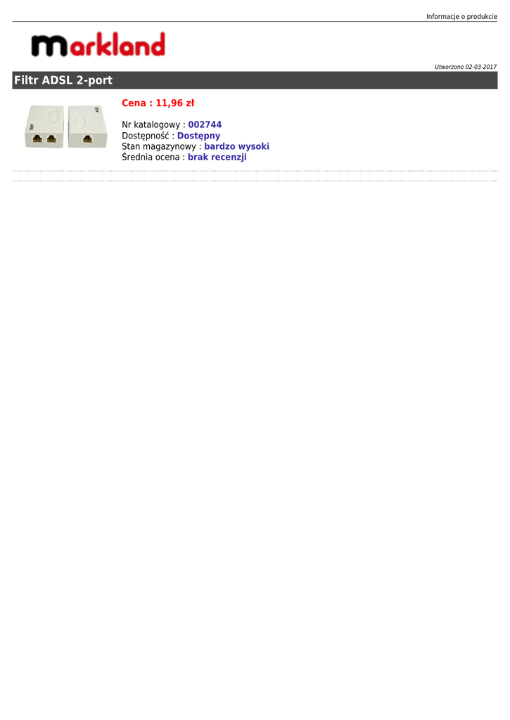 Informacje o produkcie Utworzono 02-03-2017 Filtr ADSL 2-port Cena : 11,96 zł Nr katalogowy : 002744 Dostępność : Dostępny Stan magazynowy : bardzo wysoki Średnia ocena : brak recenzji