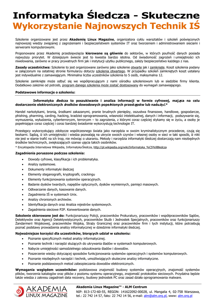 Informatyka Śledcza - Skuteczne Wykorzystanie Najnowszych Technik IŚ Szkolenie organizowane jest przez Akademię Linux Magazine, organizatora cyklu warsztatów i szkoleń poświęconych najnowszej wiedzy związanej z zagrożeniami i bezpieczeństwem systemów IT oraz tworzeniem i administrowaniem sieciami i serwerami komputerowymi. Proponowane przez Akademię przedsięwzięcia kierowane są głównie do sektorów, w których poufność danych posiada najwyższy priorytet. W dzisiejszym świecie jest to kwestia bardzo istotna. Od świadomość zagrożeń i umiejętności ich niwelowania, zarówno w pracy prywatnych firm jak i instytucji użytku publicznego, zależy bezpieczeństwo każdego z nas. Zasady uczestnictwa: Szkolenie to jest organizowane zarówno jako szkolenie otwarte jak i zamknięte. Koszt szkolenia podany w załączonym na ostatniej stronie formularzu dotyczy szkolenia otwartego. W przypadku szkoleń zamkniętych koszt ustalany jest indywidualnie z zamawiającym. Minimalna liczba uczestników szkolenia to 5 osób, maksymalna 12. Szkolenie zamknięte może odbyć się we współpracującym z nami ośrodku szkoleniowym lub w siedzibie firmy klienta. Dodatkowo zależnie od potrzeb, program danego szkolenia może zostać dostosowany do wymagań zamawiającego. Podstawowe informacje o szkoleniu: Informatyka śledcza to poszukiwanie i analiza informacji w formie cyfrowej, maj ąca na celu dostarczenie elektronicznych środków dowodowych popełnionych przestępstw lub nadużyć.* Handel narkotykami, bronią, środkami zakazanymi, pranie brudnych pieniędzy, oszustwa finansowe, handlowe, gospodarcze, phishing, pharming, carding, hacking, kradzież oprogramowania, własności intelektualnej, danych i informacji, podszywanie się, wymuszenia, wyłudzenia, cyberterroryzm, terroryzm – to zagrożenia, z którymi coraz częściej stykamy się w życiu, a osoby je popełniające coraz częściej i coraz bardziej świadomie wykorzystują technologie IT. Przestępcy wykorzystujący zdobycze współczesnego świata jako narzędzia w swoim kryminalistycznym procederze, czują się bezkarni. Sądzą, iż ich umiejętności i wiedza pozwalają na ukrycie swoich czynów i własnej osoby w sieci w taki sposób, iż nikt nie jest w stanie trafić na ich trop, nie mówiąc o ukaraniu. Metody i narzędzia informatyki śledczej dostarczają nam niezbędnych środków technicznych, zwiększających szanse ujęcia takich osobników. * Encyklopedia Internetowa Wikipedia, Informatyka Śledcza, http://pl.wikipedia.org/wiki/Informatyka_%C5%9Bledcza Zagadnienia poruszone podczas szkolenia: • Dowody cyfrowe, klasyfikacja i ich problematyka. • Analizy systemowe. • Dokumenty informatyki śledczej • Elementy steganografii, kryptografii, crackingu • Elementy funkcjonowania systemów operacyjnych. • Badanie dysków twardych, napędów optycznych, dysków wymiennych, pamięci masowych. • Odtwarzanie danych, kasowanie danych. • Zagadnienia IŚ w systemach Unix. • Analizy chronionych archiwów. • Identyfikacja danych oraz Analiza rejestrów systemowych. • Zagadnienia sieciowe P2P. Konwertowanie danych. Szkolenie skierowane jest do: Funkcjonariuszy Policji, pracowników Prokuratury, pracowników i współpracowników Sądów, Detektywów oraz Agencji Detektywistycznych, pracowników Służb i Jednostek Specjalnych, pracowników oraz funkcjonariuszy Żandarmerii Wojskowej, pracowników Wojska, Straży Granicznej oraz pracowników firm i tych instytucji, które potrzebują poznać podstawy prowadzenia analizy informatycznej w dziedzinie informatyki śledczej. Najważniejsze korzyści dla uczestników, biorących udział w szkoleniu: • Poznanie specyficznych metod analizy informatycznej. • Poznanie technik i narzędzi służących do ukrywania śladów w systemach komputerowych. • Nabycie umiejętności samodzielnego odszukiwania śladów i dowodów. • Poszerzenie wiedzy dotyczącej sposobów funkcjonowania systemów operacyjnych i systemów komputerowych. • Poznanie niezbędnych narzędzi i technik, umożliwiających skuteczne analizy informatyczne. • Poznanie podstawowych metod zabezpieczania dowodów elektronicznych. Wymagania względem uczestników: podstawowa znajomość budowy systemów operacyjnych, znajomość systemów plików, tworzenia katalogów oraz plików z poziomu systemu operacyjnego, znajomość protokołów sieciowych. Przydatna będzie także wiedza z zakresu zagadnień data recovery, budowy jednostek PC oraz zasad działa oprogramowania malware. Akademia Linux Magazine™ - ALM Centrum NIP: 813-172-60-55, REGON: 141622092-00028, ul. Mangalia 4, 02-758 Warszawa, tel.: 22 742 14 57, faks: 22 742 14 56, e-mail: [email protected], www: alm.org.pl Informatyka Śledcza - Skuteczne Wykorzystanie Najnowszych Technik IŚ Agenda - dzień pierwszy 08:20-09:50 Rejestracja 09:50-10:00 Powitanie 10:00-10:40 Wykład: Historia Informatyki Śledczej, Pojęcie Dowodu elektronicznego. Omówione zostaną pojęcia związane z zagadnieniami informatyki śledczej. Przedstawione zostaną dane dotyczące potencjalnych dowodów elektronicznych w systemach komputerowych oraz metody ich klasyfikacji i gromadzenia. 10:40-11:00 Przerwa 11:00-12:20 Wykład: Klasyfikacje i Rekonstrukcje, Odnoszenia czasowe. Analiza behawioralna. Zostaną poruszone tematy dotyczące klasyfikacji i rekonstrukcji zdarzeń oraz metody określania czasów życia informacji i danych. Przedstawimy również sposoby analiz zewidencjonowanych dowodów oraz techniki odtwarzania historii zajścia na podstawie w/w analiz. 12:20-12:40 Przerwa 12:40-13:40 Wykład: Elementy dokumentacji IŚ. Protokoły dokumentacyjne, wzory i wykorzystania. Omówimy cechy funkcjonalne podstawowych dokumentów wykorzystywanych podczas prowadzenia badań systemów komputerowych. Na zajęciach zostaną omówione wzory dokumentów, ich zastosowania i wykorzystania, potrzeby tworzenia oraz inne zagadnienia z nimi związane. 13:40-14:20 Obiad 14:2