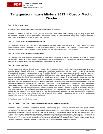 TCPDF Example 039 Richard lobo www.sudamericatour.com Targ gastronmiczny Mistura 2013 + Cusco, Machu Picchu Dzie? 1: Przylot do Limy. Przylot do Limy. Na lotnisku czeka? b?dzie na Nas ekipa przywitalna. Transfer do hotelu. W zale?no?ci od godziny przyjazdu, zwiedzanie nowoczesnej Limy, mi?dzy innymi: Park Kennedego, Calle de la Pizza, (mo?liwo?? posi?ku na trasie). Przywitalny drink: tradycyjny napój alkoholowy – Pisco Sour, w restauracji „Rustico” de la Costa Verde. Dzie? 2: Lima - Mistura (pierwszy dzie? targu). Po ?niadaniu udamy si? do Mi?dzynarodowych Targów Gastronomicznych w Limie, gdzie sp?dzimy niezapomniane chwile, odwiedzaj?c g?ówne atrakcje „Mistury 2015”: Wielk? hal? Targow?, ”Salon Pisco i kawy”, „Zak?tek Czekolady”, oprócz tego podziwia? b?dzie mo?na kolorowe parady i inne atrakcje. Dzie? 3: Lima - Mistura (drugi dzie? targów). Dzi? us?yszymy przemówienia najbardziej wp?ywowych kucharzy w Peru i na ?wiecie (zgodnie z planem prezentacji), oprócz tego doko?czymy Nasz? wizyt? na targu Mistura 2015 (jeden dzie? nie jest wystarczaj?cy, ?eby zobaczy wszystko co oferuje to miejsce). Wolny wieczór. Nocleg. Dzie? 4: Lima - City Tour. Dzisiaj zwiedzimy miasto. Przed wizyt? miasta „Tour gourmet Peru” rozda Naszym uczestnikom koszulki i fartuchy, które u?ywa? b?dziemy do gotowania. Nast?pnie, wybierzemy si? do „baru” z sokami (degustacja ró?norodnych owoców), odwiedzimy rynek Surquillo. Nasz? podró? zaczniemy w sekcji owoców: owoce z wybrze?a, gór i d?ungli: flaszowiec peruwia?ski (Chirimoyas), pacay (owoc przypominaj?cy fasolk? szparagow?), mango, marakuja, itp. Nast?pnie udamy si? do sekcji warzyw, aby zobaczy? ró?ne produkty, takie jak: papryka, grzyby (w tym odmian Porcon), ró?norodna odmiana ziemniaków. Sekcja owoców morza: Nauczymy si? odró?nia? krewetki od langusty zobaczymy wiele gatunków ryb, o?miornic? oraz wiele owoców morza z podtypu: muszlowce. Nast?pnie poznamy Lim? kolonialn? (UNESCO) i Lim? nowoczesn?, zobaczymy: plac San Martin, Plaza Mayor (plac g?ówny), pa?ac rz?dowy, ratusz, katedr? ze szcz?tkami cia?a Francisco Pizarry, katakumby San Francisco. Oprócz tego odwiedzimy „Dom peruwia?skiej kuchni”. Spacer i obiad w chi?skiej dzielnicy. Nast?pnie udamy si? do ksi?garni w celu zakupienia ksi??ek kucharskich oraz ksi??ek na temat historii Peru (zakup dla ch?tnych). Po po?udniu udamy si? do Barranco, gdzie zobaczymy most westchnie? i spróbujemy picarones (typ p?czka wyprodukowanego ze s?odkich ziemniaków - podobne do faworków) i anticuchos (szasz?yki z serc wo?owych). Transfer do hotelu. Wy?ywienie w cenie: ?niadanie, obiad. Dzie? 5: Cusco - City Tour i zwiedzanie pobliskich ruin. (Lekcja gotowania) ?niadanie, wolny poranek. Zwiedzanie Cusco. Odwiedzimy plac g?ówny, katedr? oraz ?wi?tyni? S?o?ca Korikancha. Wizyta rynku z zio?ami leczniczymi, aromatycznymi, owocami, kaw?, grzybami. Obiad w tradycyjnej restauracji w mie?cie. Wyjazd z miasta, zwiedzanie skalnego sanktuarium Inków Kenko, Tambomachay, Puca Pucara i imponuj?cej fortecy Sacsayhuaman, wybudowanej w strategicznym miejscu, na wzgórzu z widokiem na Cusco, s?yn?c? z ogromnych kamieni rze?bionych ze zdumiewaj?c? precyzj?, tworz?cych ?ciany zewn?trzne. Cz??? z nich osi?ga ponad 9 metrów wysoko?ci i wa?y ponad 350 ton. Powrót do hotelu. page 1 / 3 TCPDF Example 039 Richard lobo www.sudamericatour.com Wy?ywienie w cenie: ?niadanie Dzie? 6: Cusco - Ollantaytambo - Valle Sagrado. Zaczynamy wycieczk? do ?wi?tej Dolinie Inków, gdzie b?dziemy mieli okazj? zobaczy? typowe tarasy Inków i wsie, takie jak Pisac (kolorowe rynki india?skie), Calca, Yucay, Urubamba. Obiad. W godzinach popo?udniowych, zwiedzanie Ollantaytambo, ogromnego kompleksu Inkaskiego, który pe?ni funkcje administracyjne, rolnicze i religijne. Zobaczymy wspania?e skalne ?ciany, ?wi?tynie i pa?ace. Przejazd do hotelu. Nocleg w ?wi?tej Dolinie Inków. Wy?ywienie w cenie: ?niadanie Dzie? 7: Przejazd poci?giem z Valle Sagrado do Machu Picchu. Podró? do miasta Aguas Calientes, po?o?onego u stóp Machu Picchu, odkrytego w 1911 roku przez ameryka?skiego badacza Hirama Binghama. Przyjazd. Po przyje?dzie do Aguas Calientes, pod??ymy autobusem (ok. 25 min), zygzakowat? drog? w kierunku " Zaginionego Miasta Inków, jednego z nowych 7 cudów ?wiata". Spacer po ruinach - oko?o 3 godziny. Nasz przewodnik wyja?ni Pa?stwu zaskakuj?cy stopie? technologii osi?gni?tej przez konstruktorów tej niesamowitej budowli oraz precyzj? w rozk?adzie jej ogromnych kamiennych konstrukcji. Kana?y wodne ujawniaj? g??bok? wiedz? na temat hydrauliki. Intihuatana „najwy?szy punkt po?o?enia S?o?ca", s?u?y? jako kalendarz s?oneczny, regulowa? okres sadzenia i zbiorów, udowadnia Nam g??bok? wiedz? i zaawansowanie technologiczne imperium. Wszystkie te budynki, wraz z ?wi?tyni? S?o?ca, laTumba Real, la Casa del Sacredote, k?pieliskiem Inków i ?wi?tyni? Tres Ventanas, pozwalaj? Nam si? cofn?? w czasie. Przy pomocy naszego przewodnika prze?yjemy niezapomnian? przygod?. Nocleg w Aguas Calientes. Wy?ywienie w cenie: ?niadanie. Dzie? 8: Machu Picchu - Cusco. ?niadanie. Znakomita okazja, aby wsta? wcze?nie i cieszy? si? pi?knym wschodem s?o?ca, a tak?e wybra? si? na spacer po mie?cie Aguas Calientes. Czas wolny na realizacj?: Trekkingu do wodospadów Mandor. Spacer do Mandor poch?ania ok 1,5h (4 km) na p?askiej trasie, wzd?u? torów kolejowych, równolegle do rzeki Vilcanota. Po drodze mo?na obserwowa? uprawy: kawy, papai, bananów, awokado i zió?. Wodospad ma 20 metrów. Nocleg w Cusco. Dzie? 9: Cusco. Czas wolny . Odpoczynek lub zwiedzanie. Dzie? 10: Cusco - Lima. ?niadanie w hotelu, transfer na lotnisko, przelot do Limy. Mi?dzynarodowy lot. Powrót do domu. Wy?ywienie w cenie: ?niadanie. Hotele: LIMA http://www.casa-andina.com/classic-miraflores-centro/ CUSCO http://www.hotelprismacusco.com/ page 2 / 3 TCPDF Example 039 Richard lobo www.sudamericatour.com OLLANTAYTAMBO http://www.ollantaytambolodge.com/ AGUAS CALIENTES http://www.inka