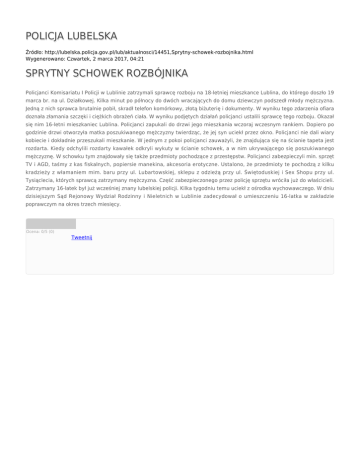 POLICJA LUBELSKA Źródło: http://lubelska.policja.gov.pl/lub/aktualnosci/14451,Sprytny-schowek-rozbojnika.html Wygenerowano: Czwartek, 2 marca 2017, 04:21 SPRYTNY SCHOWEK ROZBÓJNIKA Policjanci Komisariatu I Policji w Lublinie zatrzymali sprawcę rozboju na 18-letniej mieszkance Lublina, do którego doszło 19 marca br. na ul. Działkowej. Kilka minut po północy do dwóch wracających do domu dziewczyn podszedł młody mężczyzna. Jedną z nich sprawca brutalnie pobił, skradł telefon komórkowy, złotą biżuterię i dokumenty. W wyniku tego zdarzenia ofiara doznała złamania szczęki i ciężkich obrażeń ciała. W wyniku podjętych działań policjanci ustalili sprawcę tego rozboju. Okazał się nim 16-letni mieszkaniec Lublina. Policjanci zapukali do drzwi jego mieszkania wczoraj wczesnym rankiem. Dopiero po godzinie drzwi otworzyła matka poszukiwanego mężczyzny twierdząc, że jej syn uciekł przez okno. Policjanci nie dali wiary kobiecie i dokładnie przeszukali mieszkanie. W jednym z pokoi policjanci zauważyli, że znajdująca się na ścianie tapeta jest rozdarta. Kiedy odchylili rozdarty kawałek odkryli wykuty w ścianie schowek, a w nim ukrywającego się poszukiwanego mężczyznę. W schowku tym znajdowały się także przedmioty pochodzące z przestępstw. Policjanci zabezpieczyli min. sprzęt TV i AGD, taśmy z kas fiskalnych, popiersie manekina, akcesoria erotyczne. Ustalono, że przedmioty te pochodzą z kilku kradzieży z włamaniem mim. baru przy ul. Lubartowskiej, sklepu z odzieżą przy ul. Świętoduskiej i Sex Shopu przy ul. Tysiąclecia, których sprawcą zatrzymany mężczyzna. Część zabezpieczonego przez policję sprzętu wróciła już do właścicieli. Zatrzymany 16-latek był już wcześniej znany lubelskiej policji. Kilka tygodniu temu uciekł z ośrodka wychowawczego. W dniu dzisiejszym Sąd Rejonowy Wydział Rodzinny i Nieletnich w Lublinie zadecydował o umieszczeniu 16-latka w zakładzie poprawczym na okres trzech miesięcy. Ocena: 0/5 (0) Tweetnij