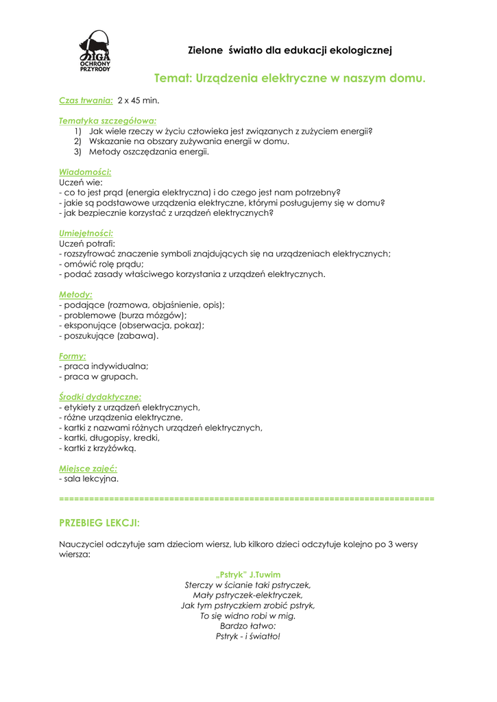 Zielone światło dla edukacji ekologicznej Temat: Urządzenia elektryczne w naszym domu. Czas trwania: 2 x 45 min. Tematyka szczegółowa: 1) Jak wiele rzeczy w życiu człowieka jest związanych z zużyciem energii? 2) Wskazanie na obszary zużywania energii w domu. 3) Metody oszczędzania energii. Wiadomości: Uczeń wie: - co to jest prąd (energia elektryczna) i do czego jest nam potrzebny? - jakie są podstawowe urządzenia elektryczne, którymi posługujemy się w domu? - jak bezpiecznie korzystać z urządzeń elektrycznych? Umiejętności: Uczeń potrafi: - rozszyfrować znaczenie symboli znajdujących się na urządzeniach elektrycznych; - omówić rolę prądu; - podać zasady właściwego korzystania z urządzeń elektrycznych. Metody: - podające (rozmowa, objaśnienie, opis); - problemowe (burza mózgów); - eksponujące (obserwacja, pokaz); - poszukujące (zabawa). Formy: - praca indywidualna; - praca w grupach. Środki dydaktyczne: - etykiety z urządzeń elektrycznych, - różne urządzenia elektryczne, - kartki z nazwami różnych urządzeń elektrycznych, - kartki, długopisy, kredki, - kartki z krzyżówką. Miejsce zajęć: - sala lekcyjna. =========================================================================== PRZEBIEG LEKCJI: Nauczyciel odczytuje sam dzieciom wiersz, lub kilkoro dzieci odczytuje kolejno po 3 wersy wiersza: „Pstryk” J.Tuwim Sterczy w ścianie taki pstryczek, Mały pstryczek-elektryczek, Jak tym pstryczkiem zrobić pstryk, To się widno robi w mig. Bardzo łatwo: Pstryk - i światło! Pstryknąć potem jeszcze raz, Zaraz mrok otoczy nas. A jak pstryknąć trzeci razZnowu dawny świeci blask. Taką siłę ma tajemną Ten ukryty w ścianie smyk! Ciemno - widno Widno - ciemno. Któż to jest ten mały pstryk? Może świetlik? Może ognik? Jak tam dostał się i skąd? To nie ognik. To przewodnik. Taki drut, a w drucie PRĄD. Robisz pstryk i włączasz PRĄD! Elektryczny bystry PRRRRĄD! I stąd światło? Właśnie stąd! Co to jest prąd- energia elektryczna? Nauczyciel po wysłuchaniu odpowiedzi uczniów może podać definicje prądu: Prąd elektryczny –jest ruchem cząstek obdarzonych ładunkiem elektrycznym, zwanych nośnikami ładunku. Prąd elektryczny posiada energię, którą przekazuje odbiornikowi wykonującemu pracę lub zmieniającemu ją na inną formę energii. Nazwa popularna energii elektrycznej to prąd. Zagadki o urządzeniach elektrycznych ,,To urządzenie jest takie gorące, jakby było nagrzane letnim słońcem, po jego użyciu Twoje ubrania są już gotowe do nakładania!” (żelazko) ,,Dużo brudnych ubrań, trochę wody, prądu i proszku odrobina, a w maszynie tej wielka magia się zaczyna.” (pralka) ,,W nim możesz, gdy ekranem swym zaświeci, obejrzeć program najlepiej dla dzieci” (telewizor) ,,Gdy chcesz piękną fryzurę mieć, Włosy umyj, a następnie szybko wysusz nią je” (suszarka) ,,Gorące kanapki – ale afera! Ukrój chlebek i szybciutko do …….” (tostera) Przeznaczenie urządzeń elektrycznych – do czego potrzebny jest prąd? Na tablicy umieszczone są napisy: 1.Urządzenia do przygotowywania lub przechowywania żywności 2.Urządzenia do utrzymywania czystości 3.Urządzenia służące do nauki, relaksu i rozrywki 4.Inne urządzenia elektryczne Uczniowie losują kolejno karteczki z nazwami różnorodnych urządzeń elektrycznych i muszą umieścić je obok opisu jego przeznaczenia np. Ad.1 czajnik elektryczny, ekspres do kawy, frytkownica, gofrownica, kuchenka mikrofalowa, mikser, lodówka, toster, Ad.2 odkurzacz, pralka, żelazko, zmywarka do naczyń, Ad.3 telewizor, komputer, radio, DVD, Ad.4 maszyna do szycia, wiertarka elektryczna itd. Rozszyfrowywanie symboli na urządzeniach elektrycznych. Nauczyciel pokazuje uczniom różne etykiety z urządzeń elektrycznych, a następnie wspólnie z uczniami ustala ich znaczenie. CE- obecnie na każdym sprzęcie elektrycznym dopuszczonym do stosowania na obszarze UE musi znajdować się ten symbol, oznacza że to urządzenie jest przetestowane i bezpieczne (zgodność z wymaganiami dyrektywy WE). Symbole A++ ,A+, A, B, C, D, E, E, F, G – oznaczają poziom zużycia energii elektrycznej podczas użycia danego urządzenia (A++ - najmniejsze zużycie energii elektrycznej, Gnajwiększe zużycie energii elektrycznej). symbol wskazujący na selektywne zbieranie sprzętu elektrycznego i elektronicznego. Na sprzęcie powinny także znaleźć się następujące informacje: - nazwa, znak fabryczny lub znak identyfikacyjny producenta lub importera, - oznaczenie modelu lub typu sprzętu, - dane techniczne np. zakres napięcia. Nauczyciel podkreśla, że do każdego sprzętu powinna być dołączona koniecznie w języku polskim instrukcja montażu, obsługi, mycia i konserwacji. Powinny być również podane szczegółowe ostrzeżenia i uwagi dotyczące bezpiecznego posługiwania się sprzętem i wskazane zagrożenia, które mogłyby zaistnieć w przypadku nieprzestrzegania podanych zasad, oraz wskazówki dotyczące usuwania opakowania i zużytego urządzenia. Ćwiczenia teoretyczne – zasady bezpiecznego korzystania z urządzeń elektrycznych. Nauczyciel przekazuje uczniom lub demonstruje właściwe posługiwanie się urządzeniami elektrycznymi: - nigdy samodzielnie dzieci nie powinny naprawiać urządzeń elektrycznych, - żarówkę mogą zmieniać jedynie dorośli i dopiero po odłączeniu prądu, - nie należy dotykać mokrymi rękami urządzeń zasilanych prądem, - kąpiąc się w wannie nie można używać suszarki do włosów, lokówki lub innych urządzeń elektrycznych, - należy chronić urządzenia elektryczne przed wilgocią lub zalaniem, - wychodząc z domu nie można zostawiać bez nadzoru włączonych urządzeń elektrycznych, - podczas burzy i dłuższych wyjazdów należy wyłączać urządzenie z gniazdek, - nie należy ciągnąć za przewód elektryczny przy wyłączaniu z prądu, - nie należy manipulować przy gniazdkach elektrycznych. 