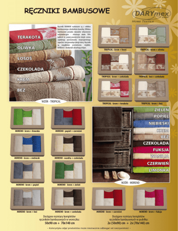 RĘCZNIKI BAMBUSOWE Ręczniki BAMBOO wykonane są z włókna bambusowego z dodatkiem bawełny. Włókno bambusowe posiada naturalne właściwości antybakteryjne - eliminuje około 70% bakterii ze swojej powierzchni dzięki czemu zapobiega powstawaniu nieprzyjemnego zapachu i nie powoduje alergii skóry. Ręczniki są wyjątkowo przewiewne, miękkie, delikatne i doskonale absorbują wilgoć. WZÓR - TROPICAL MORENO - krem + limonka MORENO - popiel + czerwień MORENO - krem + niebieski MORENO - wanilia + czekolada MORENO - krem + popiel MORENO - krem + zieleń MORENO - krem + beż MORENO - krem + czekolada Dostępne rozmiary kompletów ręczników bambusowych w woreczku: 50x90 cm + 70x140 cm TROPICAL - krem + łosoś TROPICAL - krem + oliwka TROPICAL - krem + czekolada TROPICAL - beż + czekolada TROPICAL - krem + terakota TROPICAL - krem + beż WZÓR - MORENO MORENO - krem + czerwień MORENO - krem + fuksja Dostępne rozmiary kompletów ręczników bambusowych w pudełku: 2x (50x90) cm + 2x (70x140) cm Kolorystyka zdjêæ produktów mo¿e nieznacznie odbiegaæ od rzeczywistości RĘCZNIKI BAWEŁNIANE LAMIA - czekolada LAMIA - zieleń LAMIA - niebieski LAMIA - ecru WZÓR - LAMIA SIMBA - biały SIMBA - róż SIMBA - czerwień SIMBA - fiolet WZÓR - SIMBA Dostępne rozmiary ręczników bawełnianych w woreczku: 3x (50x90) cm · 3x (70x140) cm Dostępne rozmiary kompletów ręczników bawełnianych w pudełku: 1x (50x90) cm + 1x (70x140) cm „DARYMEX D. Gruca i R. Rączka” Spółka Jawna ul. Siedliska 124, 32-620 Brzeszcze tel.: 32/ 211 17 77 fax: 32/ 212 17 05 e-mail: [email protected] www.darymex.com Kolorystyka zdjêæ produktów mo¿e nieznacznie odbiegaæ od rzeczywistości