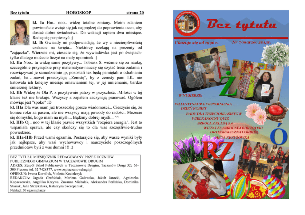 Bez tytułu HOROSKOP strona 20 kl. Ia Hm.. noo.. widzę totalne zmiany. Moim zdaniem powinniście wziąć się jak najprędzej do poprawienia ocen, aby dostać dobre świadectwa. Do wakacji raptem dwa miesiące. Radzę się pospieszyć ;) kl. Ib Gwiazdy mi podpowiadają, że wy z niecierpliwością czekacie na święta... Niektórzy czekają na prezenty od "zajączka". Wierzcie mi, cieszcie się, że wywiadówka jest po świętachtylko dlatego możecie liczyć na mały upominek :) kl. IIa Noo.. tu widzę same pozytywy... Tobiasz S. weźmie się za naukę, szczególnie przysiądzie przy matematyce-nauczy się czytać treść zadania i rozwiązywać je samodzielnie ;p, pozostali tez będą pamiętali o odrabianiu zadań, ba….nawet przeczytają „Zemstę”, by z zemsty pani I.K. nie katowała ich kolejny miesiąc omawianiem tej, w jej mniemaniu, bardzo śmiesznej lektury. kl. IIb Widzę że Ola P. z pozytywnie patrzy w przyszłość. .Miłości w tej klasie też nie brakuje. Wszyscy z zapałem zaczynają pracować. Ogółem mówiąc jest "spoko" :D kl. IIIa Dla was mam już troszeczkę gorsze wiadomości... Cieszycie się, że koniec roku za pasem, ale nie wszyscy mają powody do radości. Możecie się domyślić, kogo mam na myśli... Bądźmy dobrej myśli... ^^ kl. IIIb Oj.. noo w tej klasie prawie wszystkich "rozpiera energia". Jest to wspaniała sprawa, ale czy skończy się to dla was szczęśliwie-trudno powiedzieć. kl. IIIa-IIIb Przed wami egzamin. Postarajcie się, aby wasze wyniki były jak najlepsze, aby wasi wychowawcy i nauczyciele poszczególnych przedmiotów byli z was dumni !!! ;) BEZ TYTUŁU MIESIĘCZNIK REDAGOWANY PRZEZ UCZNIÓW PUBLICZNEGO GIMNAZJUM W TACZANOWIE DRUGIM ADRES: Zespół Szkół Publicznych w Taczanowie Drugim, Taczanów Drugi 32c 63300 Pleszew tel. 62 7428377, www.zsptaczanowdrugi.pl OPIEKUN: Iwona Korniluk, Violetta Kozielczyk REDAKCJA: Jagoda Chróściak, Marlena Galewska, Jakub Jarocki, Agnieszka Kopaczewska, Angelika Krzywa, Zuzanna Michalak, Aleksandra Perlińska, Dominika Stasiak, Julia Strzykalska, Katarzyna Szczepaniak, Nakład: 50 egzemplarzy Bez tytułu SUPER KONKURS strona 2 Oto kolejna edycja SUPER EXTRA FAJNEGO i specjalnego konkursu dla czytelników „Bez tytułu”. By wziąć udział w konkursie wystarczy: Zdobyć naszą gazetkę Bez tytułu. Otworzyć gazetkę na stronie z tym konkursem. Zobaczyć, co kryje się w zawiniątku na tej stronie. Jeżeli znalazłeś kupon z smutną buźką, to po prostu fart tym razem Ci nie dopisał. Jeśli jednak znalazłeś, np. napis: ”LIZAK”, „GUMA”, to oznacza, że wygrałeś fajny prezencik. Nagrodami będą m.in.. guma do żucia, lizak lub jakiś sprzęcik przydatny w szkole, np.: długopis, ołówek, zeszyt, cyrkiel. Jeżeli już wygrałeś, po odbiór nagrody musisz zgłosić się wraz ze swoją gazetką i oryginalnym kuponem do opiekunki gazetki pani I. Korniluk, wtedy otrzymasz wygraną przez siebie nagrodę. Sprawdź sam: Bez tytułu LUDZIE LISTY PISZA strona 19 Kochana Redakcjo! Zbliża się wiosna i te wszystkie bzdetne ,,amory”... A ja po prostu nie mogę wytrzymać, jak widzę jakąś ,,mizdrzącą” się parę na ławce, po prostu mnie mdli! Oczywiście jakbym był starszy (jestem w pierwszej gimnazjum), to bym rzucił jakiś tekst i ich speszył, a na razie nie chcę ryzykować poturbowaniem. Próbowałem wszystkiego: zamykałem oczy, uciekałem, obgadywałem ich... i nic nie działa! Co ja mam zrobić? Janek Odpowiedź: A próbowałeś znaleźć sobie dziewczynę i dołączyć się do tamtej pary tylko na innej ławce!? Janku, uwierz mi, SPRÓBUJ SZCZĘŚCIA I OTWÓRZ KARTECZKĘ !!! to najlepszy sposób, choć wiem, że najtrudniejszy. Kiedyś Jeśli nie udało Ci się za pierwszym razem, spróbuj jeszcze raz! też nie mogłam patrzeć na takie pary, aż nie dostałam strzałą od Amora. Wtedy zrozumiałam te pary! I Tobie radzę to samo: nastaw się na strzał Amora i nie zrzędź więcej! Redakcja Bez tytułu DZIEŃ WAGAROWICZA - SONDA strona 18 Spytaliśmy uczniów klas drugich co sądzą o dniu wagarowicza i jak według nich powinien wyglądać ten dzień w naszej szkole. Michał Augustyniak: Dzień wagarowicza to najlepszy dzień w roku szkolnym, ale sądzę, że nikt nie pójdzie na wagary, ponieważ nauczyciele są zbyt poważni. Tobiasz Sibiński: Dzień wagarowicza jest jednym z najlepszych dni w roku szkolnym. Tylko najgorsze jest to, że wcale nie można iść na te wagary, a jeżeli się pójdzie, to ma się nieprzyjemności w szkole. Jagoda Hadrych: Dzień wagarowicza uznaję za najlepszy dzień, w którym nie ma lekcji i są różne zabawy związane z tym dniem. Angelika Krzywa: Dzień wagarowicza kojarzy mi się oczywiście z ucieczką z lekcji. Fajnie gdyby były zorganizowane różne konkursy, aby nie było w tym dniu lekcji. Marta Majchrzak: W dzień wagarowicza powinny być jakieś konkursy i ogólnie luźne lekcje ;) Krzysztof Czajka: Stwierdzam, iż jest to fajne iść na wagary, ale i tak z tego nie skorzystam. Robert Szaranek: W tym dniu nie powinno być kartkówek, sprawdzianów i nie powinniśmy być pytani. Marek Gajda: Moim zdaniem w dzień wagarowicza nie powinno być lekcji. Dawid Ryfa: W dzień wagarowicza nie powinno być żadnych zajęć lekcyjnych, zamiast nich powinny być jakieś konkursy. Julia Kois: Moim zdaniem w dzień wagarowicza powinny być luźne lekcje, nie powinniśmy być pytani i w ogóle ;D Hubert Tanaś: W dzień wagarowicza powinny być skrócone lekcje. Dawid Kropka: W tym dniu uczniowie powinni mieć lekcje skrócone, bez sprawdzianów, kartkówek czy pytań. Nie powinniśmy w ogólne przynosić książek i zeszytów. Wagary rulez. Bez tytułu WALENTYNKOWE WSPOMNIENIA strona 3 Zapewne pamiętacie, że redaktorzy gazetki zaproponowali swoim czytelnikom walentynkowy konkurs. Na tytułowej stronie było przylepione serduszko z numerem. Zadaniem czytelników było znaleźć swoją połówkę, czyli osobę, która ma gazetkę, a