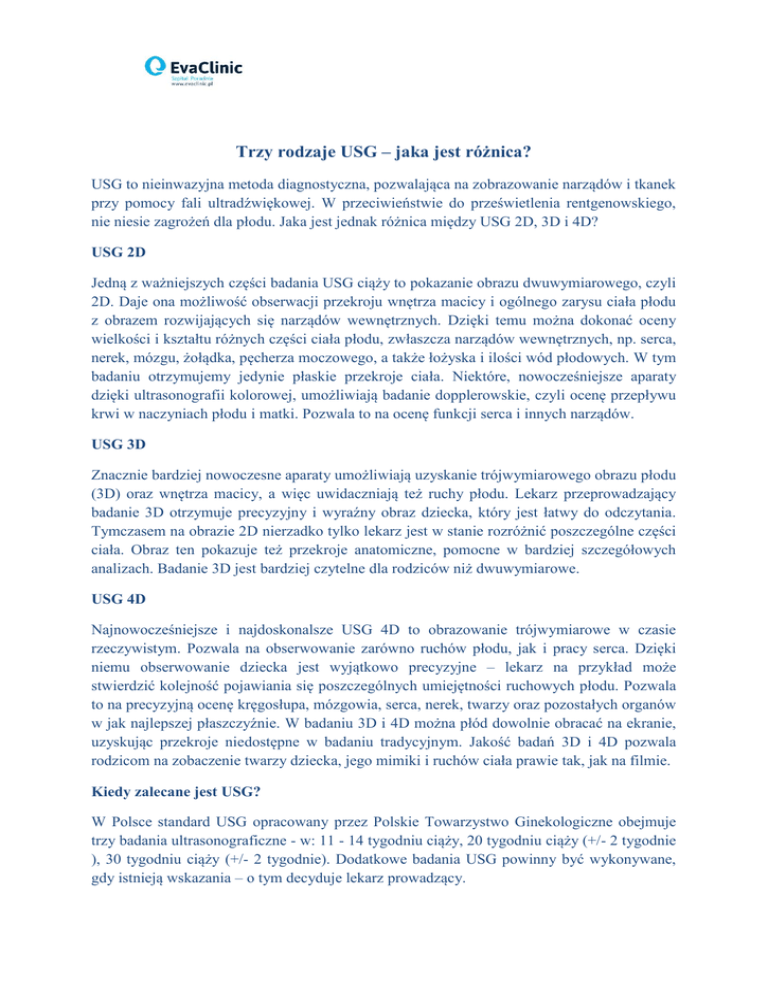 Trzy rodzaje USG – jaka jest różnica? USG to nieinwazyjna metoda diagnostyczna, pozwalająca na zobrazowanie narządów i tkanek przy pomocy fali ultradźwiękowej. W przeciwieństwie do prześwietlenia rentgenowskiego, nie niesie zagrożeń dla płodu. Jaka jest jednak różnica między USG 2D, 3D i 4D? USG 2D Jedną z ważniejszych części badania USG ciąży to pokazanie obrazu dwuwymiarowego, czyli 2D. Daje ona możliwość obserwacji przekroju wnętrza macicy i ogólnego zarysu ciała płodu z obrazem rozwijających się narządów wewnętrznych. Dzięki temu można dokonać oceny wielkości i kształtu różnych części ciała płodu, zwłaszcza narządów wewnętrznych, np. serca, nerek, mózgu, żołądka, pęcherza moczowego, a także łożyska i ilości wód płodowych. W tym badaniu otrzymujemy jedynie płaskie przekroje ciała. Niektóre, nowocześniejsze aparaty dzięki ultrasonografii kolorowej, umożliwiają badanie dopplerowskie, czyli ocenę przepływu krwi w naczyniach płodu i matki. Pozwala to na ocenę funkcji serca i innych narządów. USG 3D Znacznie bardziej nowoczesne aparaty umożliwiają uzyskanie trójwymiarowego obrazu płodu (3D) oraz wnętrza macicy, a więc uwidaczniają też ruchy płodu. Lekarz przeprowadzający badanie 3D otrzymuje precyzyjny i wyraźny obraz dziecka, który jest łatwy do odczytania. Tymczasem na obrazie 2D nierzadko tylko lekarz jest w stanie rozróżnić poszczególne części ciała. Obraz ten pokazuje też przekroje anatomiczne, pomocne w bardziej szczegółowych analizach. Badanie 3D jest bardziej czytelne dla rodziców niż dwuwymiarowe. USG 4D Najnowocześniejsze i najdoskonalsze USG 4D to obrazowanie trójwymiarowe w czasie rzeczywistym. Pozwala na obserwowanie zarówno ruchów płodu, jak i pracy serca. Dzięki niemu obserwowanie dziecka jest wyjątkowo precyzyjne – lekarz na przykład może stwierdzić kolejność pojawiania się poszczególnych umiejętności ruchowych płodu. Pozwala to na precyzyjną ocenę kręgosłupa, mózgowia, serca, nerek, twarzy oraz pozostałych organów w jak najlepszej płaszczyźnie. W badaniu 3D i 4D można płód dowolnie obracać na ekranie, uzyskując przekroje niedostępne w badaniu tradycyjnym. Jakość badań 3D i 4D pozwala rodzicom na zobaczenie twarzy dziecka, jego mimiki i ruchów ciała prawie tak, jak na filmie. Kiedy zalecane jest USG? W Polsce standard USG opracowany przez Polskie Towarzystwo Ginekologiczne obejmuje trzy badania ultrasonograficzne - w: 11 - 14 tygodniu ciąży, 20 tygodniu ciąży (+/- 2 tygodnie ), 30 tygodniu ciąży (+/- 2 tygodnie). Dodatkowe badania USG powinny być wykonywane, gdy istnieją wskazania – o tym decyduje lekarz prowadzący.