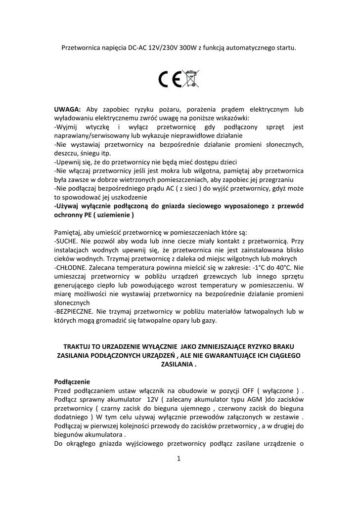 Przetwornica napięcia DC-AC 12V/230V 300W z funkcją automatycznego startu. UWAGA: Aby zapobiec ryzyku pożaru, porażenia prądem elektrycznym lub wyładowaniu elektrycznemu zwróć uwagę na poniższe wskazówki: -Wyjmij wtyczkę i wyłącz przetwornicę gdy podłączony sprzęt jest naprawiany/serwisowany lub wykazuje nieprawidłowe działanie -Nie wystawiaj przetwornicy na bezpośrednie działanie promieni słonecznych, deszczu, śniegu itp. -Upewnij się, że do przetwornicy nie będą mieć dostępu dzieci -Nie włączaj przetwornicy jeśli jest mokra lub wilgotna, pamiętaj aby przetwornica była zawsze w dobrze wietrzonych pomieszczeniach, aby zapobiec jej przegrzaniu -Nie podłączaj bezpośredniego prądu AC ( z sieci ) do wyjść przetwornicy, gdyż może to spowodować jej uszkodzenie -Używaj wyłącznie podłączoną do gniazda sieciowego wyposażonego z przewód ochronny PE ( uziemienie ) Pamiętaj, aby umieścić przetwornicę w pomieszczeniach które są: -SUCHE. Nie pozwól aby woda lub inne ciecze miały kontakt z przetwornicą. Przy instalacjach wodnych upewnij się, że przetwornica nie jest zainstalowana blisko cieków wodnych. Trzymaj przetwornicę z daleka od miejsc wilgotnych lub mokrych -CHŁODNE. Zalecana temperatura powinna mieścić się w zakresie: -1°C do 40°C. Nie umieszczaj przetwornicy w pobliżu urządzeń grzewczych lub innego sprzętu generującego ciepło lub powodującego wzrost temperatury w pomieszczeniu. W miarę możliwości nie wystawiaj przetwornicy na bezpośrednie działanie promieni słonecznych -BEZPIECZNE. Nie trzymaj przetwornicy w pobliżu materiałów łatwopalnych lub w których mogą gromadzić się łatwopalne opary lub gazy. TRAKTUJ TO URZADZENIE WYŁĄCZNIE JAKO ZMNIEJSZAJĄCE RYZYKO BRAKU ZASILANIA PODŁĄCZONYCH URZĄDZEŃ , ALE NIE GWARANTUJĄCE ICH CIĄGŁEGO ZASILANIA . Podłączenie Przed podłączaniem ustaw włącznik na obudowie w pozycji OFF ( wyłączone ) . Podłącz sprawny akumulator 12V ( zalecany akumulator typu AGM )do zacisków przetwornicy ( czarny zacisk do bieguna ujemnego , czerwony zacisk do bieguna dodatniego ) W tym celu używaj wyłącznie przewodów załączonych w zestawie . Podłączaj w pierwszej kolejności przewody do zacisków przetwornicy , a w drugiej do biegunów akumulatora . Do okrągłego gniazda wyjściowego przetwornicy podłącz zasilane urządzenie o 1 poborze mocy nie większym niż 300W . Suma mocy podłączonych urządzeń nie może przekraczać 300W . Podłącz wtyczkę sieciową przetwornicy do gniazda 230V z biegunem ochronnym. Ustaw włącznik na obudowie przetwornicy w pozycji ON ( włączona ) . Zasada działania W przypadku zaniku napięcia 230V w sieci domowej, przetwornica załączy się automatycznie (zapalenie zielonej kontrolki) i będzie przekazywać na gniazda wyjściowe przetworzone napięcie 230V z podłączonego akumulatora 12V . Powrót napięcia w sieci spowoduje przełączenie odbiorników na pracę sieciową. W modelach z dwoma gniazdami wyjściowymi (opcja) dodatkowe płaskie gniazdo wyjściowe 230V jest aktywowane wyłącznie na pracy awaryjnej (z akumulatora) , funkcja przydatna do uruchamiania oświetlenia awaryjnego. UWAGA!!! Przetwornica generuje napięcie potencjalnie niebezpieczne dla zdrowia i życia ludzi oraz zwierząt. Przetwornica powinna być podłączona do akumulatora przy normalnym wyjściowym napięciu 12-13V. Przy podłączonym głównym źródle zasilania, a pomimo przełącznikach na pozycji OFF i wyłączonych kontrolkach , na wyjściu przetwornicy nadal znajduje się prąd elektryczny, zachowaj szczególną ostrożność ,aby zapobiec porażeniu. Informacje dodatkowe Sygnał dźwiękowy oraz czerwona kontrolka oznacza zbyt slaby akumulator ( mniej niż 10,5V ) Przed podłączeniem odbiorników upewnij się , że napięcie generowane przez przetwornicę jest zgodne z parametrami zasilanego urządzenia . Utylizacja Stary sprzęt elektryczny podlega recyclingowi. Nie wyrzucaj go tam gdzie odpady przemysłowe. Oddaj sprzęt do oznaczonego punktu utylizacji. Opakowanie wyrzuć oddzielnie do odpadów papierowych, a folię do odpowiedniego punktu utylizacji. Ostrzeżenia Przeciążenie układu przetwornicy , szczególnie w trybie BYPASS ( podczas pracy na napięciu sieciowym ), może skutkować poważnym uszkodzeniem przetwornicy . Przed zastosowaniem sprawdź zgodność napięcia generowanego przez przetwornicę z wymaganiami producenta podłączanego sprzętu . W razie wątpliwości upewnij się na www.volton.pl 2