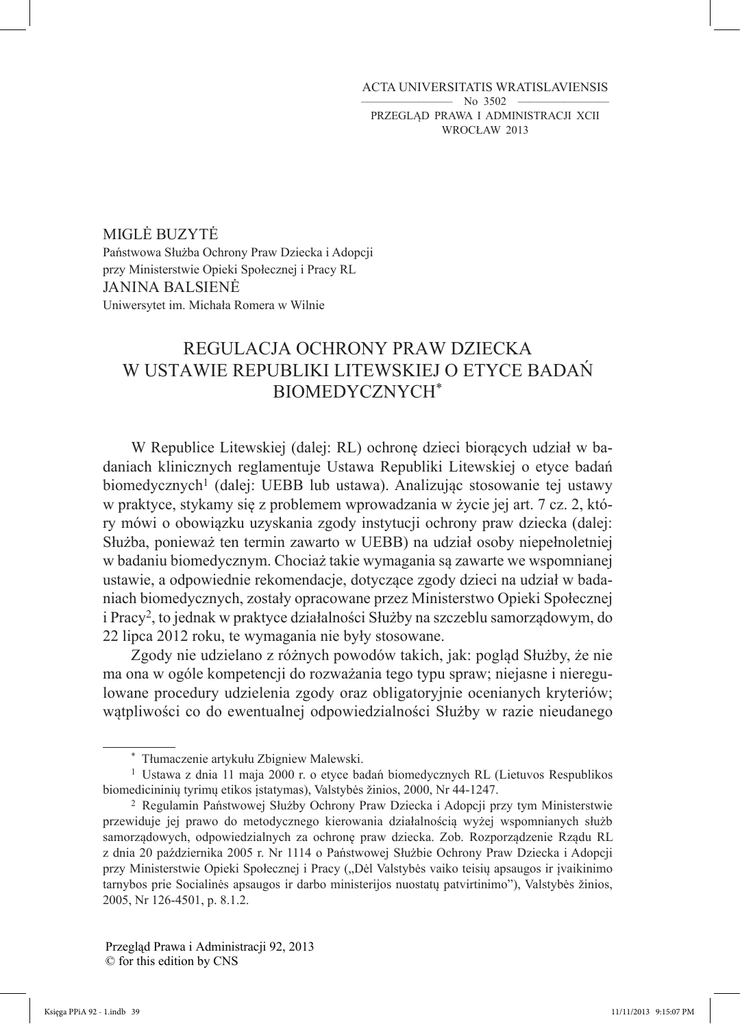 ACTA UNIVERSITATIS WRATISLAVIENSIS ———————— No 3502 ———————— PRZEGLĄD PRAWA I ADMINISTRACJI XCII WROCŁAW 2013 MIGLĖ BUZYTĖ Państwowa Służba Ochrony Praw Dziecka i Adopcji przy Ministerstwie Opieki Społecznej i Pracy RL JANINA BALSIENĖ Uniwersytet im. Michała Romera w Wilnie REGULACJA OCHRONY PRAW DZIECKA W USTAWIE REPUBLIKI LITEWSKIEJ O ETYCE BADAŃ BIOMEDYCZNYCH* W Republice Litewskiej (dalej: RL) ochronę dzieci biorących udział w badaniach klinicznych reglamentuje Ustawa Republiki Litewskiej o etyce badań biomedycznych1 (dalej: UEBB lub ustawa). Analizując stosowanie tej ustawy w praktyce, stykamy się z problemem wprowadzania w życie jej art. 7 cz. 2, który mówi o obowiązku uzyskania zgody instytucji ochrony praw dziecka (dalej: Służba, ponieważ ten termin zawarto w UEBB) na udział osoby niepełnoletniej w badaniu biomedycznym. Chociaż takie wymagania są zawarte we wspomnianej ustawie, a odpowiednie rekomendacje, dotyczące zgody dzieci na udział w badaniach biomedycznych, zostały opracowane przez Ministerstwo Opieki Społecznej i Pracy2, to jednak w praktyce działalności Służby na szczeblu samorządowym, do 22 lipca 2012 roku, te wymagania nie były stosowane. Zgody nie udzielano z różnych powodów takich, jak: pogląd Służby, że nie ma ona w ogóle kompetencji do rozważania tego typu spraw; niejasne i nieregulowane procedury udzielenia zgody oraz obligatoryjnie ocenianych kryteriów; wątpliwości co do ewentualnej odpowiedzialności Służby w razie nieudanego * Tłumaczenie artykułu Zbigniew Malewski. Ustawa z dnia 11 maja 2000 r. o etyce badań biomedycznych RL (Lietuvos Respublikos biomedicininių tyrimų etikos įstatymas), Valstybės žinios, 2000, Nr 44-1247. 2 Regulamin Państwowej Służby Ochrony Praw Dziecka i Adopcji przy tym Ministerstwie przewiduje jej prawo do metodycznego kierowania działalnością wyżej wspomnianych służb samorządowych, odpowiedzialnych za ochronę praw dziecka. Zob. Rozporządzenie Rządu RL z dnia 20 października 2005 r. Nr 1114 o Państwowej Służbie Ochrony Praw Dziecka i Adopcji przy Ministerstwie Opieki Społecznej i Pracy („Dėl Valstybės vaiko teisių apsaugos ir įvaikinimo tarnybos prie Socialinės apsaugos ir darbo ministerijos nuostatų patvirtinimo”), Valstybės žinios, 2005, Nr 126-4501, p. 8.1.2. 1 Przegląd Prawa i Administracji 92, 2013 © for this edition by CNS Księga PPiA 92 - 1.indb 39 11/11/2013 9:15:07 PM 40 MIGLĖ BUZYTĖ, JANINA BALSIENĖ badania biomedycznego i wynikającego stąd uszczerbku dla zdrowia dziecka. Powody i kryteria sporządzenia ww. rekomendacji, które powinna oceniać Służba, udzielając lub odmawiając udzielenia zgody, są opisane w samych rekomendacjach. Podkreśla się, że Ministerstwo Ochrony Zdrowia Litwy oficjalnie wyraziło swoje zdanie, że nawet przy braku uregulowań dotyczących procedury wyrażania zgody na udział w badaniach biomedycznych i zaistnieniu wątpliwości co do stosowania art. 7 cz. 2 Ustawy o etyce badań biomedycznych, badacze i osoby zamawiające badania biometryczne nie są zwalniane od wymogu otrzymania zgody Służby. W przypadkach braku takiej zgody, może być wstrzymane przeprowadzanie badań biomedycznych. Chcąc uniknąć tworzenia dodatkowych przeszkód do wykonywania badań biomedycznych na Litwie, Państwowa Służba Ochrony Praw Dziecka i Adopcji przy Ministerstwie Opieki Społecznej i Pracy wyraziła zdanie, że do czasu zmiany art. 7 cz. 2 UEBB, przy braku przewidzianych kryteriów dla Służby, jej zgoda na udział niepełnoletniego w badaniu biomedycznym mogłaby być wydawana, jeżeli: 1. Służbie jest przedstawione zezwolenie wydane przez Litewski komitet bioetyki lub regionalny komitet etyki badań biomedycznych, a w przypadkach klinicznych badań lekarstw, zezwolenie wydane przez Państwową służbę kontroli leków przy Ministerstwie Ochrony Zdrowia oraz zgoda Litewskiego komitetu bioetyki; 2. jest przedstawiona pisemna zgoda ustawowych przedstawicieli dziecka na jego udział w badaniu biomedycznym; 3. jest zgoda dziecka, które potrafi sformułować i wyrazić swoje życzenia3. Musimy podkreślić, że wspomniane rekomendacje są uchwalone na okres przejściowy, aż będą uregulowane sprawy dotyczące zmian art. 7 cz. 2 Ustawy o etyce badań biomedycznych. Może być to zrealizowane poprzez zniesienie wymagania otrzymania zgody Służby na udział dziecka w badaniach biomedycznych lub poprzez wydanie aktów wykonawczych, w których byłby przewidziany tryb i kryteria wydawania takiej zgody przez Służbę. Tylko po ocenie systemu ochrony praw dziecka w badaniach biomedycznych, zawartego w UEBB, można przyjąć uzasadnioną decyzję co do wymogu wydania zgody przez służbę ochrony praw dziecka na udział dziecka w badaniu biomedycznym. 1. PRZEPISY AKTUALNEJ USTAWY O ETYCE BADAŃ BIOMEDYCZNYCH Ustawa RL o etyce badań biomedycznych jest podstawowym krajowym aktem prawnym regulującym stosunki prawne powstałe w wyniku badań biome3 Strona Państwowej Służby Ochrony Praw Dziecka i Adopcji przy Ministerstwie Opieki Społecznej i Pracy (Valstybės vaiko teisių apsaugos ir įvaikinimo tarnyba prie SADM), http://www. vaikoteises.lt/media/file/bio120822.pdf (dostęp: 12.02.2012). Przegląd Prawa i Administracji 92, 2013 © for this edition by CNS Księga PPiA 92 - 1.indb 40 11/11/2013 9:15:07 PM REGULACJA OCHRONY PRAW DZIECKA W USTAWIE REPUBLIKI LITEWSKIEJ 41 dycznych. Artykuł 1 tej ustawy wskazuje jej przeznaczenie — ustawa ustanawia wymogi i zasady etyki badań biomedycznych, tryb wydawania zezwoleń na badania biomedyczne, tryb kontroli wykonywania badań biomedycznych oraz odpowiedzialność za naruszenie zasad zawartych w tej ustawie. W Ustawie RL o etyce badań biomedycznych4 podkreśla się, że proces klinicznego badania preparatów lekarskich musi być zgodny nie tylko z tą ustawą, ale też z Ustawą o farmacji i innymi aktami prawa. Jesteśmy zdania, że u