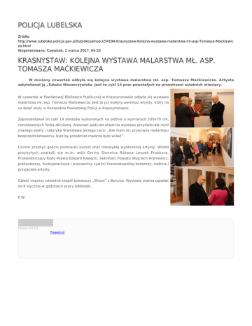 POLICJA LUBELSKA Źródło: http://www.lubelska.policja.gov.pl/lub/aktualnosci/54194,Krasnystaw-Kolejna-wystawa-malarstwa-ml-asp-Tomasza-Mackiewic za.html Wygenerowano: Czwartek, 2 marca 2017, 04:22 KRASNYSTAW: KOLEJNA WYSTAWA MALARSTWA MŁ. ASP. TOMASZA MAĆKIEWICZA W miniony czwartek odbyła się kolejna wystawa malarstwa mł. asp. Tomasza Maćkiewicza. Artysta zatytułował ją „Sztuka Nierzeczywista. Jest to cykl 14 prac powstałych na przestrzeni ostatnich miesięcy. W czwartek w Powiatowej Bibliotece Publicznej w Krasnymstawie odbyła się wystawa malarstwa mł. asp. Tomasza Maćkiewicza. Jest to już kolejny wernisaż artysty, który na co dzień służy w Komendzie Powiatowej Policji w Krasnymstawie. Zaprezentował on cykl 14 obrazów wykonanych na płótnie o wymiarach 100x70 cm, namalowanych farbą akrylową. Autorowi podczas otwarcia wystawy przyświecała myśl znanego poety i satyryka Stanisława Jerzego Leca: „Nie mam nic przeciwko malarstwu bezprzedmiotowemu, byle by przedmiot malarza było widać”. Licznie przybyli goście podziwiali kunszt oraz niezwykłą wyobraźnią artysty. Wśród przybyłych znaleźli się m.in: wójt Gminy Siennica Różana Leszek Proskura, Przewodniczący Rady Miasta Edward Kawęcki, Sekretarz Powiatu Wojciech Hryniewicz, prokuratorzy, funkcjonariusze i pracownicy cywilni krasnostawskiej komendy, rodzina i przyjaciele artysty. Całość imprezy uświetnił zespół śpiewaczy „Wrzos” z Borunia. Wystawę można oglądać do 8 stycznia w godzinach pracy biblioteki. P.W. Ocena: 5/5 (1) Tweetnij