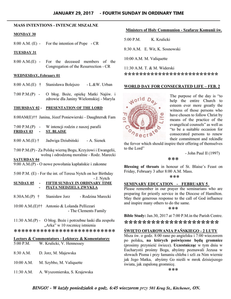 JANUARY 29, 2017 - FOURTH SUNDAY IN ORDINARY TIME MASS INTENTIONS - INTENCJE MSZALNE Ministers of Holy Communion - Szafarze Komunii św. MONDAY 30 5:00 P.M. 8:00 A.M. (E) - 8:30 A.M. E. Wit, K. Sosnowski TUESDAY 31 8:00 A.M.(E) - For the deceased members of the Congregation of the Resurrection - CR 8:00 A.M.(E) † Stanisława Bolejszo 7:00 P.M.(P) - O błog. Boże, opiekę Matki Najśw. i zdrowie dla Janiny Wielomskiej - Maryla THURSDAY 02 - PRESENTATION OF THE LORD - L.&W. Urban 8:00AM(E)†† Janina, Józef Poniewierski - Daughters& Fam 7:00 P.M.(P) - W intencji rodzin z naszej parafii FRIDAY 03 ST. BLAISE - 8:00 A.M.(E) † Jadwiga Dziubiński - A. Sienek 7:00 P.M.(P) - Za Polskę wierną Bogu, Krzyżowi i Ewangelii, wolną i odrodzoną moralnie - Rodz. Marecki SATURDAY 04 9:00 A.M.(P) - O nowe powołania kapłańskie i zakonne 5:00 P.M. (E) - For the int. of Teresa Nytch on her Birthday - J. Nytch - 8:30A.M.(P) † FIFTH SUNDAY IN ORDINARY TIME PIĄTA NIEDZIELA ZWYKŁA Stanisław Jorz 10:00 A.M. M. Valiquette 11:30 A.M. T. & M. Widerski ************************* WEDNESDAY, February 01 SUNDAY 05 K. Krulicki For the intention of Pope - CR - Rodzina Marecki 10:00 A.M.(E)†† Antonio & Lolanda Pellizzari - The Clements Family WORLD DAY FOR CONSECRATED LIFE – FEB. 2 The purpose of the day is “to help the entire Church to esteem ever more greatly the witness of those persons who have chosen to follow Christ by means of the practice of the evangelical counsels” as well as “to be a suitable occasion for consecrated persons to renew their commitment and rekindle the fervor which should inspire their offering of themselves to the Lord” - John Paul II (1997) *** Blessing of throats in honour of St. Blaise’s Feast on Friday, February 3 after 8:00 A.M. Mass. *** SEMINARY EDUCATION - FEBRUARY 5 Please remember in our prayer the seminarians who are preparing for priestly service in the Diocese of Hamilton. May their generous response to the call of God influence and inspire many others to do the same. *** Bible Study: Jan.30, 2017 at 7:00 P.M.in the Parish Centre. 11:30 A.M.(P) - O błog. Boże i potrzebne łaski dla zespołu „Arka” w 10 rocznicę istnienia *************************** Lectors & Commentators - Lektorzy & Komentatorzy 5:00 P.M. W. Krulicki, V. Hennessey 8:30 A.M. D. Jorz, M. Majewska 10:00 A.M. M. Szybbo, M. Valiquette 11:30 A.M. A. Wyszomierska, S. Krajewska ********************* ŚWIĘTO OFIAROWANIA PAŃSKIEGO - 2 LUTY Msza św. o godz. 8:00 rano po angielsku i 7:00 wieczorem po polsku, na których poświęcone będą gromnice (prosimy przynieść świece). Uczestnicząc w tym dniu w Eucharystii prośmy Boga, abyśmy poznawali Jezusa w słowach Pisma i przy łamaniu chleba i szli za Nim wiernie jak Jego Matka, abyśmy Go nieśli w mrok dzisiejszego świata, jak zapaloną gromnicę. *** BINGO! - W każdy poniedziałek o godz. 6:45 wieczorem przy 501 Krug St., Kitchener, ON. 29 STYCZEŃ, 2017 - CZWARTA NIEDZIELA ZWYKŁA SPOTKANIE DZIECI I-KOMUNIJNYCH: Poniedziałek, 30 Styczeń; 6:00 wieczorem; Sala Parafialna. *** SPOTKANIE MINISTRANTÓW: Poniedziałek, 30 stycznia o godz. 7 wieczorem w kościele. *** SPOTKANIE GRUPY BIBLIJNEJ: Poniedziałek, 30 Styczeń o godz. 700 wiecz. w Centrum Paraf. *** NOWENNA DO MBN POMOCY połączona z Mszą św. w ŚRODĘ o godz. 7:00 wieczorem. W czasie Nowenny poświęcenie dewocjonalii. Spowiedź św. o godz. 6:30 wieczorem. *** I PIĄTEK MIESIĄCA - 3 LUTY - Godz. 8:00 rano - 10 w nocy - ADORACJA - Godz. 6:00 - Spowiedź. św.; Godz. 7:00 - Msza św. *** LUTY 5 – Prosimy pamiętać o specjalnej kolekcie diecezjalnej mającej na celu wsparcie seminarzystów. *** ZABAWA WALENTYNKOWA – 11 LUTY Polski Dom 2000 zaprasza na Walentynki w sobotę, 11 lutego o godz. 6:00 wieczorem. Cena Biletu: $25.00 od osoby w tym obiad, kawa i ciasto. Muzyka i Taniec: DJ. Bilety do nabycia w polskim sklepie „Glogowski Euro Food lub u panów: Marian 519-749-6357 i John 519-505-0987. *** ZABAWA WALENTYNKOWA – 11 LUTY Zarząd Placówki polskiego Legionu #412 w Kitchener i Korpus Pomocniczy Pań serdecznie zapraszają całą polonię okręgu Kitchener – Cambridge, Waterloo i Guelph na Zabawę Walentynkową, która odbędzie się 11 lutego of godz. 7:00 wieczorem w Sali Polskiego Legionu przy 601 Wellington St. N. W Kitchener. Do tańca grać będzie DJ - Hubert. Bilety w cenie $30.00 od osoby - w tym gorąca kolacja- można nabyć u Andrzeja tel: 519-742-0223. Wśród uczestników zabawy będą rozlosowane 2 darmowe bilety wstępu. *** Pożegnanie Pani Jadzi Handler – naszej sekretarki Dziękujemy Pani Jadziu za wiele lat pracy na odpowiedzialnym i ważnym dla parafii stanowisku. W szczególny sposób dziękujemy jednak za ciepło, uśmiech, chęć pomocy i mnóstwo dobra, którego doświadczyliśmy z Pani strony. Życzymy Pani, aby czas zasłużonego odpoczynku przebiegał w zdrowiu, spokoju i radości. Prosimy też, aby często nas Pani odwiedzała, gdyż jest Pani bardzo ważnym członkiem naszej parafialnej wspólnoty. *** Na koniec dedykujemy Pani wiersz; Już słońce zaszło nad naszym Kościołem, Emerytury nadszedł czas, Odejdziesz Jadziu w swoją stronę, Czy chociaż czasem wspomnisz nas? Żegnajcie, pisma, tabelki konta, druki i rozliczenia, Witajcie baaardzo późne wstawanie, i bezustanne leniuchowanie. Jedź na wycieczkę, może do Grecji, Zaszalej trochę także w Wenecji, Odwiedź Paryż lub Barcelonę, Byś mogła wspominać chwile szalone. Gdy szaleństwo Cię jednak znudzi, I zatęsknisz trochę do ludzi, Zapraszamy do nas serdecznie, Odwiedzaj nas często - koniecznie!. Pamiętaj jednak Jadziu kochana, O tych co muszą pracować od rana, Współczuj im choć odrobineczkę, I za ich zdrowie wypij szklaneczkę. *** Pragniemy również serdecznie powitać, Panią Elżbietę Raszyk, która będzie nową sekretarką. Życzymy Pani Elu dużo radości z pełnienia nowych obowiązków dla naszej wspólnoty parafialnej, jak również
