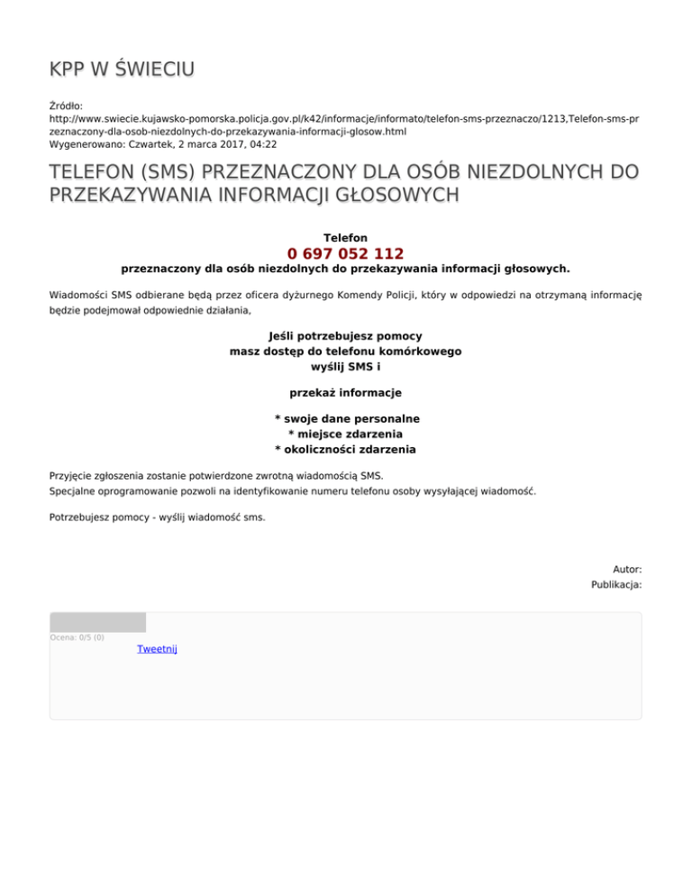 KPP W ŚWIECIU Źródło: http://www.swiecie.kujawsko-pomorska.policja.gov.pl/k42/informacje/informato/telefon-sms-przeznaczo/1213,Telefon-sms-pr zeznaczony-dla-osob-niezdolnych-do-przekazywania-informacji-glosow.html Wygenerowano: Czwartek, 2 marca 2017, 04:22 TELEFON (SMS) PRZEZNACZONY DLA OSÓB NIEZDOLNYCH DO PRZEKAZYWANIA INFORMACJI GŁOSOWYCH Telefon 0 697 052 112 przeznaczony dla osób niezdolnych do przekazywania informacji głosowych. Wiadomości SMS odbierane będą przez oficera dyżurnego Komendy Policji, który w odpowiedzi na otrzymaną informację będzie podejmował odpowiednie działania, Jeśli potrzebujesz pomocy masz dostęp do telefonu komórkowego wyślij SMS i przekaż informacje * swoje dane personalne * miejsce zdarzenia * okoliczności zdarzenia Przyjęcie zgłoszenia zostanie potwierdzone zwrotną wiadomością SMS. Specjalne oprogramowanie pozwoli na identyfikowanie numeru telefonu osoby wysyłającej wiadomość. Potrzebujesz pomocy - wyślij wiadomość sms. Autor: Publikacja: Ocena: 0/5 (0) Tweetnij