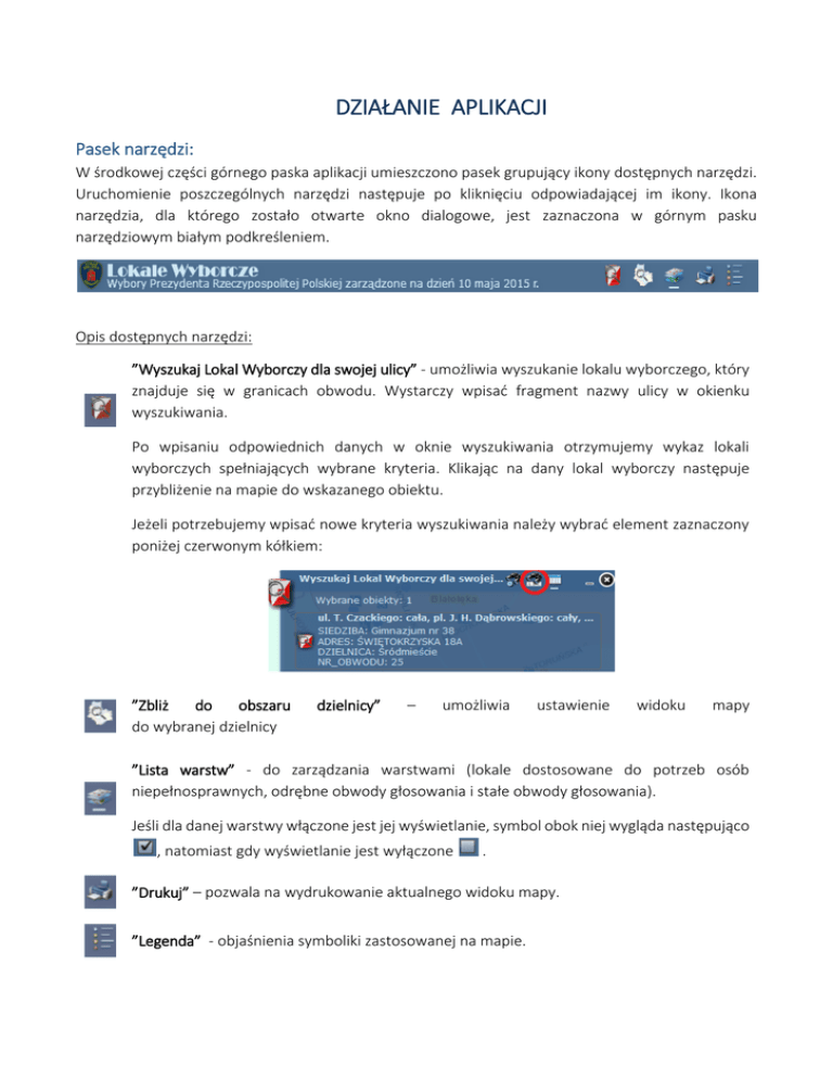 DZIAŁANIE APLIKACJI Pasek narzędzi: W środkowej części górnego paska aplikacji umieszczono pasek grupujący ikony dostępnych narzędzi. Uruchomienie poszczególnych narzędzi następuje po kliknięciu odpowiadającej im ikony. Ikona narzędzia, dla którego zostało otwarte okno dialogowe, jest zaznaczona w górnym pasku narzędziowym białym podkreśleniem. Opis dostępnych narzędzi: ”Wyszukaj Lokal Wyborczy dla swojej ulicy” - umożliwia wyszukanie lokalu wyborczego, który znajduje się w granicach obwodu. Wystarczy wpisać fragment nazwy ulicy w okienku wyszukiwania. Po wpisaniu odpowiednich danych w oknie wyszukiwania otrzymujemy wykaz lokali wyborczych spełniających wybrane kryteria. Klikając na dany lokal wyborczy następuje przybliżenie na mapie do wskazanego obiektu. Jeżeli potrzebujemy wpisać nowe kryteria wyszukiwania należy wybrać element zaznaczony poniżej czerwonym kółkiem: ”Zbliż do obszaru do wybranej dzielnicy dzielnicy” – umożliwia ustawienie widoku mapy ”Lista warstw” - do zarządzania warstwami (lokale dostosowane do potrzeb osób niepełnosprawnych, odrębne obwody głosowania i stałe obwody głosowania). Jeśli dla danej warstwy włączone jest jej wyświetlanie, symbol obok niej wygląda następująco , natomiast gdy wyświetlanie jest wyłączone . ”Drukuj” – pozwala na wydrukowanie aktualnego widoku mapy. ”Legenda” - objaśnienia symboliki zastosowanej na mapie. Narzędzia nawigacji po mapie: Przesuń w górę, dół, prawo, lewo lub na ukos – kliknięcie w strzałki pozwala przesunąć mapę w wybranym kierunku. Pełny zasięg - kliknięcie na symbol globu przywraca początkowy, pełny zasięg mapy. Wyświetlanie poprzedniego widoku - przenosi do poprzedniego widoku mapy. Wyświetlanie następnego widoku - przenosi do poprzedniego widoku mapy. Powiększ, pomniejsz - suwak umożliwia powiększanie lub pomniejszanie mapy. Przesuwanie mapy - kliknij na ikonę narzędzia „Przesuń” aby je uaktywnić, a następnie przesuń mapę trzymając wciśnięty lewy przycisk myszy. Powiększenie mapy - kliknij na narzędzie „Powiększ” aby je uaktywnić, a następnie powiększ wybrany obszar na mapie trzymając wciśnięty lewy przycisk myszy. Pomniejszenie mapy - kliknij na narzędzie „Pomniejsz” aby je uaktywnić, a następnie pomniejsz wybrany obszar na mapie trzymając wciśnięty lewy przycisk myszy. Mapy bazowe: „Mapa bazowa” pozwala na przełączenie widoku mapy pomiędzy mapą topograficzną, a ortofotomapą. Wyświetlanie informacji o obiektach: Dla obiektów warstw dotyczących obwodów do głosowania istnieje możliwość uzyskania informacji o obiektach poprzez wyświetlenie okna dialogowego w oknie mapy w sąsiedztwie danego obiektu, tzw. pop-up. Identyfikacji podlegają obiekty tylko z widocznych warstw. Aby uzyskać szczegółowe informacje o obiekcie najedź kursorem myszy na wybrany obiekt w oknie mapy i kliknij. Pojawi się okno z wartościami atrybutów wskazanego obiektu. Jeśli we wskazywanym miejscu jest więcej niż jeden obiekt można przewijać informacje strzałkami prawo-lewo w nagłówku okna pop-up. Wyszukiwanie lokali wyborczych. W pasku narzędzi znajduje się widget służący do wyszukiwania lokali wyborczych. Po otworzeniu okna należy kliknąć na obiekt zaznaczony poniżej czerwonym kółkiem. Po wpisaniu odpowiednich danych (nazwy ulicy, dla której poszukujemy obwodu do głosowania) w oknie wyszukiwania otrzymujemy wykaz lokali wyborczych spełniających wybrane kryteria. Klikając na dany lokal wyborczy następuje przybliżenie i wyświetlenie wszystkich atrybutów (tzw. pop-up.). Jeżeli potrzebujemy wpisać nowe kryteria wyszukiwania należy wybrać element zaznaczony poniżej czerwonym kółkiem: wówczas okno wyszukiwania przyjmuje poprzedni wygląd: Dane w aplikacji zostały wykazane na podstawie: 1) Uchwała NR XLV/1214/2012 Rady Miasta Stołecznego Warszawy z dnia 18 października 2012 r. w sprawie podziału m.st. Warszawy na stałe obwody głosowania. 2) Uchwała NR VIII/166/2015 Rady Miasta Stołecznego Warszawy z dnia 26 marca 2015 r. w sprawie utworzenia odrębnych obwodów głosowania w szpitalach, zakładach pomocy społecznej, zakładach karnych i aresztach śledczych, a także ustalenia ich numerów, granic oraz siedzib obwodowych komisji wyborczych w wyborach Prezydenta Rzeczypospolitej Polskiej zarządzonych na dzień 10 maja 2015 roku. 3) Postanowienie Komisarza Wyborczego w Warszawie z dnia 10 kwietnia 2015 r. w sprawie utworzenia obwodu głosowania w m.st. Warszawa, w związku z wyborami Prezydenta RP zarządzonymi na dzień 10 maja 2015 r. (DWW 712-8/15).