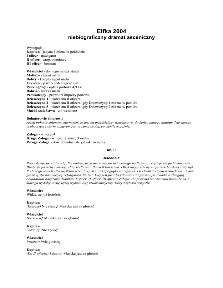 Elfka 2004 niebiograficzny dramat asceniczny Występują: Kapitan - jedyna kobieta na pokładzie I oficer - nawigator II oficer - zaopatrzeniowy III oficer - bosman Właściciel - do niego należy statek Mafiozo - agent mafii Dobry - kolejny agent mafii Eskulap - jeszcze jeden agent mafii Parkingowy - opłata portowa 4,93 zł Babcia - liderka mafii Prowadzący - prowadzi imprezy portowe Dziewczyna 1 - ukochana II oficera Dziewczyna 2 - ukochana II oficera, gdy Dziewczyny 1 nie ma w pobliżu Dziewczyna 3 - ukochana II oficera, gdy Dziewczyny 2 nie ma w pobliżu Macki szaleństwa - zło wcielone Bohaterowie zbiorowi: Jeżeli bohater zbiorowy ma numer, to jest on przydzielany tymczasowo, do końca danego dialogu. Nie zawsze osoba z tym samym numerem jest tą samą osobą, co chwilę wcześnie. Załoga - w ilości 4 Druga Załoga - w ilości 2, może 3 osoby Wroga Załoga - ilość dowolna, ale jednak rozsądna. AKT I Ascena 1 Rzecz dzieje się nad wodą. Na wodzie, przycumowany do betonowego nadbrzeża, znajduje się jacht klasy ElBimbo (a jakże by inaczej). Przy nadbrzeżu Biuro Właściciela. Obok niego schody na jeszcze bardziej stały ląd. Po brzegu przechadza się Właściciel. Co jakiś czas spogląda na zegarek. Po chwili zaczyna nasłuchiwać. Coraz głośniej słychać muzykę "Dragostea din tei". Gdy jest już zdecydowanie za głośno, po schodach zbiegają, obładowani bagażami, Kapitan, I oficer, II oficer, III oficer i Załoga. II oficer ma na ramieniu boom-boxa, z którego wydobywa się wyżej wymieniony utwór muzyczny, który zagłusza wszystko. Właściciel Widzę, że już jesteście. Kapitan (Krzyczy) Nie słyszę! Muzyka jest za głośno! Właściciel Nie słyszę! Muzyka jest za głośno! Kapitan Głośniej! Nie słyszę! Właściciel Proszę mówić głośniej! Kapitan (Do II oficera) Ścisz to! Muzyka jest za głośno! II oficer Nie słyszę! Muzyka jest za głośno! II oficer wyłącza boom-boxa. II oficer Co? Wszyscy patrzą na niego z politowaniem. Kapitan odwraca się do Właściciela. Kapitan Już jesteśmy. Właściciel Zauważyłem. (Odwraca się do reszty załogi) To, który z panów będzie kapitanem? Kapitan Tak się składa, że ja. Właściciel (Przez chwilę patrzy zdziwiony) Proszę za mną. Trzeba załatwić formalności. Kapitan (Do załogi) Zapakujcie bagaże na łódkę! Właściciel i Kapitan idą do Biura Właściciela. I oficer (Do II) Słyszałeś rozkaz. Siada na jakimś plecaku. II oficer (Do III) Słyszałeś rozkaz. Siada obok I oficera. III oficer (Do Załogi) Słyszeliście rozkaz. Siada obok I i II oficera. II oficer podaje pozostałym oficerom książki. Zaczynają czytać. Załogant 1 No, do roboty! Załogant 2 Nie możesz mi rozkazywać! Jesteśmy równi rangą! Załogant 1 Sam przecież wszystkiego nie załaduję. Załogant 3 Nie marudź, trochę pomożemy. Ja zapakuję moje rzeczy, a wy resztę. Załogant 2 Nie, każdy musi zrobić tyle samo! Wstaje III oficer. III oficer (Krzyczy, a nawet ryczy) Do roboty! Załoga zaczyna wrzucać bagaże na pokład. III oficer (Siadając) Jak się nie krzyknie, to się nie ruszą. I oficer Ja nie wiem, po co oni tu są. Wakacji im się zachciało. Tu trzeba pracować, a nie obijać się. Załogant podchodzi do Oficerów i szturcha II oficera. Załogant Mogę zabrać ten bagaż, na którym siedzicie? III oficer Poszedł! Załogant ucieka. I oficer I jeszcze czytać nie dadzą. Totalny upadek moralności. II oficer Może dają coś ciekawego w radiu. Włącza boom-boxa. Słychać utwór "Dragostea din tei". Ascena 2 Załoga stoi na łódce i wpycha jakiś bagaż do środka. Po chwili I oficer zamyka książkę i podchodzi do łódki. I oficer Zmieściło się wszystko? Załogant Tak III oficer Ale wiecie, ja byś tu kilka rzeczy poprawił. III oficer wchodzi na statek. III oficer Przecież tu się nie da wejść do środka. Trzeba to poprzestawiać. Rzuca jakiś bagaż na ląd. Załogant 1 Moje rzeczy! Kolejny bagaż leci na ląd. Słychać trzask. Załogant 2 Moje płyty! Następny bagaż i następny trzask. III oficer znika pod pokładem. Załogant 3 Moja kolekcja porcelanowych słoników szczęścia! I oficer (Do II oficera) Na co komu na rejsie takie coś? II oficer Nigdy nie wiesz, co się przyda. Przez forluk wychyla się III oficer. III oficer Dobrze jest! Zrobiłem tunel i można się poruszać. I oficer przygląda się dokładnie łódce. I oficer Dobra, wszyscy wyskakujcie. Teraz ja wprowadzę tu kilka poprawek. Wchodzi do środka. III oficer przez forluk wychodzi na dziób. Po chwili I oficer wyrzuca ze środka jakiś bagaż. I oficer To na razie damy na brzeg. (Wyrzuca kolejny bagaż) To też. (Jeszcze jeden bagaż) I to. Załogant Przepraszam, ale dlaczego tylko nasze bagaże zostały wyrzucone. Co to, jakieś uprzywilejowanie kasty oficerskiej? I oficer (Wychyla się) Rachunek prawdopodobieństwa was nie lubi. Znów chowa się pod pokład i wyrzuca kolejne kilka rzeczy. II oficer (Rozglądając się) Kapitan idzie! Wskakuje na łódź. II oficer Szybko, gdzie ten czerwony dywan?! Wchodzi pod pokład. Z łódki wypada jeszcze kilka rzeczy. Po chwili wybiega II oficer z czerwonym dywan. Za nim biegnie I oficer. Rozkładają dywan. Z biura właściciela wychodzi Właściciel i Kapitan. I oficer, II oficer, III oficer i Załoga ustawiają się wzdłuż dywanu. Właściciel (Podaje klucze Kapitanowi) Oto klucze do statku. Proszę pokwitować odbiór. Podaje jakiś dokument do podpisania. Kapitan To, od czego był tamte poprzednie dokumenty? Właściciel Formalności. Kapitan (Do załogi) I od teraz oficjalnie jestem waszym kapitanem. Cała załoga salutuje. Kapitan dostojnym krokiem po dywanie wchodzi na statek. Za nim kolejno I oficer, II oficer, III oficer i Załoga. Ostatni Załogant prawie wypada z łódki. Właściciel Łódka jest trochę zbyt obciążona. Musicie coś zostawić. III oficer wypycha Załogę. III oficer A teraz? Właściciel Jest w porządku. Pomyślnych wiatrów! Odc