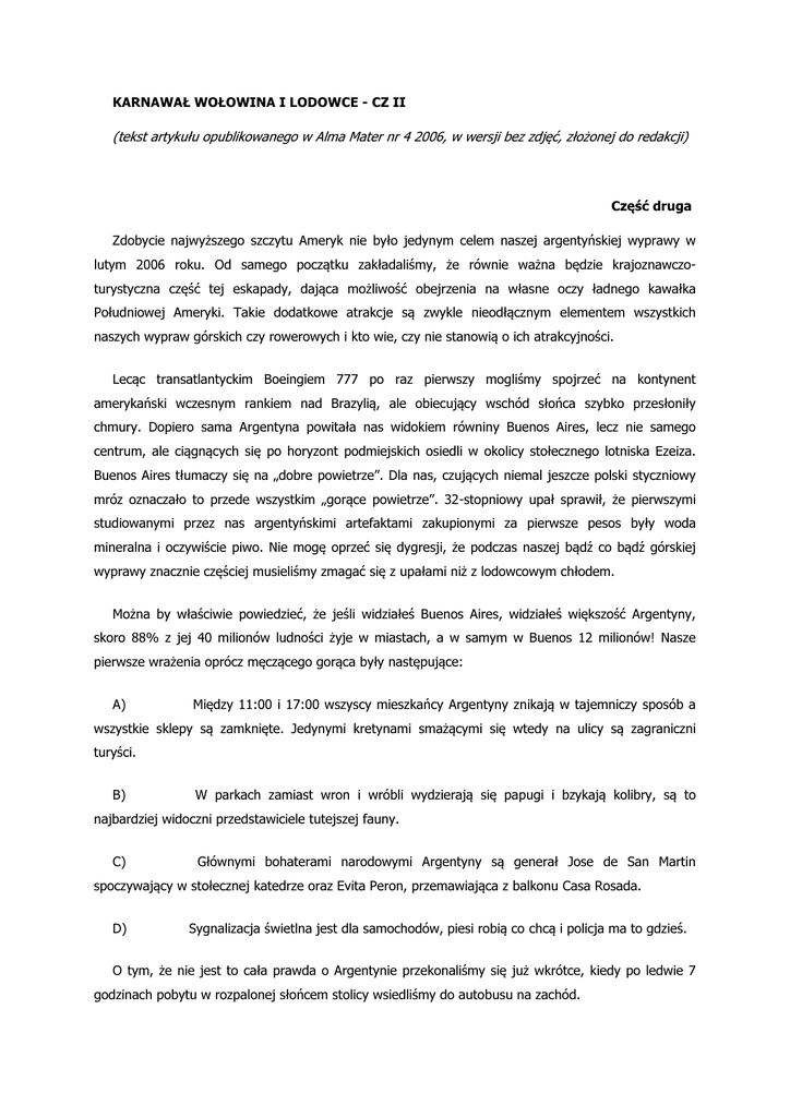 KARNAWAŁ WOŁOWINA I LODOWCE - CZ II (tekst artykułu opublikowanego w Alma Mater nr 4 2006, w wersji bez zdjęć, złożonej do redakcji) Część druga Zdobycie najwyższego szczytu Ameryk nie było jedynym celem naszej argentyńskiej wyprawy w lutym 2006 roku. Od samego początku zakładaliśmy, że równie ważna będzie krajoznawczoturystyczna część tej eskapady, dająca możliwość obejrzenia na własne oczy ładnego kawałka Południowej Ameryki. Takie dodatkowe atrakcje są zwykle nieodłącznym elementem wszystkich naszych wypraw górskich czy rowerowych i kto wie, czy nie stanowią o ich atrakcyjności. Lecąc transatlantyckim Boeingiem 777 po raz pierwszy mogliśmy spojrzeć na kontynent amerykański wczesnym rankiem nad Brazylią, ale obiecujący wschód słońca szybko przesłoniły chmury. Dopiero sama Argentyna powitała nas widokiem równiny Buenos Aires, lecz nie samego centrum, ale ciągnących się po horyzont podmiejskich osiedli w okolicy stołecznego lotniska Ezeiza. Buenos Aires tłumaczy się na „dobre powietrze”. Dla nas, czujących niemal jeszcze polski styczniowy mróz oznaczało to przede wszystkim „gorące powietrze”. 32-stopniowy upał sprawił, że pierwszymi studiowanymi przez nas argentyńskimi artefaktami zakupionymi za pierwsze pesos były woda mineralna i oczywiście piwo. Nie mogę oprzeć się dygresji, że podczas naszej bądź co bądź górskiej wyprawy znacznie częściej musieliśmy zmagać się z upałami niż z lodowcowym chłodem. Można by właściwie powiedzieć, że jeśli widziałeś Buenos Aires, widziałeś większość Argentyny, skoro 88% z jej 40 milionów ludności żyje w miastach, a w samym w Buenos 12 milionów! Nasze pierwsze wrażenia oprócz męczącego gorąca były następujące: A) Między 11:00 i 17:00 wszyscy mieszkańcy Argentyny znikają w tajemniczy sposób a wszystkie sklepy są zamknięte. Jedynymi kretynami smażącymi się wtedy na ulicy są zagraniczni turyści. B) W parkach zamiast wron i wróbli wydzierają się papugi i bzykają kolibry, są to najbardziej widoczni przedstawiciele tutejszej fauny. C) Głównymi bohaterami narodowymi Argentyny są generał Jose de San Martin spoczywający w stołecznej katedrze oraz Evita Peron, przemawiająca z balkonu Casa Rosada. D) Sygnalizacja świetlna jest dla samochodów, piesi robią co chcą i policja ma to gdzieś. O tym, że nie jest to cała prawda o Argentynie przekonaliśmy się już wkrótce, kiedy po ledwie 7 godzinach pobytu w rozpalonej słońcem stolicy wsiedliśmy do autobusu na zachód. Wobec całkowitej atrofii sieci kolejowej (podmiejskie pociągi osobowe widzieliśmy tylko w Buenos), wysokich kosztów połączeń lotniczych i całkowitej nieopłacalności wynajmu samochodów osobowych, obecnie podstawowy środek transportu pasażerskiego stanowią właśnie autobusy dalekobieżne. Dzięki wolnemu rynkowi dziesiątków prywatnych przewoźników turysta na olbrzymim dworcu autobusowym z setkami peronów jest może cokolwiek zagubiony, ale nie może powiedzieć, że się o niego nie starają. Wobec mizerii polskich autobusów wielki argentyński liniowiec szosowy z obowiązkową klimatyzacją, szerokimi fotelami z podnóżkiem i polarowym kocem do spania, telewizją, wygodną ubikacją i posiłkami oraz ubezpieczeniem bagażu wliczonymi w bilet jest jak transatlantyk wobec promu przez Wisłę w Solcu i to przy wiele niższej cenie. Takie olbrzymie autobusy robiły na nas wrażenie osobnego świata na kółkach, szczególnie wobec infrastruktury drogowo-dworcowej Argentyny. Prawdziwie surrealistyczny był czasem widok takich drogowych gigantów na lokalnych gruntowych drogach lub na ulicach prowincjonalnych miasteczek. W osłupieniu obserwowaliśmy jak nasz autobus przejeżdżając przez takie miejsca łamie gałęzie drzew i zrywa kable elektryczne, co zresztą nie robiło wrażenia ani na kierowcy ani na miejscowych mieszkańcach. Z okien takiego właśnie linera, który jak jeszcze nie raz w czasie naszej wyprawy był czymś w rodzaju hotelu na jedną noc mogliśmy obejrzeć krajobrazy środkowej Argentyny zanim zapadł zmrok. Przez te 1000 kilometrów drogi w poprzek kontynentu nie było jednak zbyt wiele do obejrzenia ponieważ trasa prowadzi przez rozległą i równą jak stół nizinę dawnej Pampy, która została teraz zamieniona w wielkie pastwisko. Elementami krajobrazu są tutaj głównie krowy i konie a z rzadka w kępach drzew kryją się białe budynki hacjend – tu właśnie żyje pozostałe 12% Argentyńczyków. Wczesny ranek wita nas na dworcu autobusowym w Mendozie. Jeszcze ciemno, a już zaczyna się robić ciepło. Zwaliwszy bagaże pod budynkiem pod opieką Kamili i Rafała ruszamy w miasto w poszukiwaniu noclegu z „pascalem” w ręku. Nie jest łatwo, właściciele jeszcze śpią, więc albo nikt nie otwiera, albo portier tłumaczy na migi, że nie ma miejsc (od razu widać, że w języku angielskim nie będzie tu łatwo się dogadać). Dopiero w samym centrum, kilka kilometrów od dworca znajdujemy całkiem przyzwoity hotelik na naszą kieszeń, o nieco mylącej nazwie Imperial. Zadowoleni wracamy do kolegów, ale ich widok szybko gasi naszą radość. Okazało się, że pod ich nieuwagę ponieśliśmy pierwszą i na szczęście ostatnią stratę w czasie wyprawy – ktoś ukradł jeden z małych plecaków. Szybka konstatacja i oddech ulgi, zginęły kosmetyki Kamili, legitymacja i reklamowy dyktafon. Jak możemy, pocieszamy Kamilę po stracie (kosmetyków oczywiście) i staramy się ukryć zadowolenie, że to tylko tyle. 100-tysięczna Mendoza jest (w odpowiednich proporcjach) tym dla Andów Argentyńskich czym Zakopane dla Tatr, choć może widoczne z miasta forpoczty gór nie robią dużego wrażenia. Mieszkańcy Lublina skojarzą natychmiast jeżdżące tu trolejbusy, ale wszyscy zapamiętują ilość miejskiej zieleni. Olbrzymi park, oczywiście imienia generała San Martina mieszczący tereny rekreacyjne, stadio