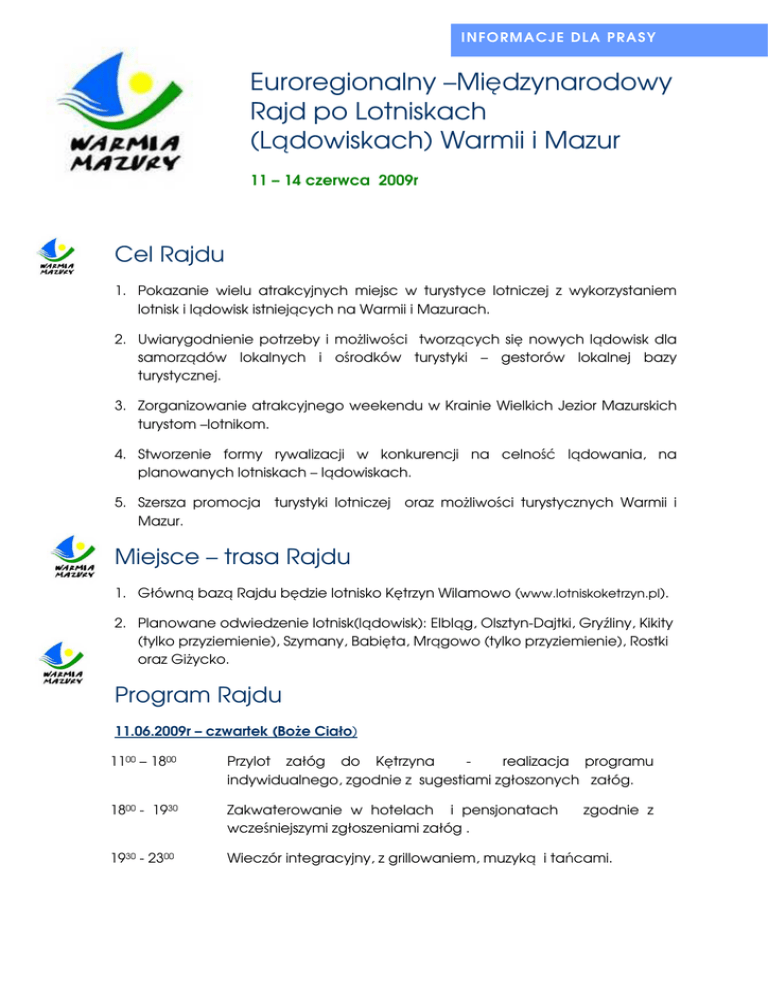 I NFORM AC JE DLA P RASY Euroregionalny –Międzynarodowy Rajd po Lotniskach (Lądowiskach) Warmii i Mazur 11 – 14 czerwca 2009r Cel Rajdu 1. Pokazanie wielu atrakcyjnych miejsc w turystyce lotniczej z wykorzystaniem lotnisk i lądowisk istniejących na Warmii i Mazurach. 2. Uwiarygodnienie potrzeby i moŜliwości tworzących się nowych lądowisk dla samorządów lokalnych i ośrodków turystyki – gestorów lokalnej bazy turystycznej. 3. Zorganizowanie atrakcyjnego weekendu w Krainie Wielkich Jezior Mazurskich turystom –lotnikom. 4. Stworzenie formy rywalizacji w konkurencji na celność lądowania, na planowanych lotniskach – lądowiskach. 5. Szersza promocja turystyki lotniczej oraz moŜliwości turystycznych Warmii i Mazur. Miejsce – trasa Rajdu 1. Główną bazą Rajdu będzie lotnisko Kętrzyn Wilamowo (www.lotniskoketrzyn.pl). 2. Planowane odwiedzenie lotnisk(lądowisk): Elbląg, Olsztyn-Dajtki, Gryźliny, Kikity (tylko przyziemienie), Szymany, Babięta, Mrągowo (tylko przyziemienie), Rostki oraz GiŜycko. Program Rajdu 11.06.2009r – czwartek (BoŜe Ciało) 1100 – 1800 Przylot załóg do Kętrzyna realizacja programu indywidualnego, zgodnie z sugestiami zgłoszonych załóg. 1800 - 1930 Zakwaterowanie w hotelach i pensjonatach wcześniejszymi zgłoszeniami załóg . 1930 - 2300 Wieczór integracyjny, z grillowaniem, muzyką i tańcami. zgodnie z 12.06.2009r – piątek 0900 – 0930 Odprawa pilotów – omówienie przewidzianych konkurencji 0930 – 1000 Przygotowanie samolotów do wylotu z Kętrzyna; 1000 - 1100 Przelot do Elbląga na lotnisko (lądowanie punktowane); 1100 - 1300 Pobyt w Elblągu wg programu gospodarzy Miasta Aeroklubu Elbląskiego 1300 Przylot DC-3 Dacota ze Szwecji (lotnisko Kętrzyn Wilamowo) 1300 -1345 Przelot do Olsztyna punktowane); 1345 – 1600 Pobyt w Olsztynie wg programu gospodarzy Miasta i Aeroklubu Warmińsko – Mazurskiego; spotkanie z mediami – konferencja prasowa; 1600 -1630 Przelot na lotnisko w Gryźlinach (lądowanie punktowane); 1630 - 1745 Pobyt w Gryźlinach wg programu Starostwa Powiatowego w Olsztynie i Gminy 1745 -1815 Przelot na lotnisko Szymany; 1815 – 1900 Zapoznanie się z infrastrukturą lotniska – planami Zarządu Spółki i uruchomienia Lotniska Regionalnego; lotnisko Szymany 1900 – 1945 Przelot – powrót na lotnisko Kętrzyn Wilamowo 2000 - 2300 Wieczór w Tawernie Awiatorów z udziałem załogi samolotu Dacota DC-3 ze Szwecji - Święto Aeroklubu Krainy Jezior na trasy, Aeroklubu lotnisko Dajtki procedur i Elbląskiego i (lądowanie 13.06.2009r. sobota 0900 – 0930 Odprawa pilotów –omówienie programu dnia i planowanych konkurencji ocenianych przez Jury; 0930 – 1000 Przygotowanie samolotów do wylotu; 1000 – 1030 Przelot na lądowisko w Babiętach (lądowanie punktowane); 1030 – 1200 Program pełen niespodzianek wg inwencji Marcina Stana gospodarza lądowiska; lotnisko Babięta 1200 – 1230 Przelot na lądowisko Rostki (lądowanie punktowane); 1230 – 1315 Spotkanie z przedstawicielami samorządu Gminy i Powiatu Pisz oraz dyrektorem ZUA PZL Mielec; lotnisko w Rostkach 1315 -1345 Przelot na lądowisko w Gminie GiŜycko – Bystre n. jez. Niegocin (lądowanie punktowane) – „ Mazury Residence” 1345 -2200 Program atrakcji na lądzie i wodzie zaproponowany przez Spółkę ARNA – inwestora „Mazury Residence” oraz Wójta Gminy GiŜycko Pana Andrzeja Sierońskiego. W programie: spotkanie z przedstawicielami władz lokalnych, lunch w hangarze, (godz. 1530) rejs statkiem po jeziorach Krainy Wielkich Jezior Mazurskich, (godz.1730) wieczór integracyjny przy muzyce szantowej w lokalu Siwa Czapla w GiŜycku. 22.00 – 2300 Przejazd do hoteli na nocny odpoczynek; 14.06.2009r niedziela 1000 – 1100 Przejazd z hoteli na lądowisko „Mazury Residence” w GiŜycku; 1100 – 1115 Odprawa pilotów; 1115 – 1130 Przygotowanie samolotów do wylotu; 1130 – 1215 Trasa nawigacyjna – Mazury Residence – GiŜycko – Łabędzi Szlak – Sztynort – Węgorzewo – Mamerki i Kanał Mazurski – Wilczy Szaniec – Kętrzyn – oraz lądowanie na lotnisku Wilamowo; 1215 – 1300 Lotniczy lunch w Tawernie Awiatorów; 1300 – 1400 Oficjalne zakończenie Rajdu, ogłoszenie wyników rywalizacji, wręczenie zwycięzcom pucharów i dyplomów oraz certyfikatów uczestnictwa w Rajdzie dla wszystkich załóg; 1500 Odlot załogi Dacota DC-3 Kierownictwo Rajdu Komandor Rajdu : Stanisław Harajda – Dyrektor Departamentu Turystyki WarmińskoMazurskiego Urzędu Marszałkowskiego Przewodniczący Jury : Andrzej Wach – Wiceprezes KTL AOPA Poland Kierownik organizacyjno-techniczny: Stanisław Tołwiński ([email protected], 501 258 134) Szef PR i rzecznik prasowy: Katarzyna Tołwińska ([email protected], 504 275 226) Sekretariat Rajdu: Mariusz Kwiatkowski ([email protected], 089 7524521 lub 7523031) Organizator: Aeroklub Krainy Jezior Partnerzy: Departament Turystyki Urzędu Marszałkowskiego Województwa Warmińsko-Mazurskiego, KTL AOPA Poland, Aeroklub Warmińsko-Mazurski, Starostwo Powiatowe w Olsztynie, Aeroklub Elbląski, Mazury Residence, Wójt Gminy GiŜycko, mazuryairfields.pl Materiały nawigacyjne przygotowane na podstawie "Polska Atlas Lotniczy 2009" Udział dziennikarzy Akredytację dziennikarzy na przeloty na poszczególnych etapach Rajdu prowadzi Katarzyna Tołwińska (0 504 275 226) Spotkania z dziennikarzy z uczestnikami Rajdu będą odbywać się na poszczególnych lotniskach zgodnie z programem Rajdu. Rekomendujemy wcześniejsze zapowiedzenie chęci spotkania, poniewaŜ z przyczyn niezaleŜnych od organizatorów program moŜe być przesunięty lub zmieniany. Nawiązanie kontaktu z Biurem Prasowym Lotniska Ketrzyn Wilamowo lub rzecznikiem Rajdu pozwoli na bieŜące informowanie zainteresowanych dziennikarzy o ewentualnych zmianach. Główne spotkanie z mediami odbędzie się w piątek 12.06.2009, w Olsztynie – szczegóły zostaną przesłane na adresy redakcji oraz opublikowane na stronie www 