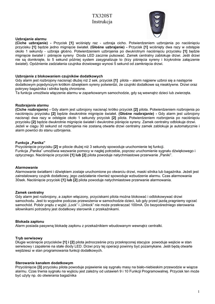 TX320ST Instrukcja Uzbrajanie alarmu (Ciche uzbrajanie) - Przycisk [1] wciśnięty raz - uzbraja cicho. Potwierdzeniem uzbrojenia po naciśnięciu przycisku [1] będzie jedno mignięcie świateł. (Głośne uzbrajanie) - Przycisk [1] wciśnięty dwa razy w odstępie około 1 sekundy - uzbraja głośno. Potwierdzeniem uzbrojenia po dwukrotnym naciśnięciu przycisku [1] będzie mignięcie świateł i piśnięcie syreny Dioda LED zacznie pulsować. Zamek centralny zablokuje drzwi. Jeśli drzwi nie są domknięte, to 5 sekund później system zasygnalizuje to (trzy piśnięcia syreny i trzykrotnie załączenie świateł). Opóźnienie zadziałania czujnika drzwiowego wynosi 5 sekund od zamknięcia drzwi. Uzbrojenie z blokowaniem czujników dodatkowych Gdy alarm jest rozbrojony nacisnąć dłużej niż 2 sek. przycisk [1] pilota – alarm najpierw uzbroi się a następnie dodatkowym pojedynczym krótkim dźwiękiem syreny potwierdzi, że czujniki dodatkowe są nieaktywne. Drzwi oraz pokrywy bagażnika i silnika będą chronione. Ta funkcja umożliwia włączenie alarmu w zaparkowanym samochodzie, gdy są wewnątrz dzieci lub zwierzęta. Rozbrajanie alarmu (Ciche rozbrajanie) - Gdy alarm jest uzbrojony nacisnąć krótko przycisk [2] pilota. Potwierdzeniem rozbrojenia po naciśnięciu przycisku [2] będzie dwukrotnie mignięcie świateł. (Głośne rozbrajanie) - Gdy alarm jest uzbrojony nacisnąć dwa razy w odstępie około 1 sekundy przycisk [2] pilota. Potwierdzeniem rozbrojenia po naciśnięciu przycisku [2] będzie dwukrotnie mignięcie świateł i dwukrotne piśnięcie syreny. Zamek centralny odblokuje drzwi. Jeżeli w ciągu 30 sekund od rozbrojenia nie zostaną otwarte drzwi centralny zamek zablokuje je automatycznie i alarm powróci do stanu uzbrojenia. Funkcja „Panika” Przyciśnięcie przycisku [2] w pilocie dłużej niż 3 sekundy spowoduje uruchomienie tej funkcji. Funkcja „Panika” umożliwia wezwanie pomocy w nagłej potrzebie, poprzez uruchomienie sygnału dźwiękowego i optycznego. Naciśnięcie przyciski [1] lub [2] pilota powoduje natychmiastowe przerwanie „Paniki”. Alarmowanie Alarmowanie światłami i dźwiękiem zostaje uruchomione po otwarciu drzwi, maski silnika lub bagażnika. Jeżeli jest zainstalowany czujnik dodatkowy, jego zadziałanie również spowoduje wzbudzenie alarmu. Czas alarmowania 30sek. Naciśnięcie przyciski [1] lub [2] pilota powoduje natychmiastowe przerwanie alarmowania. Zamek centralny Gdy alarm jest rozbrojony, a zapłon włączony, przyciskami pilota można blokować i odblokowywać drzwi samochodu. Jest to wygodne podczas przewożenia w samochodzie dzieci, lub gdy przed jazdą pragniemy ogrzać samochód. Pobór prądu z wyjść „Lock” i „Unlock” nie może przekraczać 100mA. Do bezpośredniego sterowania siłownikami potrzebny jest dodatkowy sterownik z przekaźnikami. Blokada zapłonu Alarm posiada pasywną blokadę zapłonu z przekaźnikiem wbudowanym wewnątrz centralki. Tryb serwisowy Długie wciśnięcie przycisków [1] i [2] pilota jednocześnie przy przekręconej stacyjce powoduje wejście w stan serwisowy i zapalenie na stałe diody LED. Drzwi przy tej operacji powinny być pozamykane. Jeśli będą otwarte wejdziesz w stan programowania funkcji dodatkowych. Sterowanie kanałem dodatkowym Przyciśnięcie [3] przycisku pilota powoduje pojawienie się sygnału masy na biało-niebieskim przewodzie w wiązce alarmu. Czas trwnia sygnału na wyjściu jest zależny od ustawień 9 i 10 Funkcji Programowalnej. Przycisk ten może być użyty np. do otwierania bagażnika 1 Programowanie funkcji dodatkowych System alarmowy posiada 12 programowalnych funkcji. Ustawienia mogą być regulowane według życzenia klienta. Wejście do trybu programowania: Rozbrój alarm. Otwórz drzwi kierowcy i pozostaw je otwarte. Włącz stacyjkę (ON). Naciśnij jednocześnie przyciski [1] i [2] do momentu pojawienia się długiego sygnału syreny. Przyciskiem [1] pilota przechodzisz do kolejnej funkcji. (np. po przyciśnięciu tego przycisku po raz pierwszy przechodzimy do programowania funkcji nr 1. Usłyszymy piśnięcie syrenki informujące o ustawieniu tej funkcji. Przycisk [2] pilota zmienia te ustawienia również potwierdzając piśnięciami syrenki co zostało zmienione. Aby wyjść z programowania przyciskaj przycisk [1] pilota przechodząc przez wszystkie funkcje i słuchając jakie są ustawienia do momentu usłyszenia długiego sygnału syreny. Uwaga! Dopóki nie wyjdziesz z programowania przyciskiem [1] pilota system pozostaje w tym trybie. Nr funkcj i 1 2 3 4 5 6 7 8 9 10 11 12 Rodzaj funkcji Ustawienia fabryczne Samouzbrojenie Zamykanie zamków przy samouzbrojeniu Blokada drzwi ze stacyjki Ustawienie czasu impulsu na zamek centralny Ilość impulsów na otwarcie zamka Ilość impulsów na zamknięcie zamka Długość impulsu na zamknięcie zamka Czas aktywacji stref chronionych (czujniki) Czas działania dodatkowego kanału Zakres działania dodatkowego kanału Kasowanie samouzbrojenia Sygnalizacja niedomkniętych drzwi Potwierdzenia – 2 krótkie sygnały syrenki Brak Potwierdzenia – 1 krótki sygnał syrenki Brak Brak Brak Brak Brak 1 sek. Czas działania siłowników 1 sek. Zamykanie zamków przy samouzbrajaniu Zamykanie/otwieranie zamków po stacyjce Czas działania siłowników 3 sek. 1 impuls Dwa impulsy na Unlock 1 impuls Jeden impuls na Unlock Jeden impuls na Lock 1 sek. Impuls Lock 1 sek. Po 5 sek. Alarm aktywny po 5 sek. 1 sek. Impuls Lock przedłużony o 40 sek. Alarm aktywny po 40 sek. 1 sek. Tylko przy rozbrojonym alarmie Drzwi lub stacyjka Włączona Tylko przy rozbrojonym alarmie Drzwi lub stacyjka Włączona Samouzbrajanie Dwa impulsy na Lock Długość trzymania przycisku Zawsze Czujnik dodatkowy lub stacyjka Wyłączona Funkcja 1 – Samouzbrojenie. Alarm posiada opcję umożliwiającą automatyczne samouzbrojenie po przypadkowym lub celowym rozbrojeniu alarmu. Otwarcie drzwi samochodu lub przekręcenie stacyj