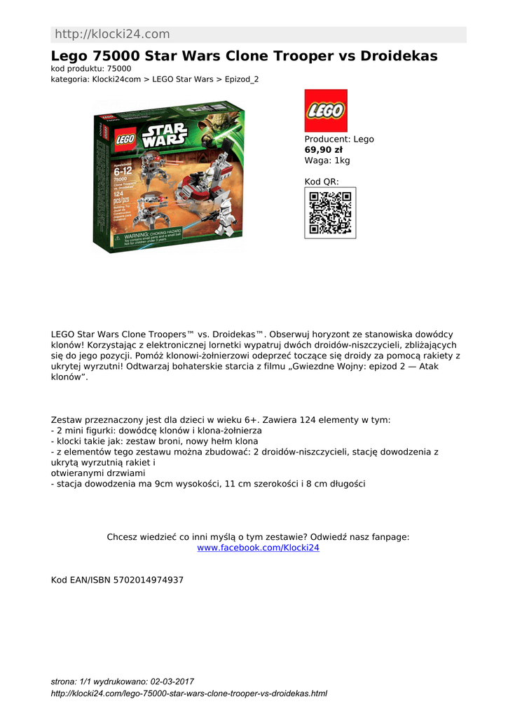 http://klocki24.com Lego 75000 Star Wars Clone Trooper vs Droidekas kod produktu: 75000 kategoria: Klocki24com > LEGO Star Wars > Epizod_2 Producent: Lego 69,90 zł Waga: 1kg Kod QR: LEGO Star Wars Clone Troopers™ vs. Droidekas™. Obserwuj horyzont ze stanowiska dowódcy klonów! Korzystając z elektronicznej lornetki wypatruj dwóch droidów-niszczycieli, zbliżających się do jego pozycji. Pomóż klonowi-żołnierzowi odeprzeć toczące się droidy za pomocą rakiety z ukrytej wyrzutni! Odtwarzaj bohaterskie starcia z filmu „Gwiezdne Wojny: epizod 2 — Atak klonów”. Zestaw przeznaczony jest dla dzieci w wieku 6+. Zawiera 124 elementy w tym: - 2 mini figurki: dowódcę klonów i klona-żołnierza - klocki takie jak: zestaw broni, nowy hełm klona - z elementów tego zestawu można zbudować: 2 droidów-niszczycieli, stację dowodzenia z ukrytą wyrzutnią rakiet i otwieranymi drzwiami - stacja dowodzenia ma 9cm wysokości, 11 cm szerokości i 8 cm długości Chcesz wiedzieć co inni myślą o tym zestawie? Odwiedź nasz fanpage: www.facebook.com/Klocki24 Kod EAN/ISBN 5702014974937 strona: 1/1 wydrukowano: 02-03-2017 http://klocki24.com/lego-75000-star-wars-clone-trooper-vs-droidekas.html