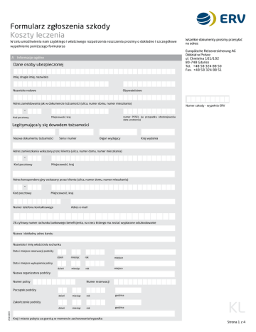 Formularz zgłoszenia szkody Koszty leczenia W celu umożliwienia nam szybkiego i właściwego rozpatrzenia roszczenia prosimy o dokładne i szczegółowe wypełnienie poniższego formularza Wszelkie dokumenty prosimy przesyłać na adres: Europäische Reiseversicherung AG Oddział w Polsce ul. Chmielna 101/102 80-748 Gdańsk Tel. +48 58 324 88 50 Fax. +48 58 324 88 51 A Informacje ogólne Dane osoby ubezpieczonej Imię, drugie imię, nazwisko Nazwisko rodowe Obywatelstwo Adres zameldowania jak w dokumencie tożsamości (ulica, numer domu, numer mieszkania) Numer szkody - wypełnia ERV Kod pocztowy numer PESEL (w przypadku obcokrajowców data urodzenia) Miejscowość, kraj Legitymująca/y się dowodem tożsamości Nazwa dokumentu tożsamości Seria i numer Organ wydający Kraj wydania Adres zamieszkania wskazany przez klienta (ulica, numer domu, numer mieszkania) Kod pocztowy Miejscowość, kraj Adres korespondencyjny wskazany przez klienta (ulica, numer domu, numer mieszkania) Kod pocztowy Miejscowość, kraj Numer telefonu kontaktowego Adres e-mail 26.cyfrowy numer rachunku bankowego beneficjenta, na rzecz którego ma zostać wypłacone odszkodowanie Nazwa i dokładny adres banku Nazwisko i imię właściciela rachunku Data i miejsce rezerwacji podróży dzień miesiąc rok miejsce dzień miesiąc rok miejsce Data i miejsce wykupienia polisy Nazwa organizatora podróży Numer polisy Numer rezerwacji Początek podróży dzień miesiąc rok godzina dzień miesiąc rok godzina 20.10.003 Zakończenie podróży Kraj i miasto pobytu za granicą w momencie zachorowania/wypadku KL Strona 1 z 4 B Dane dotyczące szkody Data zachorowania/ zajścia wypadku dzień miesiąc rok 1. Charakter zachorowania, rodzaj doznanego urazu wraz z diagnozą. Prosimy zamieścić dokładny opis dolegliwości, rodzaju urazu wraz z okolicznościami jego powstania 1.1 Od kiedy poszkodowany cierpiał na tę dolegliwość, kiedy doszło do powstania urazu? 1.2 Data pierwszej wizyty u lekarza dzień miesiąc 1.3 Czy choroba występowała w przeszłości? rok tak nie 1.4 Prosimy podać nazwę i adres zakładu opieki zdrowotnej, do którego należał poszkodowany lub w którym był leczony w okresie ostatnich 12 miesięcy przed datą zawarcia umowy ubezpieczenia. 1.5 Czy do zachorowania/wypadku doszło wskutek: przestępstwa samobójstwa wypadku komunikacyjnego uprawiania sportu - jakiej dyscypliny? wykonywania pracy fizycznej - jakiej? inne - wskutek czego? 1.6 Czy ubezpieczony był pod wpływem alkoholu, leków lub środków odurzających tak nie 1.7 Czy wykonano badanie krwi tak nie 2. Czy wskutek wypadku/choroby ubezpieczony był hospitalizowany? Jeśli tak, to prosimy załączyć kartę leczenia szpitalnego. tak nie Daty hospitalizacji: Od do 20.10.003 dzień dzień miesiąc rok 2.1 W jaki sposób poszkodowany powrócił do kraju zamieszkania? planowanym środkiem transportu karetką ambulansem lotniczym innym - jakim? miesiąc rok samolotem KL Strona 2 z 4 Czy Centrum Pomocy zostało zawiadomione o zdarzeniu? tak nie Jeśli nie, to z jakiego powodu? 3. Prosimy podać dokładny spis poniesionych kosztów Podstawą do zwrotu wydatków jest przedłożenie oryginałów rachunków z tytułu poniesionych kosztów (w razie konieczności prosimy kontynuować na odrębnej kartce). Opis rachunku (np. leki, porada medyczna) Data wystawienia rachunku Kwota i waluta 4. Czy poszkodowany otrzymał już zwrot jakichkolwiek kosztów z innego źródła? Opłacono tak nie tak nie tak nie tak nie tak nie tak nie tak nie tak nie Zgodnie z treścią umowy ubezpieczenia, odszkodowanie lub świadczenie wypłaca się na terytorium Rzeczypospolitej Polskiej, w walucie polskiej, za wyjątkiem kosztów zwracanych bezpośrednio za granicę wystawcom rachunków. Jeśli wysokość roszczenia została określona na podstawie rachunków wystawionych w walucie zagranicznej, a odszkodowanie ma zostać wypłacone w walucie polskiej, przelicza się je na walutę polską według średniego kursu NBP obowiązującego w dniu ustalenia odszkodowania. 4.1 Jeśli tak, prosimy podać nazwę: PLN 4.2 Prosimy podać wysokość otrzymanego zwrotu 4.3 Czy poszkodowany składał wniosek o zwrot jakichkolwiek kosztów? 4.4 Jeśli tak, to do kogo? Nazwa i adres D Dane dotyczące innego ubezpieczyciela 1. Czy poszkodowany posiada inną polisę obejmującą swym zakresem koszty leczenia? tak nie Jeśli tak, prosimy podać nazwę ubezpieczyciela i numer polisy 2. Czy poszkodowany posiada kartę bankową oferująca ubezpieczenie kosztów leczenia? Jeśli tak, prosimy podać nazwę banku, numer karty i nazwę ubezpieczyciela 3. Czy poszkodowany jest objęty prywatnym/dodatkowym ubezpieczeniem zdrowotnym? Jeśli tak, prosimy podać adres, nazwę firmy oraz numer ubezpieczenia lub członkostwa tak tak nie nie Zostałem/-am poinformowany/-a o tym, że Europäische Reiseversicherung AG Oddział w Polsce z siedzibą w Gdańsku, ul. Chmielna 101/102, wpisana do Rejestru Przedsiębiorców Krajowego Rejestru Sądowego, prowadzonego przez Sąd Rejonowy w Gdańsku VII Wydział Gospodarczy Krajowego Rejestru Sądowego, pod numerem KRS 0000214412, NIP 2040000303, Regon 193072350, kapitał zakładowy 52 000 000 EUR, w rozumieniu ustawy z dnia 29.08.1997 r. o ochronie danych osobowych (t.j.: Dz. U. z 2002 r. Nr 101, poz. 926 z późn. zm.) jest administratorem danych osobowych i przetwarza te dane w celu realizacji umowy ubezpieczenia, że mam prawo dostępu do treści moich danych i ich poprawiania oraz, że ich podanie jest dobrowolne. Niniejszym zwalniam lekarzy, a także placówki medyczne, w których leczyłam/leczyłem i leczę się, z obowiązku zachowania tajemnicy lekarskiej oraz wyrażam zgodę na udostępnienie ubezpieczycielowi dokumentacji medycznej (historii choroby) Data Imię i nazwisko oraz podpis ubezpieczonego lub pełnomocnika 20.10.003 Niniejszym potwierdzam, iż podane wyżej informacje są zgodne z prawdą i zdaję sobie sprawę, iż poświadczenie nieprawdy lub