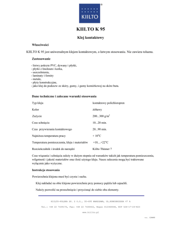 KIILTO K 95 Klej kontaktowy Własciwości KIILTO K 95 jest uniwersalnym klejem kontaktowym, o łatwym stosowaniu. Nie zawiera toluenu. Zastosowanie - listwy pokryte PVC, dywany i płytki, - płytki z linoleum i korka, - uszczelnienia, - laminaty i forniry - metale, - płyty konstrukcyjne, - jako klej do podeszw ze skóry, gumy, i gumy komórkowej na skóre buta. Dane techniczne i zalecane warunki stosowania Typ kleju kontaktowy polichloropren Kolor żółtawy Zużycie 200...300 g/m2 Czas schnięcia 10...20 min. Czas przywierania kontaktowego 20...90 min. Najniższa temperatura pracy + 10°C Temperatura pomieszczenia, kleju i materiałów +18....+22°C Rozcieńczalnik i środek do narzędzi Kiilto Thinner 7 Czas wiązania i schnięcia zależy w dużym stopniu od warunków takich jak temperatura pomieszczenia, wilgotność i jakość materiałów oraz ilość użytego kleju. Nasze zalecenia mogą być traktowane wyłącznie jako wytyczne. Instrukcja stosowania Powierzchnia klejona musi być czysta i sucha. Klej nakładać na obie klejone powierzchnie przy pomocy pędzla lub szpachli. Należy pozwolić na przeschnięcie i przycisnąć do siebie oba elementy. KIILTO–POLSKA SP. Z O.O., 00-695 WARSZAWA, UL.NOWOGRODZKA 47 A Tel.: +48 22 7439176, Fax: +48 22 7430402, Regon 012360048, NIP 526-17-23-823 www.kiilto.pl ver. 12/04/05 BHP Klej zawiera wysokopalne, lotne rozpuszczalniki. W pomieszczeniu pracy należy zapewnić należytą wentylację. Należy stosować z dala od żródeł zapłonu, szczególnie od elektryczności i iskrzącego sprzętu elektrycznego. Należy unikać kontaktu kleju ze skórą (może powodować podrażnienia i wysypkę). Nie wylewać produktu do kanalizacji. Zamykać pojemnik natychmiast po użyciu. Oddzielna Karta Charakterystyki dostępna na zapytanie. Składowanie Kiilto K 95 powinien być przechowywany w dobrze zamkniętych pojemnikach w temperaturze pokojowej, maksymalnie 12 miesięcy. CHRONIĆ PRZED ZAMARZANIEM! Po dłuższym przechowywaniu wymieszać przed użyciem. Uwagi Należy przeprowadzić próbne klejenia przy wprowadzaniu nowych materiałów, maszyn lub technologii. Nasze zalecenia są na podstawie przeprowadzonych badań i najlepszej uzyskanej wiedzy. Ponieważ nie mamy wpływu na sposób stosowania naszych wyrobów i warunki stosowania, nie możemy być odpowiedzialni za uzyskane wyniki. W celu uzyskania dodatkowych informacji prosimy o kontakt z naszym biurem: 09/2008 KIILTO–POLSKA SP. Z O.O., 00-695 WARSZAWA, UL.NOWOGRODZKA 47 A Tel.: +48 22 7439176, Fax: +48 22 7430402, Regon 012360048, NIP 526-17-23-823 www.kiilto.pl ver. 12/04/05