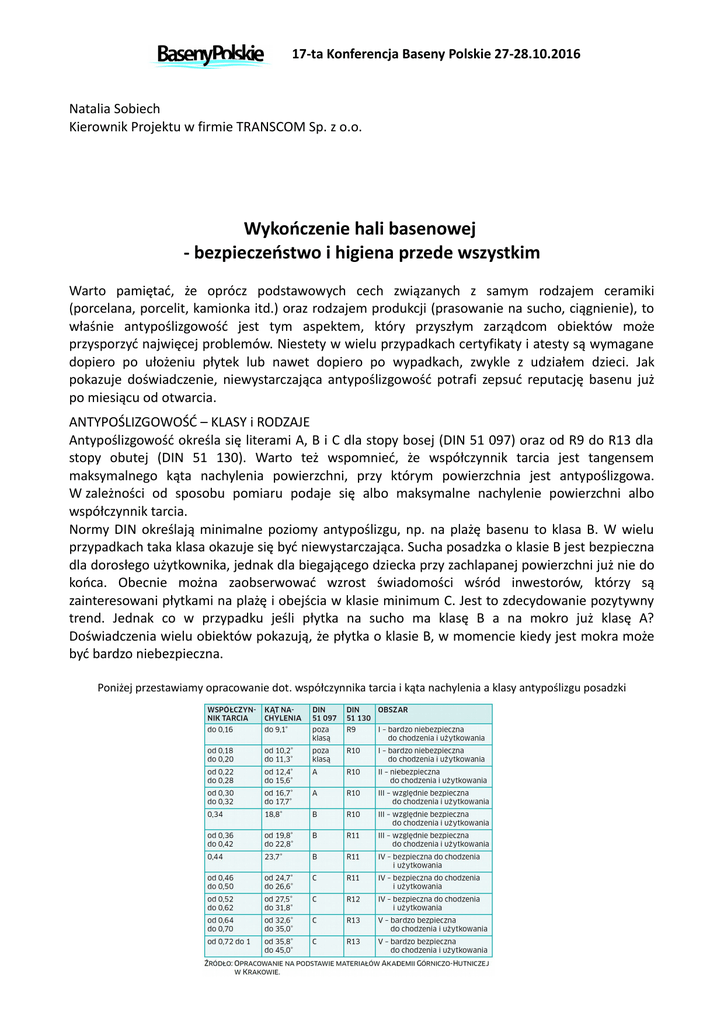 17-ta Konferencja Baseny Polskie 27-28.10.2016 Natalia Sobiech Kierownik Projektu w firmie TRANSCOM Sp. z o.o. Wykończenie hali basenowej - bezpieczeństwo i higiena przede wszystkim Warto pamiętać, że oprócz podstawowych cech związanych z samym rodzajem ceramiki (porcelana, porcelit, kamionka itd.) oraz rodzajem produkcji (prasowanie na sucho, ciągnienie), to właśnie antypoślizgowość jest tym aspektem, który przyszłym zarządcom obiektów może przysporzyć najwięcej problemów. Niestety w wielu przypadkach certyfikaty i atesty są wymagane dopiero po ułożeniu płytek lub nawet dopiero po wypadkach, zwykle z udziałem dzieci. Jak pokazuje doświadczenie, niewystarczająca antypoślizgowość potrafi zepsuć reputację basenu już po miesiącu od otwarcia. ANTYPOŚLIZGOWOŚĆ – KLASY i RODZAJE Antypoślizgowość określa się literami A, B i C dla stopy bosej (DIN 51 097) oraz od R9 do R13 dla stopy obutej (DIN 51 130). Warto też wspomnieć, że współczynnik tarcia jest tangensem maksymalnego kąta nachylenia powierzchni, przy którym powierzchnia jest antypoślizgowa. W zależności od sposobu pomiaru podaje się albo maksymalne nachylenie powierzchni albo współczynnik tarcia. Normy DIN określają minimalne poziomy antypoślizgu, np. na plażę basenu to klasa B. W wielu przypadkach taka klasa okazuje się być niewystarczająca. Sucha posadzka o klasie B jest bezpieczna dla dorosłego użytkownika, jednak dla biegającego dziecka przy zachlapanej powierzchni już nie do końca. Obecnie można zaobserwować wzrost świadomości wśród inwestorów, którzy są zainteresowani płytkami na plażę i obejścia w klasie minimum C. Jest to zdecydowanie pozytywny trend. Jednak co w przypadku jeśli płytka na sucho ma klasę B a na mokro już klasę A? Doświadczenia wielu obiektów pokazują, że płytka o klasie B, w momencie kiedy jest mokra może być bardzo niebezpieczna. Poniżej przestawiamy opracowanie dot. współczynnika tarcia i kąta nachylenia a klasy antypoślizgu posadzki 17-ta Konferencja Baseny Polskie 27-28.10.2016 W obiektach basenowych znajduje się wiele newralgicznych punktów – korona basenu, murki wokół rekreacji, dno brodzika dla dzieci, nogomyjki, posadzka pod prysznicami, czy schody na zjeżdżalnię. Tutaj bezwzględnie powinna być klasa C i to w górnej granicy. Warto by była to klasa C mierzona na mokro, ponieważ powierzchnie te znajdują się albo pod wodą albo są narażone na zachlapania. Coraz częściej dochodzi również do sytuacji, w których płytka ma wykonane badania jedynie na stopę obutą, a klasa antypoślizgu R jest „konwertowana” na klasę dla stopy bosej. Jest to również ryzykowny proceder, ponieważ badania dla bosej i obutej stopy są wykonywane w zależności od techniki pomiaru, za pomocą różnych głowic czy też powierzchni ścierających, które różnią się od siebie twardością i gładkością. O czym warto pamiętać? 1. Klasa antypoślizgu na sucho nie równa się klasie antypoślizgu na mokro. 2. Niedopuszczalne jest określanie antypoślizgu dla bosej stopy na podstawie wyników badań dla stopy obutej. Tutaj konieczne są dwa różne badania. 3. Klasa antypoślizgu na sucho nie jest równa klasie antypoślizgu na mokro! Warto poprosić dostawcę o badania wykonane w szczególności na mokro. 4. Dana klasa określa przedział antypoślizgu. Oprócz samej klasy warto dowiedzieć się, czy dana płytka należy do dolnego, czy górnego przedziału. 5. Płytka antypoślizgowa o wysokiej klasie na sucho może być śliska i niebezpieczna dla użytkowników, gdy powierzchnia jest mokra. 6. Płytka o dobrych właściwościach antypoślizgowych dla stopy obutej może być niebezpieczna dla stopy bosej przy powierzchni mokrej. 7. Deklarowana klasa antypoślizgowa przez producenta nie stanowi certyfikatu czy atestu. W przypadku braku odpowiednich dokumentów można poprosić dostawcę o przedstawienie wyniku raportu z badań antypoślizgowości, na podstawie których jest deklarowany dany poziom. Poza klasą antypoślizgu przy projektowaniu czy też planowaniu remontu warto zwrócić uwagę na, mogłoby się wydawać, niewiele znaczące szczegóły, ale psujące lub poprawiające odbiór obiektu przez gości. Poza odpowiednim poziomem antypoślizgowości warto pamiętać o niskiej chłonności wodą, odwodnieniach liniowych, wyobleniach i minimalizacji ilości tworzywowych elementów. CHŁONNOŚĆ WODĄ O chłonności wodą mówi norma DIN EN ISO 10545-3 i oznacza się ją w informacjach technicznych producentów wyrobów ceramicznych jako E. Właściwość tę mierzy się procentowym wzrostem wagi próbki poddanej działaniu gorącej wody w stosunku do próbki suchej. Przedziały grup chłonności wodą wyglądają następująco: 1. E <= 0,5% - grupa Ia 2. 0,5% < E <= 3% - grupa Ib 3. 3% < E <= 6% - grupa IIa w przypadku wyrobów prasowanych na sucho oraz IIa-1 i AIIa-2 gdy ceramika jest ciągniona 4. 6% < E <= 10% - grupa IIb w przypadku wyrobów prasowanych na sucho oraz IIb-1 i IIb-2 gdy ceramika jest ciągniona 5. E > 10% - grupa III Warto pamiętać o tej właściwości, gdyż niska chłonność wodą jest równoznaczna z niską porowatością i wyższym poziomem higieny. Dzięki wysokiej temperatura wypalania porcelany basenowej - ok 1300 stopni C (dla porównania płytki kamionkowe wypala się w temperaturze od ok 360 stopni C) porowatość powierzchni jest minimalna, przez co rzeczywista chłonność wodą jest bliska 0%. 17-ta Konferencja Baseny Polskie 27-28.10.2016 ODWODNIENIE LINIOWE Odwonienie liniowe jest alternatywą dla popularnych odwodnieni punktowych plaży, natrysków, szatni części mokrych. Odwodnienie liniowe charakteryzuje się koniecznością wykonania jedynie dwóch spadków w stronę kształtek, a nie jak w przypadku odwodnienia punktowego- aż czterech spadków, które wymagają układania płytek na tzw. zakładkę oraz ich cięcia. Odwodnienie liniowe jest rozwiązan