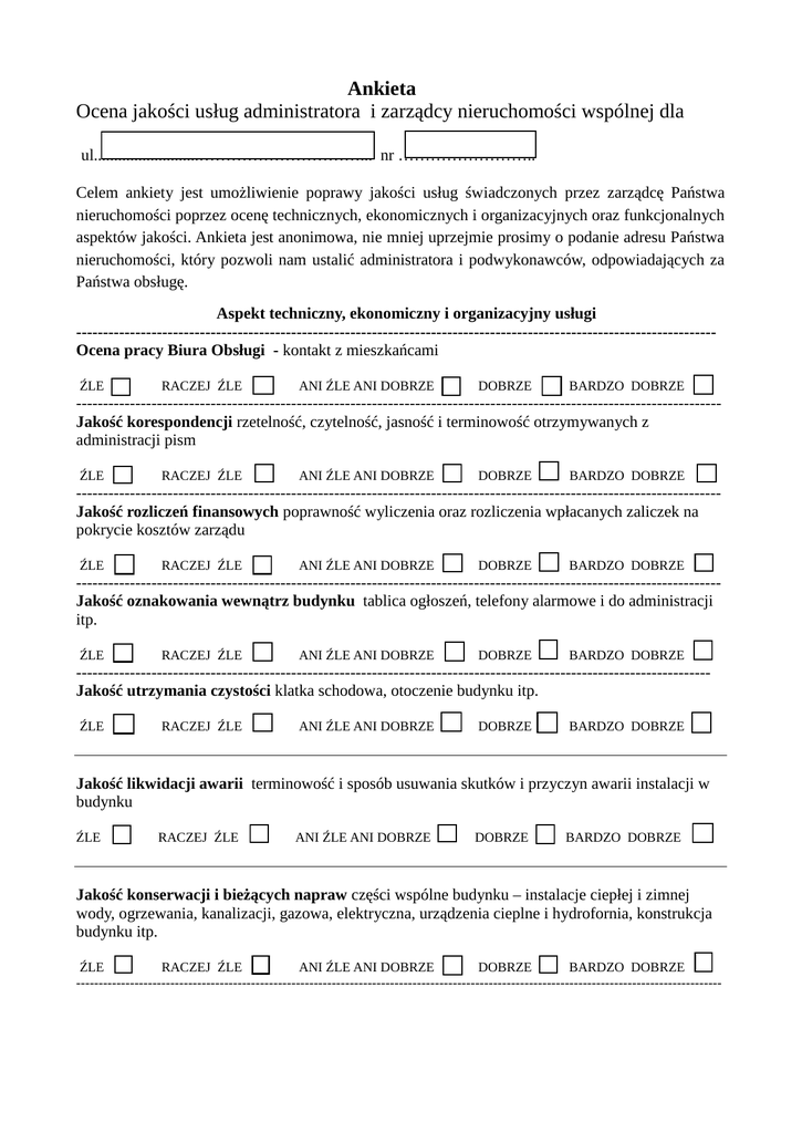 Ankieta Ocena jakości usług administratora i zarządcy nieruchomości wspólnej dla ul..........................…………………………... nr …………………….. Celem ankiety jest umożliwienie poprawy jakości usług świadczonych przez zarządcę Państwa nieruchomości poprzez ocenę technicznych, ekonomicznych i organizacyjnych oraz funkcjonalnych aspektów jakości. Ankieta jest anonimowa, nie mniej uprzejmie prosimy o podanie adresu Państwa nieruchomości, który pozwoli nam ustalić administratora i podwykonawców, odpowiadających za Państwa obsługę. Aspekt techniczny, ekonomiczny i organizacyjny usługi ----------------------------------------------------------------------------------------------------------------------Ocena pracy Biura Obsługi - kontakt z mieszkańcami ŹLE RACZEJ ŹLE ANI ŹLE ANI DOBRZE DOBRZE BARDZO DOBRZE ŹLE RACZEJ ŹLE ANI ŹLE ANI DOBRZE DOBRZE BARDZO DOBRZE ŹLE RACZEJ ŹLE ANI ŹLE ANI DOBRZE DOBRZE BARDZO DOBRZE ŹLE RACZEJ ŹLE ANI ŹLE ANI DOBRZE DOBRZE BARDZO DOBRZE ŹLE RACZEJ ŹLE ANI ŹLE ANI DOBRZE DOBRZE BARDZO DOBRZE -----------------------------------------------------------------------------------------------------------------------Jakość korespondencji rzetelność, czytelność, jasność i terminowość otrzymywanych z administracji pism -----------------------------------------------------------------------------------------------------------------------Jakość rozliczeń finansowych poprawność wyliczenia oraz rozliczenia wpłacanych zaliczek na pokrycie kosztów zarządu -----------------------------------------------------------------------------------------------------------------------Jakość oznakowania wewnątrz budynku tablica ogłoszeń, telefony alarmowe i do administracji itp. ---------------------------------------------------------------------------------------------------------------------Jakość utrzymania czystości klatka schodowa, otoczenie budynku itp. Jakość likwidacji awarii terminowość i sposób usuwania skutków i przyczyn awarii instalacji w budynku ŹLE RACZEJ ŹLE ANI ŹLE ANI DOBRZE DOBRZE BARDZO DOBRZE Jakość konserwacji i bieżących napraw części wspólne budynku – instalacje ciepłej i zimnej wody, ogrzewania, kanalizacji, gazowa, elektryczna, urządzenia cieplne i hydrofornia, konstrukcja budynku itp. ŹLE RACZEJ ŹLE ANI ŹLE ANI DOBRZE DOBRZE BARDZO DOBRZE ------------------------------------------------------------------------------------------------------------------------------------------------ Jakość organizacji zebrań terminowość, wcześniejsze przekazanie projektów budżetów i uchwał, sposób prowadzenia zebrania, itp. ŹLE RACZEJ ŹLE ANI ŹLE ANI DOBRZE DOBRZE BARDZO DOBRZE Aspekt funkcjonalny usługi -----------------------------------------------------------------------------------------------------------------------Kompetencja administrator jest fachowo przygotowany oraz posiada niezbędną wiedzę do świadczenia usług ŹLE RACZEJ ŹLE ANI ŹLE ANI DOBRZE DOBRZE BARDZO DOBRZE ------------------------------------------------------------------------------------------------------------------------------------------------ Odpowiedzialność (terminowość) administrator przestrzega umówionych z mieszkańcami terminów działań ŹLE RACZEJ ŹLE ANI ŹLE ANI DOBRZE DOBRZE BARDZO DOBRZE ------------------------------------------------------------------------------------------------------------------------------------------------ Niezawodność (solidność) administrator codziennie utrzymuje standard usług, dotrzymuje obietnic i wykonuje rzetelnie swoje zadania ŹLE RACZEJ ŹLE ANI ŹLE ANI DOBRZE DOBRZE BARDZO DOBRZE Dostępność administrator jest przystępny i łatwo nawiązać z nim kontakt (np. telefoniczny) ŹLE RACZEJ ŹLE ANI ŹLE ANI DOBRZE DOBRZE BARDZO DOBRZE Uprzejmość administrator jest uprzejmy, okazuje zainteresowanie i szacunek dla mieszkańca ŹLE RACZEJ ŹLE ANI ŹLE ANI DOBRZE DOBRZE BARDZO DOBRZE Wiarygodność mieszkańcy oceniają, że administrator jest prawdomówny i troszczy się o nich i ich budynek ŹLE RACZEJ ŹLE ANI ŹLE ANI DOBRZE DOBRZE BARDZO DOBRZE Zrozumienie administrator stara się zrozumieć indywidualne potrzeby mieszkańców; podejmuje starania by je zaspokajać ŹLE RACZEJ ŹLE ANI ŹLE ANI DOBRZE DOBRZE BARDZO DOBRZE ----------------------------------------------------------------------------------------------------------------------------------------------- Ogólna ocena GGKO ŹLE RACZEJ ŹLE ANI ŹLE ANI DOBRZE DOBRZE BARDZO DOBRZE UWAGI ………………………………………………………………………………………………………… ………………………………………………………………………………………………………… ………………………………………………………………………………………………………… :\ĤOLM