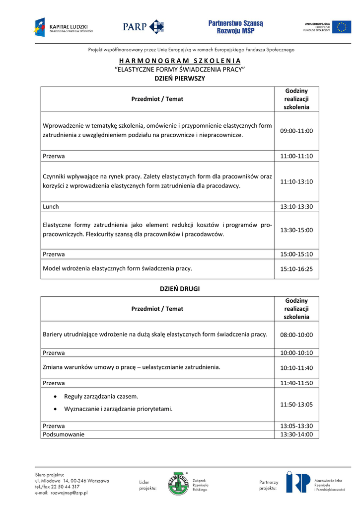 HARMONOGRAM SZKOLENIA “ELASTYCZNE FORMY ŚWIADCZENIA PRACY” DZIEŃ PIERWSZY Przedmiot / Temat Godziny realizacji szkolenia Wprowadzenie w tematykę szkolenia, omówienie i przypomnienie elastycznych form zatrudnienia z uwzględnieniem podziału na pracownicze i niepracownicze. 09:00-11:00 Przerwa 11:00-11:10 Czynniki wpływające na rynek pracy. Zalety elastycznych form dla pracowników oraz korzyści z wprowadzenia elastycznych form zatrudnienia dla pracodawcy. 11:10-13:10 Lunch 13:10-13:30 Elastyczne formy zatrudnienia jako element redukcji kosztów i programów propracowniczych. Flexicurity szansą dla pracowników i pracodawców. 13:30-15:00 Przerwa 15:00-15:10 Model wdrożenia elastycznych form świadczenia pracy. 15:10-16:25 DZIEŃ DRUGI Przedmiot / Temat Godziny realizacji szkolenia Bariery utrudniające wdrożenie na dużą skalę elastycznych form świadczenia pracy. 08:00-10:00 Przerwa 10:00-10:10 Zmiana warunków umowy o pracę – uelastycznianie zatrudnienia. 10:10-11:40 Przerwa 11:40-11:50 Reguły zarządzania czasem. Wyznaczanie i zarządzanie priorytetami. Przerwa Podsumowanie 11:50-13:05 13:05-13:30 13:30-14:00