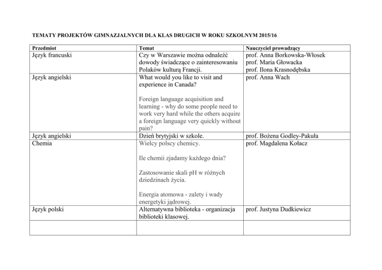 TEMATY PROJEKTÓW GIMNAZJALNYCH DLA KLAS DRUGICH W ROKU SZKOLNYM 2015/16 Przedmiot Temat Nauczyciel prowadzący Język francuski Czy w Warszawie można odnaleźć dowody świadczące o zainteresowaniu Polaków kulturą Francji. What would you like to visit and experience in Canada? prof. Anna Borkowska-Włosek prof. Maria Głowacka prof. Ilona Krasnodębska prof. Anna Wach Język angielski Język angielski Chemia Foreign language acquisition and learning - why do some people need to work very hard while the others acquire a foreign language very quickly without pain? Dzień brytyjski w szkole. prof. Bożena Godley-Pakuła prof. Magdalena Kołacz Wielcy polscy chemicy. Ile chemii zjadamy każdego dnia? Zastosowanie skali pH w różnych dziedzinach życia. Język polski Energia atomowa - zalety i wady energetyki jądrowej. Alternatywna biblioteka - organizacja biblioteki klasowej. prof. Justyna Dudkiewicz Historia Dynastie panujące we Francji. prof. Maciej Tomaszewski Matematyka Kultura szlachecka w Polsce. Trójkąty i inne figury magiczne. prof. Jadwiga Adamczyk prof. Michał Myziak Równania diofantyczne. WOS Łamigłówki i zadania różne. Powązki – szlak wybitnych kobiet (blog/strona www/album/wystawa) Obiekty i instytucje publiczne na szlaku wokół Twojej szkoły (blog/album/wystawa) Patronka szkoły Narcyza Żmichowska i jej kontynuatorki, entuzjastki, emancypantki, feministki, sufrażystki (blog/strona www/album/wystawa) prof. Urszula Ratuszyńska Informatyka Bezpieczeństwo w cyberprzestrzeni. prof. Sebastian Makara Nowe technologie w informatyce. Technika Stworzenie strony www o wybranej dzielnicy/dzielnicach Warszawy. Telefon – wczoraj i dziś. prof. Sebastian Makara Ewolucja samochodu. Geografia Fizyka Wybrani wynalazcy z dziedziny techniki. Barwa – cykle – rytmy (krajobraz, ruch obiegowy Ziemi, pory roku, cykl geologiczny). Energia – źródła energii elektrycznej, rodzaje elektrowni. Spadek swobodny ciała – badanie ruchu za pomocą materiału wideo. (nakręcenie filmu, komórką, smartfonem i badanie zależności drogi od czasu i prędkości od czasu na podstawie poklatkowej analizy materiału wideo) Wyznaczanie ciepła właściwego wody. (pomiar temperatury podczas prof. Anna Piłatowicz prof. Mirosław Należyty ogrzewania pewnej ilości wody za pomocą grzałki elektrycznej/czajnika elektrycznego o znanej mocy lub ochładzanie wody za pomocą odpowiedniej ilości lodu) UWAGA: praca z termometrem i potencjalnie gorącymi substancjami.
