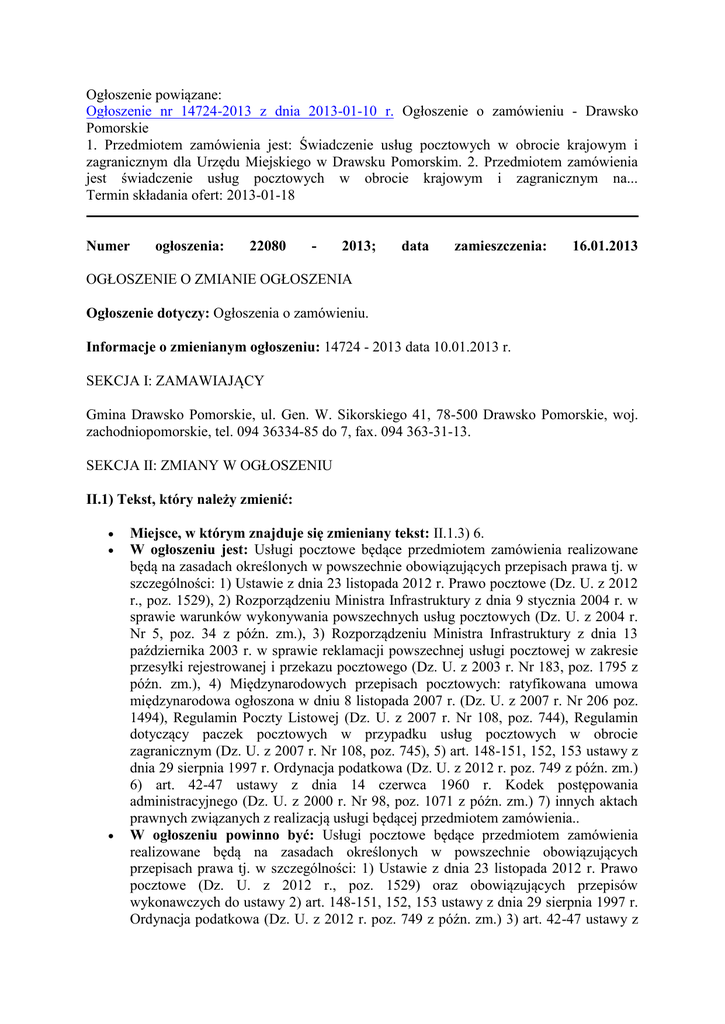 Ogłoszenie powiązane: Ogłoszenie nr 14724-2013 z dnia 2013-01-10 r. Ogłoszenie o zamówieniu - Drawsko Pomorskie 1. Przedmiotem zamówienia jest: Świadczenie usług pocztowych w obrocie krajowym i zagranicznym dla Urzędu Miejskiego w Drawsku Pomorskim. 2. Przedmiotem zamówienia jest świadczenie usług pocztowych w obrocie krajowym i zagranicznym na... Termin składania ofert: 2013-01-18 Numer ogłoszenia: 22080 - 2013; data zamieszczenia: 16.01.2013 OGŁOSZENIE O ZMIANIE OGŁOSZENIA Ogłoszenie dotyczy: Ogłoszenia o zamówieniu. Informacje o zmienianym ogłoszeniu: 14724 - 2013 data 10.01.2013 r. SEKCJA I: ZAMAWIAJĄCY Gmina Drawsko Pomorskie, ul. Gen. W. Sikorskiego 41, 78-500 Drawsko Pomorskie, woj. zachodniopomorskie, tel. 094 36334-85 do 7, fax. 094 363-31-13. SEKCJA II: ZMIANY W OGŁOSZENIU II.1) Tekst, który należy zmienić: Miejsce, w którym znajduje się zmieniany tekst: II.1.3) 6. W ogłoszeniu jest: Usługi pocztowe będące przedmiotem zamówienia realizowane będą na zasadach określonych w powszechnie obowiązujących przepisach prawa tj. w szczególności: 1) Ustawie z dnia 23 listopada 2012 r. Prawo pocztowe (Dz. U. z 2012 r., poz. 1529), 2) Rozporządzeniu Ministra Infrastruktury z dnia 9 stycznia 2004 r. w sprawie warunków wykonywania powszechnych usług pocztowych (Dz. U. z 2004 r. Nr 5, poz. 34 z późn. zm.), 3) Rozporządzeniu Ministra Infrastruktury z dnia 13 października 2003 r. w sprawie reklamacji powszechnej usługi pocztowej w zakresie przesyłki rejestrowanej i przekazu pocztowego (Dz. U. z 2003 r. Nr 183, poz. 1795 z późn. zm.), 4) Międzynarodowych przepisach pocztowych: ratyfikowana umowa międzynarodowa ogłoszona w dniu 8 listopada 2007 r. (Dz. U. z 2007 r. Nr 206 poz. 1494), Regulamin Poczty Listowej (Dz. U. z 2007 r. Nr 108, poz. 744), Regulamin dotyczący paczek pocztowych w przypadku usług pocztowych w obrocie zagranicznym (Dz. U. z 2007 r. Nr 108, poz. 745), 5) art. 148-151, 152, 153 ustawy z dnia 29 sierpnia 1997 r. Ordynacja podatkowa (Dz. U. z 2012 r. poz. 749 z późn. zm.) 6) art. 42-47 ustawy z dnia 14 czerwca 1960 r. Kodek postępowania administracyjnego (Dz. U. z 2000 r. Nr 98, poz. 1071 z późn. zm.) 7) innych aktach prawnych związanych z realizacją usługi będącej przedmiotem zamówienia.. W ogłoszeniu powinno być: Usługi pocztowe będące przedmiotem zamówienia realizowane będą na zasadach określonych w powszechnie obowiązujących przepisach prawa tj. w szczególności: 1) Ustawie z dnia 23 listopada 2012 r. Prawo pocztowe (Dz. U. z 2012 r., poz. 1529) oraz obowiązujących przepisów wykonawczych do ustawy 2) art. 148-151, 152, 153 ustawy z dnia 29 sierpnia 1997 r. Ordynacja podatkowa (Dz. U. z 2012 r. poz. 749 z późn. zm.) 3) art. 42-47 ustawy z dnia 14 czerwca 1960 r. Kodek postępowania administracyjnego (Dz. U. z 2000 r. Nr 98, poz. 1071 z późn. zm.) 4) innych aktach prawnych związanych z realizacją usługi będącej przedmiotem zamówienia, w tym aktach wewnętrznych wydanych przez Wykonawcę na podstawie art. 21 ustawy Prawo Pocztowe. Miejsce, w którym znajduje się zmieniany tekst: IV.4.4). W ogłoszeniu jest: Termin składania wniosków o dopuszczenie do udziału w postępowaniu lub ofert: 18.01.2013 godzina 09:00, miejsce: Urząd Miejski w Drawsku Pomorskim ul. Gen. W. Sikorskiego 41, 78-500 Drawsko Pomorskie pok. 210 (sekretariat).. W ogłoszeniu powinno być: Termin składania wniosków o dopuszczenie do udziału w postępowaniu lub ofert: 22.01.2013 godzina 09:00, miejsce: Urząd Miejski w Drawsku Pomorskim ul. Gen. W. Sikorskiego 41, 78-500 Drawsko Pomorskie pok. 210 (sekretariat)..