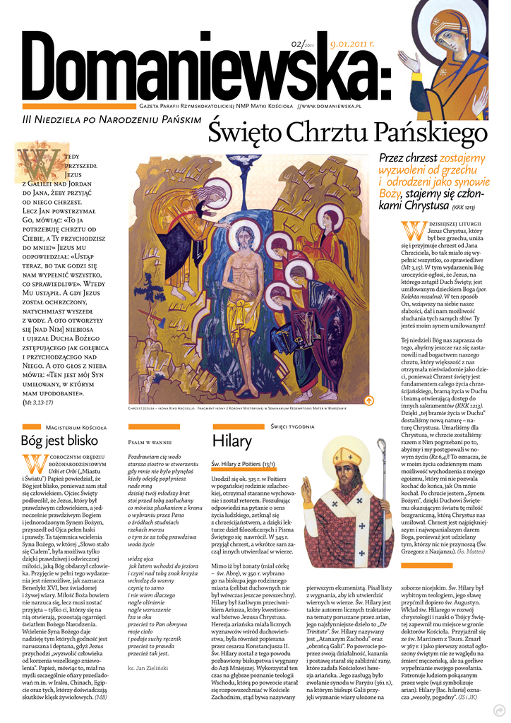 02/2011 9.01.2011 r. Gazeta Parafii Rzymskokatolickiej NMP Matki Kościoła //www.domaniewska.pl III Niedziela po Narodzeniu Pańskim tedy przyszedł Jezus z Galilei nad Jordan do Jana, żeby przyjąć od niego chrzest. Lecz Jan powstrzymał Go, mówiąc: «To ja potrzebuję chrztu od Ciebie, a Ty przychodzisz do mnie?» Jezus mu odpowiedział: «Ustąp teraz, bo tak godzi się nam wypełnić wszystko, co sprawiedliwe». Wtedy Mu ustąpił. A gdy Jezus został ochrzczony, natychmiast wyszedł z wody. A oto otworzyły się [nad Nim] niebiosa i ujrzał Ducha Bożego zstępującego jak gołębica i przychodzącego nad Niego. A oto głos z nieba mówił: «Ten jest mój Syn umiłowany, w którym mam upodobanie». (Mt 3,13-17) Przez chrzest zostajemy wyzwoleni od grzechu i odrodzeni jako synowie Boży, stajemy się członkami Chrystusa (KKK 1213) W dzisiejszej liturgii Jezus Chrystus, który był bez grzechu, uniża się i przyjmuje chrzest od Jana Chrzciciela, bo tak miało się wypełnić wszystko, co sprawiedliwe (Mt 3,15). W tym wydarzeniu Bóg uroczyście ogłosi, że Jezus, na którego zstąpił Duch Święty, jest umiłowanym dzieckiem Boga (por. Kolekta mszalna). W ten sposób On, wziąwszy na siebie nasze słabości, dał i nam możliwość słuchania tych samych słów: Ty jesteś moim synem umiłowanym! Chrzest Jezusa – ikona Kiko Argüello. Fragment ikony z Korony Misteryjnej w Seminarium Redemptoris Mater w Warszawie Święci tygodnia Magisterium Kościoła Bóg jest blisko W corocznym orędziu bożonarodzeniowym Urbi et Orbi („Miastu i Światu”) Papież powiedział, że Bóg jest blisko, ponieważ sam stał się człowiekiem. Ojciec Święty podkreślił, że Jezus, który był prawdziwym człowiekiem, a jednocześnie prawdziwym Bogiem i jednorodzonym Synem Bożym, przyszedł od Ojca pełen łaski i prawdy. Ta tajemnica wcielenia Syna Bożego, w której „Słowo stało się Ciałem”, była możliwa tylko dzięki prawdziwej i odwiecznej miłości, jaką Bóg obdarzył człowieka. Przyjęcie w pełni tego wydarzenia jest niemożliwe, jak zaznacza Benedykt XVI, bez świadomej i żywej wiary. Miłość Boża bowiem nie narzuca się, lecz musi zostać przyjęta – tylko ci, którzy się na nią otwierają, pozostają ogarnięci światłem Bożego Narodzenia. Wcielenie Syna Bożego daje nadzieję tym których godność jest naruszana i deptana, gdyż Jezus przychodzi „wyzwolić człowieka od korzenia wszelkiego zniewolenia”. Papież, mówiąc to, miał na myśli szczególnie ofiary prześladowań m.in. w Iraku, Chinach, Egipcie oraz tych, którzy doświadczają skutków klęsk żywiołowych. (MB) Święto Chrztu Pańskiego Psalm w wannie Pozdrawiam cię wodo starsza siostro w stworzeniu gdy mnie nie było płynęłaś kiedy odejdę popłyniesz nade mną dzisiaj twój młodszy brat stoi przed tobą zasłuchany co mówisz pluskaniem z kranu o wybraniu przez Pana o źródłach studniach rzekach morzu o tym że za tobą prawdziwa woda życie widzę ojca jak latem wchodzi do jeziora i czyni nad tobą znak krzyża wchodzę do wanny czynię to samo i nie wiem dlaczego nagłe olśnienie nagłe wzruszenie łza w oku przecież to Pan obmywa moje ciało i podaje suchy ręcznik przecież to prawda przecież tak jest. ks. Jan Zieliński Hilary Św. Hilary z Poitiers (13/1) Urodził się ok. 315 r. w Poitiers w pogańskiej rodzinie szlacheckiej, otrzymał staranne wychowanie i został retorem. Poszukując odpowiedzi na pytanie o sens życia ludzkiego, zetknął się z chrześcijaństwem, a dzięki lekturze dzieł filozoficznych i Pisma Świętego się nawrócił. W 345 r. przyjął chrzest, a wkrótce sam zaczął innych utwierdzać w wierze. Mimo iż był żonaty (miał córkę – św. Abrę), w 350 r. wybrano go na biskupa jego rodzinnego miasta (celibat duchownych nie był wówczas jeszcze powszechny). Hilary był żarliwym przeciwnikiem Ariusza, który kwestionował bóstwo Jezusa Chrystusa. Herezja ariańska miała licznych wyznawców wśród duchowieństwa, była również popierana przez cesarza Konstancjusza II. Św. Hilary został z tego powodu pozbawiony biskupstwa i wygnany do Azji Mniejszej. Wykorzystał ten czas na głębsze poznanie teologii Wschodu, którą po powrocie starał się rozpowszechniać w Kościele Zachodnim, stąd bywa nazywany pierwszym ekumenistą. Pisał listy z wygnania, aby ich utwierdzić wiernych w wierze. Św. Hilary jest także autorem licznych traktatów na tematy poruszane przez arian, jego najsłynniejsze dzieło to „De Trinitate”. Św. Hilary nazywany jest „Atanazym Zachodu” oraz „obrońcą Galii”. Po powrocie poprzez swoją działalność, kazania i postawę starał się zabliźnić rany, które zadała Kościołowi herezja ariańska. Jego zasługą było zwołanie synodu w Paryżu (361 r.), na którym biskupi Galii przyjęli wyznanie wiary ułożone na Tej niedzieli Bóg nas zaprasza do tego, abyśmy jeszcze raz się zastanowili nad bogactwem naszego chrztu, który większość z nas otrzymała nieświadomie jako dzieci, ponieważ Chrzest święty jest fundamentem całego życia chrześcijańskiego, bramą życia w Duchu i bramą otwierającą dostęp do innych sakramentów (KKK 1213). Dzięki „tej bramie życia w Duchu” dostaliśmy nową naturę – naturę Chrystusa. Umarliśmy dla Chrystusa, w chrzcie zostaliśmy razem z Nim pogrzebani po to, abyśmy i my postępowali w nowym życiu (Rz 6,4)! To oznacza, że w moim życiu codziennym mam możliwość wychodzenia z mojego egoizmu, który mi nie pozwala kochać do końca, jak On mnie kochał. Po chrzcie jestem „Synem Bożym”, dzięki Duchowi Świętemu okazującym światu tę miłość bezgraniczną, którą Chrystus nas umiłował. Chrzest jest najpiękniejszym i najwspanialszym darem Boga, ponieważ jest udzielany tym, którzy nic nie przynoszą (Św. Grzegorz z Nazjanzu). (ks. Matteo) soborze nicejskim. Św. Hilary był wybitnym teologiem, jego sławę przyćmił dopie