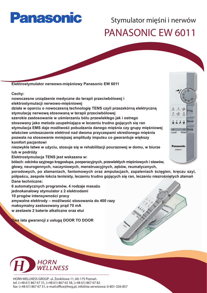 Stymulator mięśni i nerwów PANASONIC EW 6011 Elektrostymulator nerwowo-mięśniowy Panasonic EW 6011 Cechy: nowoczesne urządzenie medyczne do terapii przeciwbólowej i elektrostymulacji nerwowo-mięśniowej działa w oparciu o nowoczesną technologię TENS czyli przezskórną elektryczną stymulację nerwową stosowaną w terapii przeciwbólowej szerokie zastosowanie w uśmierzaniu bólu przewlekłego jak i ostrego stosowany jako metoda uzupełniająca w leczeniu trudno gojących się ran stymulacja EMS daje możliwość pobudzania danego mięśnia czy grupy mięśniowej właściwe umieszczenie elektrod nad dwoma przyczepami określonego mięśnia pozwala na stosowanie mniejszej amplitudy impulsu co gwarantuje większy komfort pacjentowi niezwykle łatwe w użyciu, stosuje się w rehabilitacji pourazowej w domu, w biurze lub w podróży Elektrostymulacja TENS jest wskazana w: bólach: odcinka szyjnego kręgosłupa, pooperacyjnych, przewlekłych mięśniowych i stawów, przewlekłych głowy, neurogennych, naczyniowych, menstruacyjnych, zębów, reumatycznych, porodowych, po złamaniach, fantomowych oraz amputacjach, zapaleniach ścięgien, kręczu szyi, półpaścu, zespole łokcia tenisisty, leczeniu trudno gojących się ran, leczeniu niezrośniętych złamań Dane techniczne: 6 automatycznych programów, 4 rodzaje masażu jednokanałowy stymulator z 2 elektrodami 10 progów intensywności pracy zmywalne elektrody – możliwość stosowania do 400 razy maksymalny zastosowany prąd 70 mA w zestawie 2 baterie alkaliczne oraz etui Dwa lata gwarancji z usługą DOOR TO DOOR HORN WELLNESS GROUP. ul. Żonkilowa 11, 60-175 Poznań. tel. (+48 61) 867 67 31, (+48 61) 867 65 58, (+48 61) 867 67 82 fax: (+48 61) 867 67 31, e-mail:[email protected], infolinia serwisowa: 0-801-326-857