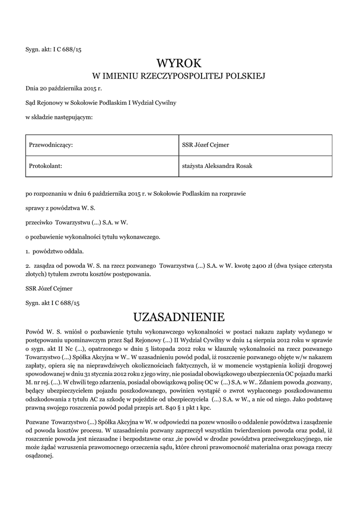 Sygn. akt: I C 688/15 WYROK W IMIENIU RZECZYPOSPOLITEJ POLSKIEJ Dnia 20 października 2015 r. Sąd Rejonowy w Sokołowie Podlaskim I Wydział Cywilny w składzie następującym: Przewodniczący: SSR Józef Cejmer Protokolant: stażysta Aleksandra Rosak po rozpoznaniu w dniu 6 października 2015 r. w Sokołowie Podlaskim na rozprawie sprawy z powództwa W. S. przeciwko Towarzystwu (...) S.A. w W. o pozbawienie wykonalności tytułu wykonawczego. 1. powództwo oddala. 2. zasądza od powoda W. S. na rzecz pozwanego Towarzystwa (...) S.A. w W. kwotę 2400 zł (dwa tysiące czterysta złotych) tytułem zwrotu kosztów postępowania. SSR Józef Cejmer Sygn. akt I C 688/15 UZASADNIENIE Powód W. S. wniósł o pozbawienie tytułu wykonawczego wykonalności w postaci nakazu zapłaty wydanego w postępowaniu upominawczym przez Sąd Rejonowy (...) II Wydział Cywilny w dniu 14 sierpnia 2012 roku w sprawie o sygn. akt II Nc (...), opatrzonego w dniu 5 listopada 2012 roku w klauzulę wykonalności na rzecz pozwanego Towarzystwo (...) Spółka Akcyjna w W.. W uzasadnieniu powód podał, iż roszczenie pozwanego objęte w/w nakazem zapłaty, opiera się na nieprawdziwych okolicznościach faktycznych, iż w momencie wystąpienia kolizji drogowej spowodowanej w dniu 31 stycznia 2012 roku z jego winy, nie posiadał obowiązkowego ubezpieczenia OC pojazdu marki M. nr rej. (...). W chwili tego zdarzenia, posiadał obowiązkową polisę OC w (...) S.A. w W.. Zdaniem powoda ,pozwany, będący ubezpieczycielem pojazdu poszkodowanego, powinien wystąpić o zwrot wypłaconego poszkodowanemu odszkodowania z tytułu AC za szkodę w pojeździe od ubezpieczyciela (...) S.A. w W., a nie od niego. Jako podstawę prawną swojego roszczenia powód podał przepis art. 840 § 1 pkt 1 kpc. Pozwane Towarzystwo (...) Spółka Akcyjna w W. w odpowiedzi na pozew wnosiło o oddalenie powództwa i zasądzenie od powoda kosztów procesu. W uzasadnieniu pozwany zaprzeczył wszystkim twierdzeniom powoda oraz podał, iż roszczenie powoda jest niezasadne i bezpodstawne oraz ,że powód w drodze powództwa przeciwegzekucyjnego, nie może żądać wzruszenia prawomocnego orzeczenia sądu, które chroni prawomocność materialna oraz powaga rzeczy osądzonej. Na rozprawie strony reprezentowane przez pełnomocników, nie zmieniły swojego stanowiska. Sąd Rejonowy ustalił i zważył co następuje. W dniu 31 stycznia 2012 roku na skrzyżowaniu ulic (...) w W., doszło do kolizji drogowej, w trakcie której sprawca zdarzenia W. S., kierujący pojazdem marki M. nr rej. (...), nie zachował należytej ostrożności podczas manewru skrętu w prawo z ulicy podporządkowanej w ulicę uprzywilejowaną, wymusił pierwszeństwo przejazdu i uderzył w pojazd marki T. (...) o nr rej. (...), wyrządzając szkodę w tym pojeździe. Na miejsce zdarzenia nie była wzywana policja, strony spisały oświadczenie, w którym W. S. przyznał się do winy w spowodowaniu przedmiotowej kolizji drogowej. Sprawca zdarzenia, posiadał obowiązkową polisę OC w (...) S.A. w W. o numerze polisy (...). Poszkodowany zlikwidował szkodę w swoim pojeździe u swojego ubezpieczyciela w ramach ubezpieczenia Autocasco Standard o numerze polisy (...). Ubezpieczyciel poszkodowanego wypłacił mu z tytułu umowy AC odszkodowanie w kwocie 24 030 zł. Po dokonaniu wypłaty, ubezpieczyciel wystąpił z powództwem przeciwko W. S. o zwrot wypłaconego odszkodowania. W. S. poinformował Towarzystwo (...) Spółka Akcyjna w W. o posiadaniu polisy OC w (...) S.A oraz poinformował (...) S.A. o wystąpieniu z w/w powództwem przeciwko niemu. (...) S.A. potwierdziło fakt istnienia umowy ubezpieczenia OC dla pojazdu powoda w momencie zaistnienia przedmiotowego zdarzenia i obiecało powodowi, iż pozytywnie załatwi dla niego sprawę. Sąd Rejonowy (...) II Wydział Cywilny, wydał w dniu 14 sierpnia 2012 roku w sprawie o sygn. akt II Nc (...) przeciwko W. S. nakaz zapłaty w postępowaniu upominawczym, w którym nakazał mu zapłatę na rzecz Towarzystwa (...) Spółka Akcyjna w W. kwoty 24 030 zł wraz z odsetkami w wysokości ustawowej od dnia 12 lipca 2012 roku do dnia zapłaty oraz kosztami procesu w kwocie 2 718 zł w terminie dwóch tygodni od otrzymania nakazu albo wniesienie w tym terminie sprzeciwu. Nakaz zapłaty skutecznie doręczony został do rąk W. S.. W. S. nie wniósł od tego nakazu sprzeciwu. Brak zaskarżenia tego nakazu, spowodował uprawomocnienia się jego w całości. Po złożeniu przez Towarzystwo (...) Spółka Akcyjna w W. wniosku o nadanie klauzuli wykonalności, nakaz zapłaty opatrzony został w dniu 5 listopada 2012 roku w klauzulę wykonalności i jako tytuł wykonawczy stał się podstawą egzekucji. Na wniosek wierzyciela i w oparciu o przedstawiony przez niego w/w tytuł wykonawczy, Komornik Sądowy przy Sądzie Rejonowym w (...) (...) (...) (...), wszczęła postępowanie egzekucję w sprawie o sygn. akt Km (...) o świadczenie objęte tym tytułem. Niniejsze powództwo o pozbawienie tego tytułu wykonawczego wykonalności wraz z wnioskiem o udzielenie zabezpieczenia poprzez zawieszenie w/w postępowania egzekucyjnego, powód złożył w dniu 22 maja 2015 roku. Sąd Rejonowy w S. P. I Wydział Cywilny postanowieniem z dnia 24 sierpnia 2015 roku, zawiesił w/w postępowanie egzekucyjne, do czasu prawomocnego zakończenia niniejszego postępowania. Wierzyciel wnioskiem z dnia 10 czerwca 2015 roku, ograniczył postępowanie egzekucyjne do kosztów sądowych wynikających z tytułu oraz kosztów zastępstwa procesowego w postępowaniu egzekucyjnym (dowód: pozew o zapłatę k. 9-12, nakaz zapłaty k. 14-15, zaświadczenie z (...) k. 16-17, pisma z akt sprawy egzekucyjnej Km (...) k. 18-24,38, zawieszenie postępowania k. 39, akta sprawy II Nc (...) nakaz zapłaty k. 15 wraz z aktami szkody z dnia 31 stycznia 2012 roku, akta postępowania egzekucyjnego Km (...): wniosek o wszczęcie egzekucji k.1, tytuł wykonawczy k. 3, zawiadomienie o wszczęciu, z