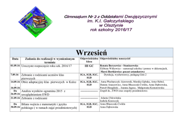 Wrzesień Data Zadania do realizacji w wymienionym terminie 01.09.16 Uroczyste rozpoczęcie roku szk. 2016/17 Zebranie z rodzicami uczniów klas pierwszych 14.09.16 Obóz adaptacyjny klas pierwszych w Kulce 7.09.16 16.09.16 Do Analiza wyników egzaminu 2015 z 26.09.16 uwzględnieniem EWD 21.09.16 Zebranie z rodzicami Do Bilans wejścia z matematyki i języka 30.09.16 polskiego ( w ramach zajęć przedmiotowych) Odpowiedzialna Odpowiedzialny nauczyciel klasa Renata Borysewicz - Staniszewska Elżbieta Witkowicz – samorząd szkolny i pomoc w dekoracjach, Marci Bortkiewicz- poczet sztandarowy Dyrekcja, wychowawcy, pedagog Gim 2 IGA, IGB, IGC, IGD III GC IGA, IGB, IGC, Anna Płocharczyk- kierownik, Monika Gębska, Artur Hebel, Danuta Anaszewicz, Anna Błaszczak-Ćwikła, Anna Dąbrowska, IGD Paweł Okręglicki , Joanna Jagosz, Małgorzata Komorowska -------------------- Zespół ds., EWD oraz zespoły przedmiotowe. Jolanta Chlewińska Izabela Krawczyk IGA, IGB, IGC, Anna Błaszczak-Ćwikła Anna Dąbrowska IGD -------------------- Październik Data Odpowiedzialna Odpowiedzialny nauczyciel klasa Zadania do realizacji w wymienionym terminie II LO Samorząd szkolny 14.10.16 Dzień Edukacji Narodowej 05.10.16 Otrzęsiny klas pierwszych - program i oprawa II GC -------------------------Elżbieta Witkowicz Katarzyna Czerniawska, wychowawcy klas pierwszych artystyczna Listopad 07.11.16 Obchody Święta Niepodległości 11.11.16 09.11.16 Indywidualne konsultacje dla rodziców. 24.11.16 Dyskoteka Andrzejkowa listopad Szkolne etapy konkursów wojewódzkich III GB ------------Samorząd szkolny wszystkie Artur Hebel wszyscy Elżbieta Witkowicz Artur Hebel Małgorzata Komorowska Paweł Okręglicki Wiesław Pulkowski Jolanta Chyl Magdalena Davidson Zespoły przedmiotowe Grudzień Data Zadania do realizacji w wymienionym terminie 7.12.16 Zebranie z rodzicami. 5.12.16- Egzamin Próbny - strona techniczna 9.12.16 Odpowiedzialna klasa Odpowiedzialny nauczyciel --------------------- Anna Przegrodzka Paweł Okręglicki Joanna Dondzik-Pająk II GD Spotkanie Wigilijne dla pracowników ZSO 1 godz.12.00 II GB - program I GD – strona techniczna Chór Szkolny – 22.12.16 oprawa muzyczna Samorząd Szkolny-ogólna pomoc w godzinach 8.30-11.30 odbędą się klasowe Samorządy spotkania wigilijne. klasowe Irmgarda Kardahs Ewa Bednarczyk Joanna Jagosz Do Wystawienie propozycji ocen semestralnych 22.12.16 (propozycje będą wystawione w librusie) wszyscy 23.12.16 Przerwa Świąteczna 01.01.17 ------------------------------- Anna Przegrocka Elżbieta Witkowicz Za organizację spotkań wigilijnych w klasach odpowiedzialni są wychowawcy i wychowawcy wspierający ------------------------------ Styczeń Data Zadania do realizacji w wymienionym terminie 04.01.17 Indywidualne konsultacje z rodzicami (informacja o proponowanych ocenach semestralnych) 12.01.17 Bal karnawałowy dla dzieci pracowników ZSO 1 16.01.17 Wystawienie ostatecznych semestralnych do ocen klasyfikacyjnych godz. 14.00 18.01.17 Klasyfikacyjna rada pedagogiczna. Odpowiedzialna Odpowiedzialny nauczyciel klasa ---------------- II LO wszyscy ----------------------------------- --------------- Wszyscy nauczyciele ---------------- 23.01.17 Ferie zimowe -5.02.17 ---------------- Wychowawcy klas Wszyscy nauczyciele ------------------------------ Do Sprawozdania zespołów przedmiotowych za 25.01.17 okres I-go semestru 2016/17 ---------------- Przewodniczący zespołów przedmiotowych LUTY 23.01.17 Ferie zimowe -5.02.17 11.02.17 Bal Gimnazjalny (Przystań) sobota 15.02.17 Dyskoteka Karnawałowo – Walentynkowa Do Podsumowanie osiągnięć uczniów na 20.02.17 zakończenie I-go semestru oraz roku szkolnego. Uzupełnienie odpowiednich gablot. 22.02.17 Rada pedagogiczna podsumowująca pierwszy semestr. ---------------III GA III GC Samorząd szkolny IIGD --------------- -----------------------------Marcin Bortkiewicz Renata Borysewicz Staniszewska, Polonez - Elżbieta Witkowicz i Paweł Okręglicki, Konferansjerka – Grażyna Budzyńska Elżbieta Witkowicz, Marcin Bortkiewicz Artur Hebel, Henryk Zinkiewicz Wiesław Pulkowski, Anna Płocharczyk Jolanta Maj, I. Kozakiewicz Joanna Dondzik-Pająk Dyrekcja Marzec 8.03.17 Indywidualne konsultacje dla rodziców. 1.03.17- Egzamin Próbny - strona techniczna 3.03.17 8.03.17 Szkolny Dzień Dziewcząt. Dzień Kobiet. -------------I GC Samorząd szkolny wszyscy Anna Dąbrowska E. Witkowicz Kwiecień 05.04.17 Spotkanie z rodzicami --------------- 08.04.17 Dzień otwarty szkoły wszystkie 13.04.17 Przerwa świąteczna 18.04.17 19.04.17- Egzamin Gimnazjalny, dni wolne od 21.04.17 zajęć dydaktyczno-wychowawczych ----------------II GC Piotr Jurecki Małgorzata Komorowska Anna Płocharczyk – program i koordynacja, Beata Krawczyńska, Joanna Zubel – nauczanie dwujęzyczne Iwona Kozakiewicz – dekoracje Elżbieta Witkowicz – samorząd Gim 2 i dekoracje Wiesław Pulkowski – obsługa informatyczna i fotograficzna W tym dniu obecni są wszyscy nauczyciele. --------------------------------Katarzyna Czerniawska Maj 02.05.17 Dzień wolny od zajęć dydaktyczno04.05.1705.05.17 08.05.17 17.05.17 wychowawczych. Szkolne obchody Święta Kostytujcji 3 Maja Dzień wolny od zajęć dydaktycznowychowawczych (matura z języka angielskiego) Indywidualne konsultacje dla rodziców ---------- --------------------------------------------- III GB Artur Hebel ----------------- ------------------------------------------- -------------- wszyscy Czerwiec Do Ustalenie propozycji ocen 06.06.17 końcoworocznych wszystkie wszyscy 07.06.17 Zebrania z rodzicami – informacja o wszystkie Anna Płocharczyk Karol Suszczewicz wszystkie wszyscy proponowanych ocenach końcoworocznmych. Do Wystawienie ostatecznych 19.06.17 końcoworocznych ocen klasyfikacyjnych 20.06.17 Rada pedagogiczna - klasyfikacja końcoworoczna. 21.06.17 Dzień Patrona 21.06.17 Dzień Sportu 21.06.17 Podsumowanie sukcesów uczniowskich ---------I GD I GC Chór Szkolny Samorząd Szkolny III