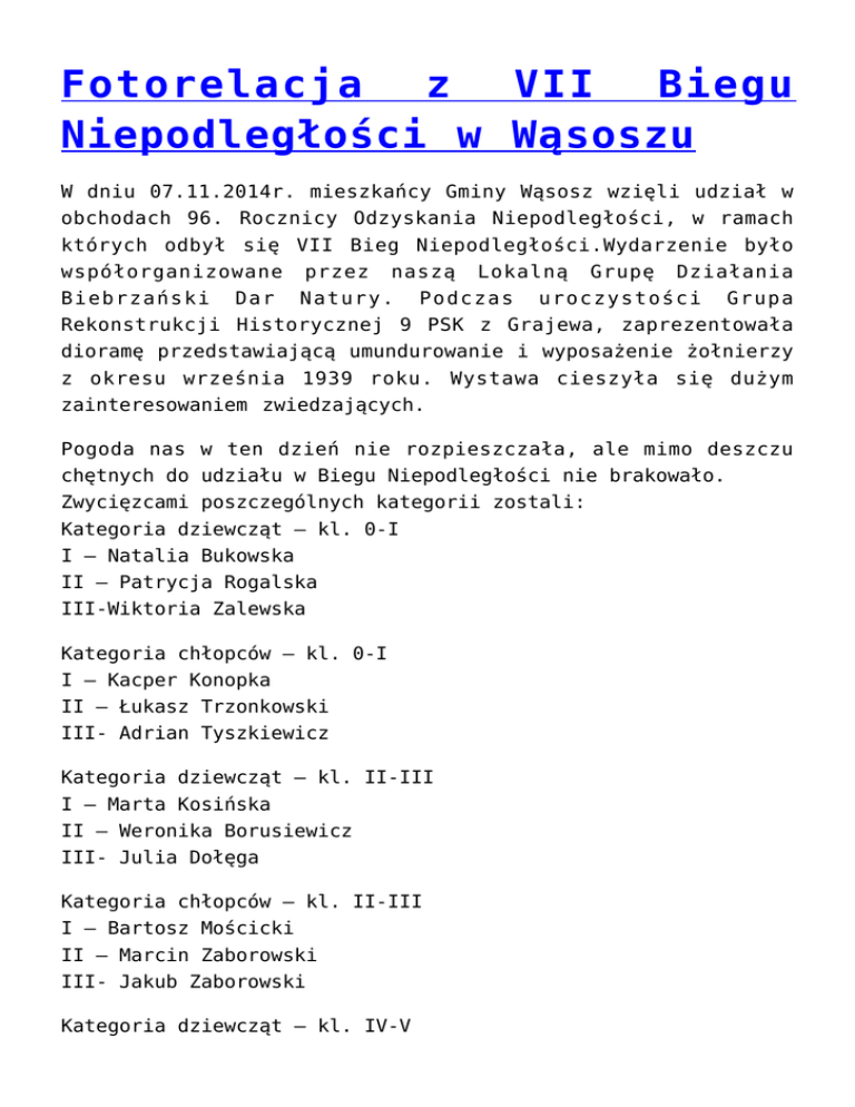 Fotorelacja z VII Biegu Niepodległości w Wąsoszu W dniu 07.11.2014r. mieszkańcy Gminy Wąsosz wzięli udział w obchodach 96. Rocznicy Odzyskania Niepodległości, w ramach których odbył się VII Bieg Niepodległości.Wydarzenie było współorganizowane przez naszą Lokalną Grupę Działania Biebrzański Dar Natury. Podczas uroczystości Grupa Rekonstrukcji Historycznej 9 PSK z Grajewa, zaprezentowała dioramę przedstawiającą umundurowanie i wyposażenie żołnierzy z okresu września 1939 roku. Wystawa cieszyła się dużym zainteresowaniem zwiedzających. Pogoda nas w ten dzień nie rozpieszczała, ale mimo deszczu chętnych do udziału w Biegu Niepodległości nie brakowało. Zwycięzcami poszczególnych kategorii zostali: Kategoria dziewcząt – kl. 0-I I – Natalia Bukowska II – Patrycja Rogalska III-Wiktoria Zalewska Kategoria chłopców – kl. 0-I I – Kacper Konopka II – Łukasz Trzonkowski III- Adrian Tyszkiewicz Kategoria dziewcząt – kl. II-III I – Marta Kosińska II – Weronika Borusiewicz III- Julia Dołęga Kategoria chłopców – kl. II-III I – Bartosz Mościcki II – Marcin Zaborowski III- Jakub Zaborowski Kategoria dziewcząt – kl. IV-V I – Aleksandra Ciecierska II – Zuzanna Polakowska III- Natalia Sulewska Kategoria chłopców – kl. IV-V I – Kacper Rogalski II – Piotr Drobiński III- Mateusz Truszkowski Kategoria dziewcząt – kl. VI-IG I – Paulina Sulewska II – Natalia Samełko III- Klaudia Bogusz Kategoria chłopców – kl. VI-IG I – Tomasz Borusiewicz II – Dawid Ogonowski III- Kacper Polakowski Kategoria dziewcząt – IIG-IIIG I – Joanna Grzymkowska II – Magdalena Brodowska III- Adriana Milewska Kategoria chłopców – IIG-IIIG I – Radosław Kuczewski II – Krystian Chrzanowski III- Patryk Gardocki Kategoria OPEN I – Kamil Bugnacki II – Patryk Trzonkowski III- Kamil Gawrych