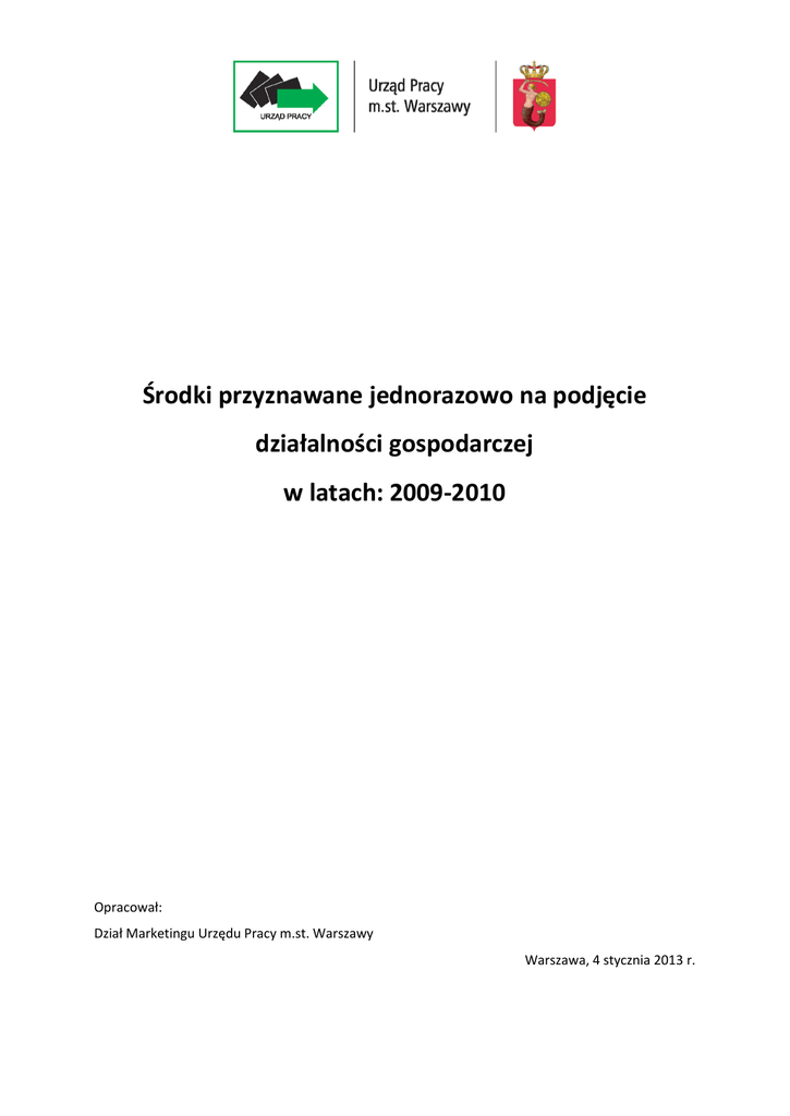Środki przyznawane jednorazowo na podjęcie działalności gospodarczej w latach: 2009-2010 Opracował: Dział Marketingu Urzędu Pracy m.st. Warszawy Warszawa, 4 stycznia 2013 r. Wstęp Na podstawie art. 46 ust. 1 pkt. 2 ustawy z dnia 20 kwietnia 2004 r. (t.j. Dz.U. z 2008 r. Nr. 69, poz.415 z późn. zm.) o promocji zatrudnienia i instytucjach rynku pracy starosta z Funduszu Pracy może przyznać bezrobotnemu jednorazowo środki na podjęcie działalności gospodarczej, w tym na pokrycie kosztów pomocy prawnej, konsultacji i doradztwa związanych z podjęciem tej działalności, w wysokości określonej w umowie. Udzielenie jednorazowo dotacji na podjęcie działalności gospodarczej wiąże się z wyłączeniem bezrobotnego z ewidencji powiatowego urzędu pracy. W związku z powyższym, ta forma aktywizacji bezrobotnych z założenia charakteryzuje się zawsze 100 % efektywnością związaną z samozatrudnieniem. Metodologia Aby przedstawić najbardziej pełny obraz losów osób, które podjęły działalność gospodarczą przy wsparciu środków Urzędu Pracy m.st. Warszawy zostało przeprowadzone dwuetapowe badanie, które objęło 791 osób. Osoby biorące udział w badaniu to osoby bezrobotne, które uzyskały środki finansowe z Funduszu Pracy (FP) lub Europejskiego Funduszu Społecznego (EFS) w latach 2009 – 2010 (608 przebadanych osób uzyskało środki z EFS, w ramach projektu „Rynek Pracy Czeka”, 183 osoby uzyskały środki z FP). Osoby te po otrzymaniu środków finansowych podjęły działalność gospodarczą i stały się przedsiębiorcami. Zgodnie z zapisami ustawy wysokość przyznanych środków nie przekraczała 6-krotności przeciętnego wynagrodzenia (kwota ta średnio wynosiła ok. 18.500 zł). Pierwszy etap badania polegał na przeprowadzeniu badania ilościowego, realizowanego w październiku 2012r. z wykorzystaniem ankiety wysyłanej drogą pocztową. Zawierała ona 16 pytań (otwartych, półotwartych, zamkniętych) oraz metryczkę, która obejmowała m.in. informacje dotyczące płci, wieku wykształcenia oraz sytuacji zawodowej respodnenta/tki. W celu zapewnienia optymalnego zwrotu danych w badaniu ilościowym, ankieta została również przygotowana w formie formularza on-line. Niestety wersja ankiety wypełnianej za pośrednictwem internetu, mimo iż wydawało nam się, że będzie popularniejsza nie cieszyła się zainteresowaniem respondentów. Najczęściej ankiety odsyłano w formie papierowej. W liście sformułowanym do respondentów prosiliśmy o wypełnienie i odesłanie ankiet do dnia 30 października 2012r. Ankiety spływały jednak również w listopadzie a ostatnie nawet w połowie grudnia. Badanie ankietowe miało na celu poznanie subiektywnych opinii osób, które skorzystały ze wsparcia urzędu pracy i założyły firmę. Celem tego etapu było poznanie umiejscowienia działalności na rynku, a w szczególności poznanie opinii właścicieli firm w aspekcie ich doświadczeń w prowadzeniu własnego biznesu, jak też planów rozwoju przedsiębiorstwa, zatrudnienia pracowników i rekrutacji, kondycji finansowej, specyfiki profilu działalności i ewentualnych zmian pod tym kątem, barier utrudniających prowadznie firmy, przyczyn sukcesów lub niepowodzenia. 2 Chcieliśmy poznać opinie naszych beneficjentów również co do tego czy pomoc finansowa jaka została im udzielona była rzeczywiście niezbędna przy realizacji koncepcji własnego biznesu, czy bez jej udzielenia firmy rzeczywiście by nie powstały i czy dokonane zakupy były kluczowymi dla prowadzenia działalności. Drugi etap badania był realizowany w listopadzie 2012r. obejmował analizę danych zastanych zebranych w Centralnej Ewidencji i Informacji o Działalności Gospodarczej (CEIDG) oraz w systemie informatycznym urzędu pracy Syriusz. Celem tych analiz było ustalenie realnego statusu firmy jaki ma ona aktualnie na rynku, w kwestii prowadzenia działalności gospodarczej, jej zamknięcia czy zawieszenia. Analizie poddane zostały również następujące dane: czas pozostawania w rejestrze osób bezrobotnych, dzień uzyskania dotacji na rozpoczęcie działalności firmy oraz fakt powrotu do grupy bezrobotnych po zamknięciu (zawieszeniu) przedsięwzięcia. Status 791 firm został sprawdzony w Centralnej Ewidencji Informacji o Działalności Gospodarczej, będącej elektronicznym rejestrem firm oraz w systemie informatycznym urzędu pracy, a także wysłano ankietę badawczą do ww. grupy osób. Zwrot z ogólnej liczby ankiet ukształtował się na poziomie 23,1%. Zaprezentowane w opracowaniu dane pochodzą również ze źródeł własnych Urzędu Pracy m. st. Warszawy i dotyczą lat 2009 – 2010. Procedurą badawczą na obydwu etapach badania objęto 791 osób, które uzyskały jednorazowo środki za pośrednictwem urzędu i które zgodnie z ustawą z dnia 29 sierpnia 1997 r. o ochronie danych osobowych (Dz. U. z 2002 r., Nr 101 poz. 926 z późn. zm.) wyraziły zgodę na przetwarzanie danych osobowych na potrzeby badań realizowanych lub zlecanych przez urząd, których celem było przeprowadzenie monitoringu działalności gospodarczej, rozpoczętej w związku z otrzymanymi jednorazowo środkami. Opracowanie w pierwszej części oparto na trzech podstawowych parametrach takich jak: 1. Wiek osób, którym udzielono dotacji Przyjęto podział na 6 przedziałów wiekowych: 18 lat - 24 lata , 25 lat – 34 lata , 35 lat – 44 lata, 45 lat – 54 lata, 55 lat – 59 lat, 60 lat – 64 lata. 2. Wykształcenie osób, którym udzielono dotacji 3. Rodzaj działalności gospodarczej na którą udzielono dotacji / Branże (wg Polskiej Klasyfikacji Działalności - PKD) 4. Kontynuacja/ Zawieszenie/ Zaprzestanie działalności 3 I. Wiek Na 791 przebadanych osób, które w latach 2009 - 2010 r. otrzymały jednorazowo środki na rozpoczęcie działalności gospodarczej, najliczniejszą grupę stanowiły osoby w wieku 25 - 34 lata - 398 osób, co stanowi 50,3% ogółu przyzna