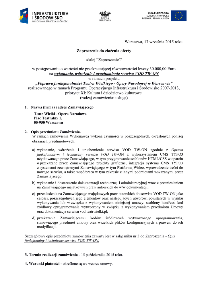 Warszawa, 17 września 2015 roku Zaproszenie do złożenia oferty /dalej ”Zaproszenie”/ w postępowaniu o wartości nie przekraczającej równowartości kwoty 30.000,00 Euro na wykonanie, wdrożenie i uruchomienie serwisu VOD TW-ON w ramach projektu „Poprawa funkcjonalności Teatru Wielkiego - Opery Narodowej w Warszawie” realizowanego w ramach Programu Operacyjnego Infrastruktura i Środowisko 2007-2013, priorytet XI: Kultura i dziedzictwo kulturowe. (rodzaj zamówienia: usługa) 1. Nazwa (firma) i adres Zamawiającego Teatr Wielki - Opera Narodowa Plac Teatralny 1, 00-950 Warszawa 2. Opis przedmiotu Zamówienia. W ramach zamówienia Wykonawca wykona czynności w poszczególnych, określonych poniżej obszarach przedmiotowych: a) wykonanie, wdrożenie i uruchomienie serwisu VOD TW-ON zgodnie z Opisem funkcjonalnym i techniczny serwisu VOD TW-ON z wykorzystaniem CMS TYPO3 użytkowanego przez Zamawiającego, w tym przygotowanie szablonów HTML/CSS w oparciu o przekazane przez Zamawiającego projekty graficzne, integracja systemu CMS TYPO3 z systemami zewnętrznymi Zamawiającego w tym Platformą Wideo, wprowadzenie treści do nowego serwisu, a także współpraca w tym zakresie z innymi podmiotami wskazanymi przez Zamawiającego; b) wykonanie i dostarczenie dokumentacji technicznej i administracyjnej wraz z przeniesieniem na Zamawiającego majątkowych praw autorskich do w/w dokumentacji; c) przeniesienie na Zamawiającego majątkowych praw autorskich do serwisu VOD TW-ON jako całości, poszczególnych jego elementów oraz następujących utworów, powstałych w wyniku wykonywania lub w związku z wykonywaniem niniejszej umowy: szablony html/css, kod źródłowy oprogramowania wytworzony w związku z wykonywaniem przedmiotu Umowy oraz dokumentacja serwisu vod.teatrwielki.pl; d) przekazanie Zamawiającemu kodów źródłowych wytworzonego oprogramowania, stanowiącego przedmiot umowy oraz wszelkich plików konfiguracyjnych z prawem do ich modyfikacji. Szczegółowy opis przedmiotu zamówienia zawarty jest w załączniku nr 3 do Zaproszenia - Opis funkcjonalny i techniczny serwisu VOD TW-ON. 3. Termin realizacji zamówienia - 15 października 2015 roku. 4. Warunki płatności - określone są we wzorze umowy. 5. Warunki udziału 1) W zakresie posiadania wiedzy i doświadczenia - Wykonawca zrealizował w ciągu ostatnich 3 lat przed upływem terminu składania ofert (a jeżeli okres prowadzenia działalności jest krótszy - w tym okresie): a. co najmniej 2 (dwie) usługi polegające budowie serwisu internetowego z wykorzystaniem technologii zarządzania treścią i CMS, przy czym: I. przynajmniej jedna z tych usług zawierała rozwiązanie polegające na oprogramowaniu integracji systemu CMS z przynajmniej jednym systemem zewnętrznym na zasadzie komunikacji webserwis lub cyklicznego procesu przenoszącego dane pomiędzy bazami danych na potrzeby prezentacji tych treści w portalu www; II. przynajmniej jeden z tych serwisów wykonany był w oparciu o system CMS TYPO3; b. wartość budowy systemu serwisów i oprogramowania, dla co najmniej dwóch z tych usług (bez kosztów sprzętu, utrzymania i łączy) była nie mniejsza niż 50 000 zł brutto 2) W zakresie dysponowania odpowiednim potencjałem kadrowym - Wykonawca będzie dysponował następującym personelem: a. co najmniej 1(jedną) osobą przeznaczoną do zarządzania projektem i kontaktem z Zamawiającym, która w ciągu 3 lat przed upływem terminu składania ofert kierowała, co najmniej 3 (trzema) projektami informatycznymi, przy czym przedmiotem przynajmniej 2 (dwóch) z nich było zaprojektowanie i wdrożenie serwisu internetowego lub aplikacji webowej, a wartość przynajmniej jednego z nich była nie mniejsza niż 50 000 zł brutto; b. co najmniej 2 (dwoma) ekspertami informatykami-programistami, spośród których: I. co najmniej jeden w ciągu 3 lat przed upływem terminu składania ofert zrealizował co najmniej po 3 (trzy) projekty dotyczące wykonania i wdrożenia aplikacji webowej, oraz sporządzania dokumentacji; II. co najmniej 1 (jeden) posiada certyfikat potwierdzający znajomość języka oprogramowania systemu CMS Typo3, III. co najmniej 1 (jeden) wykonał przynajmniej 1 (jedno) samodzielne rozszerzenie funkcjonalności systemu CMS na poziomie programistycznym, a nie tylko konfiguracji CMS oraz sporządził dokumentację wykonanego oprogramowania; IV. co najmniej 1 (jeden) jest specjalistą w zakresie technologii frontendowych (html/css,javascript); V. co najmniej 1 (jeden) wykonał oprogramowanie integracji systemu CMS z innymi systemami zewnętrznymi; *Ocena spełnienia warunków udziału w postępowaniu nastąpi według formuły spełnia/nie spełnia na podstawie oświadczenia Wykonawcy o spełnianiu wszystkich warunków udziału w postępowaniu. 6. Sposób przygotowania Oferty oraz miejsce i termin składania ofert: Ofertę sporządzoną według formularza stanowiącego załącznik nr 1 do Zaproszenia, zgodnie z wyborem Wykonawcy, należy złożyć w następujących formach: a) osobiście lub przesyłką poleconą/kurierską, w formie papierowej, na adres: Teatr Wielki Opera Narodowa, Plac Teatralny 1, 00-950 Warszawa, Kancelaria główna pokój A-148 I piętro, wejście od ul. Moliera 5 recepcja IV, b) w wersji elektronicznej (podpisany skan) na adres e-mail [email protected], c) faxem na numer Kancelarii głównej Zamawiającego: (22) 826 04 23 w nieprzekraczalnym terminie: do dnia 22.09.2015 roku, do godziny 14.00 (decyduje data i godzina wpływu). W przypadku złożenia/przesłania oferty do Kancelarii głównej Zamawiającego, za termin złożenia oferty uznaje się termin jej wpływu do Zamawiającego potwierdzony stosowną pieczątką wpływu. W przypadku, gdy wykonawca będzie składał ofertę w formie papierowej powinien ją odpowiednio oznaczyć podając nazwę postępowania. W celu zapewnienia porównywalności wszystkich ofert, Zamawiający, z zachowaniem zasady równego traktowania Wykona