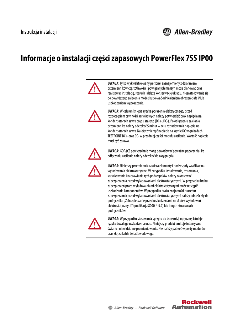 Instrukcja instalacji Informacje o instalacji części zapasowych PowerFlex 755 IP00 UWAGA: Tylko wykwalifikowany personel zaznajomiony z działaniem przemienników częstotliwości i powiązanych maszyn może planować oraz realizować instalację, rozruch i dalszą konserwację układu. Niezastosowanie się do powyższego zalecenia może skutkować odniesieniem obrażeń ciała i/lub uszkodzeniem wyposażenia. UWAGA: W celu uniknięcia ryzyka porażenia elektrycznego, przed rozpoczęciem czynności serwisowych należy potwierdzić brak napięcia na kondensatorach szyny prądu stałego (DC+, DC-). Po odłączeniu zasilania przemiennika należy odczekać 5 minut w celu rozładowania napięcia na kondensatorach szyny. Należy zmierzyć napięcie na szynie DC w gniazdach TESTPOINT DC+ oraz DC- w przedniej części modułu zasilania. Wartość napięcia musi być zerowa. UWAGA: GORĄCE powierzchnie mogą powodować poważne poparzenia. Po odłączeniu zasilania należy odczekać do ostygnięcia. UWAGA: Niniejszy przemiennik zawiera elementy i podzespoły wrażliwe na wyładowania elektrostatyczne. W przypadku instalowania, testowania, serwisowania i naprawiania tych podzespołów należy zastosować zabezpieczenia przed wyładowaniami elektrostatycznymi. W przypadku braku zabezpieczeń przed wyładowaniami elektrostatycznymi może nastąpić uszkodzenie komponentów. W przypadku braku znajomości procedur zabezpieczania przed wyładowaniami elektrostatycznymi należy odnieść się do podręcznika „Zabezpieczanie przed uszkodzeniami na skutek wyładowań elektrostatycznych” (publikacja 8000-4.5.2) lub innych stosownych podręczników. UWAGA: W przypadku stosowania sprzętu do transmisji optycznej istnieje ryzyko trwałego uszkodzenia oczu. Niniejszy produkt emituje intensywne światło i niewidzialne promieniowanie. Nie należy patrzeć w porty modułów oraz złącza kabla światłowodowego. Informacje o instalacji części zapasowych PowerFlex 755 IP00 W poniższej tabeli wyszczególniono dostępne zestawy zakończeń szyn mocy i odnośne wartości prądu znamionowego. Przekroje przewodów użytych do tych zestawów muszą być dobrane stosownie do prądu przemiennika i przepisów miejscowych. Numer katalogowy 20-750-BUS2-F8 20-750-BUS3-F8 20-750-BUS4-F8 20-750-BUS5-F8 Prąd znamionowy przy podanym napięciu wejściowym przemiennika 380…400 V AC 480 V AC 600 V AC 690 V AC 513…540 V DC 650 V DC 810 V DC 932 V DC 819A AC 755A AC 514A AC 499A AC 832A AC 800A AC 545A AC 530A AC 957A DC 882A DC 601A DC 583A DC 957A DC 882A DC 601A DC 583A DC Zestaw zakończeń Przekształtnik (wejście AC) Falownik (wyjście AC) Falownik (szyna DC) Wejście DC do szyny zbiorczej wstępnego ładowania Przekształtnik (wejście AC) Rama 8 8 8 8 9 20-750-BUS2-F9 1638A AC 1510A AC 1028A AC 998A AC Falownik (wyjście AC) 9 20-750-BUS3-F9 1664A AC 1600A AC 1090A AC 1060A AC Falownik (szyna DC – 400/480 V) 9 20-750-BUS4-F9 1914A DC 1764A DC Nie dotyczy(1) Nie dotyczy(1) 20-750-BUS5-F9 1914A DC 1764A DC 1202A DC 1166A DC 20-750-BUS6-F9 Nie dotyczy(1) Nie dotyczy(1) 1202A DC 1166A DC 20-750-BUS2-F10 2457A AC 2265A AC 1542A AC 1497A AC Wejście DC do szyny 9 zbiorczej wstępnego ładowania Falownik 9 (szyna DC – 600/690 V) Przekształtnik (wejście AC) 10 Falownik (wyjście AC) 10 20-750-BUS3-F10 2496A AC 2400A AC 1635A AC 1590A AC Falownik (szyna DC – 400/480 V) 10 20-750-BUS4-F10 2871A DC 2646A DC Nie dotyczy(1) Nie dotyczy(1) Wejście DC do szyny zbiorczej wstępnego ładowania Falownik (szyna DC – 600/690 V) 10 20-750-BUS5-F10 2871A DC 2646A DC 1803A DC 1749A DC 10 20-750-BUS6-F10 Nie dotyczy(1) Nie dotyczy(1) 1803A DC 1749A DC (1) Nie dotyczy – nie należy stosować w tej konfiguracji. Wyszukiwanie określonych informacji na temat instalacji Informacje na temat instalacji dotyczące tej części są zawarte w instrukcji instalacji przemiennika PowerFlex 755 IP00 typu otwartego NEMA/UL, publikacja 750-IN020. Publikacje są dostępne do wglądu i pobrania pod adresem http:/ www.rockwellautomation.com/literature/. Aby zamówić dokumentację techniczną w wersji papierowej należy skontaktować się z lokalnym dystrybutorem firmy Allen-Bradley lub przedstawicielem handlowym firmy Rockwell Automation. 2 Publikacja Rockwell Automation 750-IN021C-PL-P – Maj 2012 Informacje o instalacji części zapasowych PowerFlex 755 IP00 Uwagi: Publikacja Rockwell Automation 750-IN021C-PL-P – Maj 2012 3 Wsparcie ze strony firmy Rockwell Automation Firma Rockwell Automation udostępnia w Internecie informacje techniczne ułatwiające korzystanie z jej produktów. Pod adresem http://www.rockwellautomation.com/support są dostępne instrukcje techniczne, uwagi techniczne i aplikacyjne, przykładowe kody i łącza do dodatków service pack do oprogramowania oraz funkcja MySupport, którą można dostosować do indywidualnych potrzeb, by optymalnie wykorzystywać te narzędzia. Pod adresem http:// www.rockwellautomation.com/knowledgebase dostępna jest również baza wiedzy zawierająca odpowiedzi na najczęściej zadawane pytania, informacje techniczne, fora i czat wsparcia, uaktualnienia oprogramowania oraz możliwość subskrypcji powiadomień o uaktualnieniach produktów. Dodatkowe opcje pomocy technicznej przez telefon w zakresie instalacji, konfiguracji oraz wykrywania i usuwania usterek dostępne są w oferowanych programach wsparcia TechConnect. Szczegółowe informacje są dostępne u lokalnych dystrybutorów i przedstawicieli Rockwell Automation oraz pod adresem http://www.rockwellautomation.com/support/. Wsparcie w zakresie instalacji W przypadku wystąpienia problemów w trakcie pierwszych 24 godzin po instalacji należy odnieść się do informacji zawartych w niniejszym podręczniku. Możliwe jest również skorzystanie z usług działu wsparcia klienta w celu uzyskania wstępnej pomocy przy uruchamianiu produktu. Stany Zjednoczone lub Kanada 1.440.646.3434 Poza Stanami Zjednoczonymi lub Kanadą Należy 