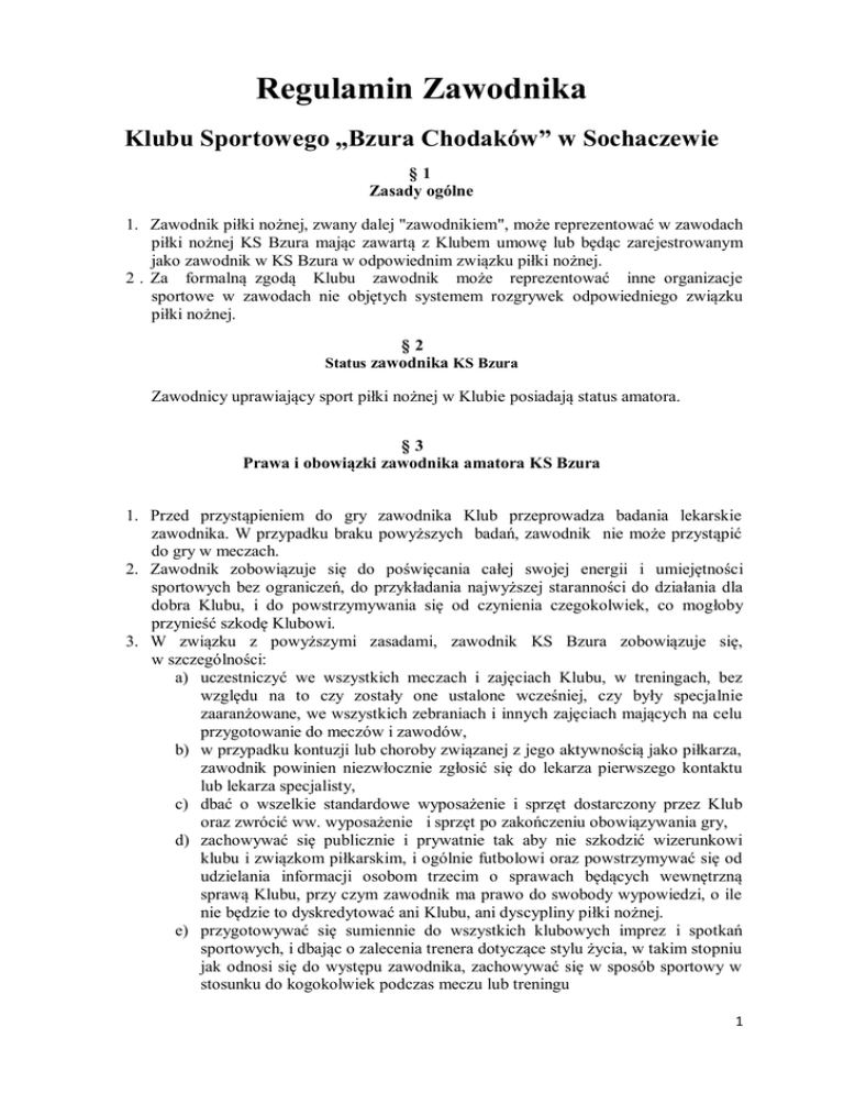 Regulamin Zawodnika Klubu Sportowego „Bzura Chodaków” w Sochaczewie §1 Zasady ogólne 1. Zawodnik piłki nożnej, zwany dalej "zawodnikiem", może reprezentować w zawodach piłki nożnej KS Bzura mając zawartą z Klubem umowę lub będąc zarejestrowanym jako zawodnik w KS Bzura w odpowiednim związku piłki nożnej. 2 . Za formalną zgodą Klubu zawodnik może reprezentować inne organizacje sportowe w zawodach nie objętych systemem rozgrywek odpowiedniego związku piłki nożnej. §2 Status zawodnika KS Bzura Zawodnicy uprawiający sport piłki nożnej w Klubie posiadają status amatora. §3 Prawa i obowiązki zawodnika amatora KS Bzura 1. Przed przystąpieniem do gry zawodnika Klub przeprowadza badania lekarskie zawodnika. W przypadku braku powyższych badań, zawodnik nie może przystąpić do gry w meczach. 2. Zawodnik zobowiązuje się do poświęcania całej swojej energii i umiejętności sportowych bez ograniczeń, do przykładania najwyższej staranności do działania dla dobra Klubu, i do powstrzymywania się od czynienia czegokolwiek, co mogłoby przynieść szkodę Klubowi. 3. W związku z powyższymi zasadami, zawodnik KS Bzura zobowiązuje się, w szczególności: a) uczestniczyć we wszystkich meczach i zajęciach Klubu, w treningach, bez względu na to czy zostały one ustalone wcześniej, czy były specjalnie zaaranżowane, we wszystkich zebraniach i innych zajęciach mających na celu przygotowanie do meczów i zawodów, b) w przypadku kontuzji lub choroby związanej z jego aktywnością jako piłkarza, zawodnik powinien niezwłocznie zgłosić się do lekarza pierwszego kontaktu lub lekarza specjalisty, c) dbać o wszelkie standardowe wyposażenie i sprzęt dostarczony przez Klub oraz zwrócić ww. wyposażenie i sprzęt po zakończeniu obowiązywania gry, d) zachowywać się publicznie i prywatnie tak aby nie szkodzić wizerunkowi klubu i związkom piłkarskim, i ogólnie futbolowi oraz powstrzymywać się od udzielania informacji osobom trzecim o sprawach będących wewnętrzną sprawą Klubu, przy czym zawodnik ma prawo do swobody wypowiedzi, o ile nie będzie to dyskredytować ani Klubu, ani dyscypliny piłki nożnej. e) przygotowywać się sumiennie do wszystkich klubowych imprez i spotkań sportowych, i dbając o zalecenia trenera dotyczące stylu życia, w takim stopniu jak odnosi się do występu zawodnika, zachowywać się w sposób sportowy w stosunku do kogokolwiek podczas meczu lub treningu 1 f) w szczególności, akceptować decyzje podejmowane przez sędziego, asystenta sędziego podczas meczu bez zbędnych protestu. 4. W okresie obowiązywania przynależności Klub zapewnia zawodnikowi co następuje: a) personel do treningu i gry, b) obiekty do treningu i gry, c) sprzęt i ubiór sportowy (zgodnie z założenia budżetu Klubu), d) program treningowy. 5. Klub może płacić stypendium sportowe zawodnikowi zgodnie z przyjętymi zasadami. 6. Klub uznaje indywidualne prawo zawodnika do ochrony swojej prywatności. Jednocześnie zawodnik upoważnia Klub do korzystania z jego indywidualnych praw do wspólnego wykorzystania, w szczególności dotyczy to rozpowszechniania zdjęć zawodnika za pomocą wszystkich obecnych i przyszłych środków technicznych, grupowego marketingu itp. 7. Wszelki doping polegający na użyciu substancji znajdujących się na liście zabronionych substancji i na używaniu zakazanych metod, określonych odpowiednimi przepisami jest zakazany. 8. Klub jest uprawniony do podejmowania wszelkich środków przeciwko zawodnikowi stosującemu doping. 9. Za rodzaj treningu, przygotowanie zawodników, wyniki ligowe, bezpieczeństwo zawodników podczas treningów odpowiada Trener / Instruktor. §4 Możliwy rodzaj wyróżnień 1. Zasadniczymi wyróżnieniami zawodników są; a) pochwała, b) list gratulacyjny, c) dyplom uznania, d) nagroda rzeczowa, e) stypendium sportowe. Organem właściwym do przyznania nagrody jest Zarząd Klubu. §5 Rodzaje kar dyscyplinarnych. Zasady karania 1. W przypadku naruszenia przez zawodnika obowiązków wynikających z niniejszego regulaminu Klub jest uprawniony do stosowania kar dyscyplinarnych, dozwolonych stosownymi przepisami. 2. Przewinieniem dyscyplinarnym jest nieprzestrzeganie statutu, uchwał, zarządzeń, regulaminów i innych wytycznych Klubu, a także innych przepisów nadrzędnych władz sportowych i administracyjnych oraz przepisów gry w piłkę nożną. 3. Za popełnione przewinienia dyscyplinarne wymierza się kary dyscyplinarne. 4. W razie popełnienia kilku przewinień dyscyplinarnych jednocześnie wymierza się jedną karę łączną, stanowiącą karę zasadniczą, która winna uwzględniać wszystkie przewinienia. 2 5. Za przewinienie uważane jest także niszczenie mienia klubu oraz używanie i wykorzystywanie sprzętu sportowego poza treningami i meczami organizowanymi przez KS Bzura Chodaków. 6. Karami dyscyplinarnymi wobec zawodnika mogą być: a) cofnięcie stypendium sportowego (jeżeli takie jest), b) dyskwalifikacja w wymiarze 1 – 5 meczów, c) dyskwalifikacja czasowa – do 6 miesięcy, 7. Za niesportowe lub grubiańskie, ordynarne zachowanie zawodnika lub namawianie i buntowanie do rezygnacji z meczów lub treningów, a także wprowadzanie niewłaściwej atmosfery w zespole (klubie) lub wśród zawodników karami są: a) cofnięcie stypendium sportowego (jeżeli taki jest), b) usunięcie z drużyny. 8. Wobec osób wymienionych w pkt. 7 niniejszego regulaminu może być stosowany środek zapobiegawczy w postaci zawieszenia w prawach: a) zawodnika - do uczestniczenia w rozgrywkach mistrzowskich i pucharowych, b) trenera - do prowadzenia drużyny w czasie meczów mistrzowskich i pucharowych, c) działacza klubowego - do oficjalnego reprezentowania Klubu. §6 Zasady postępowania dyscyplinarnego Organem właściwymi do orzekania w sprawach dyscyplinarnych w stosunku do zawodników i działaczy piłkarskich jest Zarząd Klubu. §7 Postanowienia końcowe 1. 2. Regulamin wcho