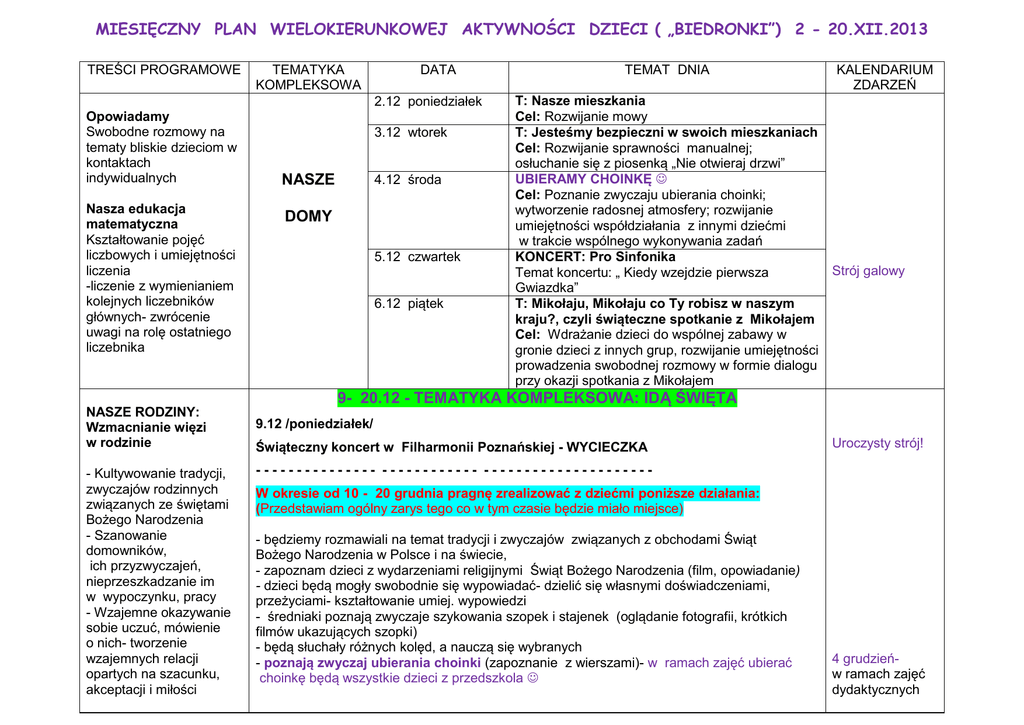 MIESIĘCZNY PLAN WIELOKIERUNKOWEJ AKTYWNOŚCI DZIECI ( „BIEDRONKI”) 2 - 20.XII.2013 TREŚCI PROGRAMOWE TEMATYKA KOMPLEKSOWA DATA 2.12 poniedziałek Opowiadamy Swobodne rozmowy na tematy bliskie dzieciom w kontaktach indywidualnych Nasza edukacja matematyczna Kształtowanie pojęć liczbowych i umiejętności liczenia -liczenie z wymienianiem kolejnych liczebników głównych- zwrócenie uwagi na rolę ostatniego liczebnika 3.12 wtorek 4.12 środa NASZE DOMY 5.12 czwartek 6.12 piątek TEMAT DNIA T: Nasze mieszkania Cel: Rozwijanie mowy T: Jesteśmy bezpieczni w swoich mieszkaniach Cel: Rozwijanie sprawności manualnej; osłuchanie się z piosenką „Nie otwieraj drzwi” UBIERAMY CHOINKĘ Cel: Poznanie zwyczaju ubierania choinki; wytworzenie radosnej atmosfery; rozwijanie umiejętności współdziałania z innymi dziećmi w trakcie wspólnego wykonywania zadań KONCERT: Pro Sinfonika Temat koncertu: „ Kiedy wzejdzie pierwsza Gwiazdka” T: Mikołaju, Mikołaju co Ty robisz w naszym kraju?, czyli świąteczne spotkanie z Mikołajem Cel: Wdrażanie dzieci do wspólnej zabawy w gronie dzieci z innych grup, rozwijanie umiejętności prowadzenia swobodnej rozmowy w formie dialogu przy okazji spotkania z Mikołajem KALENDARIUM ZDARZEŃ Strój galowy 9- 20.12 - TEMATYKA KOMPLEKSOWA: IDĄ ŚWIĘTA NASZE RODZINY: Wzmacnianie więzi w rodzinie - Kultywowanie tradycji, zwyczajów rodzinnych związanych ze świętami Bożego Narodzenia - Szanowanie domowników, ich przyzwyczajeń, nieprzeszkadzanie im w wypoczynku, pracy - Wzajemne okazywanie sobie uczuć, mówienie o nich- tworzenie wzajemnych relacji opartych na szacunku, akceptacji i miłości 9.12 /poniedziałek/ Świąteczny koncert w Filharmonii Poznańskiej - WYCIECZKA Uroczysty strój! --------------- ------------ --------------------W okresie od 10 - 20 grudnia pragnę zrealizować z dziećmi poniższe działania: (Przedstawiam ogólny zarys tego co w tym czasie będzie miało miejsce) - będziemy rozmawiali na temat tradycji i zwyczajów związanych z obchodami Świąt Bożego Narodzenia w Polsce i na świecie, - zapoznam dzieci z wydarzeniami religijnymi Świąt Bożego Narodzenia (film, opowiadanie) - dzieci będą mogły swobodnie się wypowiadać- dzielić się własnymi doświadczeniami, przeżyciami- kształtowanie umiej. wypowiedzi - średniaki poznają zwyczaje szykowania szopek i stajenek (oglądanie fotografii, krótkich filmów ukazujących szopki) - będą słuchały różnych kolęd, a nauczą się wybranych - poznają zwyczaj ubierania choinki (zapoznanie z wierszami)- w ramach zajęć ubierać choinkę będą wszystkie dzieci z przedszkola 4 grudzieńw ramach zajęć dydaktycznych - Przygotowanie programu artystycznego z pomocą n-la - Wspólna zabawa z przybyłymi gośćmi - pojawią się: - ćwiczenia słuchowe- dobieranie rymów do słów związanych ze świętami - ćwiczenia gimnastyczne i oddechowe związane z tematyką świąt - ćwiczenia grafomotoryczne - wykonywanie ćwiczeń usprawniających rękę - zadania na myślenie przyczynowo - skutkowe, pojemności pamięci; szeregowanie, klasyfikowanie, przeliczanie, tworzenie zbiorów, ćwiczenia na orientację w odległości i kierunkach, dodawanie i odejmowanie w zakresie możliwym dla dziecka wykorzystując obrazki i ozdoby związane ze świętami - gimnastyka buzi i języka - na podstawie bajek i opowiadań logopedycznych - zagadki łączące się tematycznie ze świętami - ćwiczenie wpływające na logiczne myślenie - Wspólne pieczenie piernikowo- miodowych ciasteczek- dzieci będą wałkowały ciasto, wyciskały wzory wybranymi przez siebie foremkami, a następnego dnia ozdabiały te piernikowe cuda - dzieci będą oglądały prezentację multimedialną na dużym ekranie pt: „Potrawy na wigilijnym stole” (+ rozmowa kierowana na temat zwyczaju rozpoczynania kolacji wigilijnej wraz z pojawieniem się na niebie pierwszej gwiazdki; praca z wierszem); 11/12 grudzień „Świąteczna Pracownia”, czyli usprawnianie manualne - Kinezjologiczne zabawy dydaktyczne według Doroty Dziamskiej (System „Edukacja przez ruch”) – wykorzystanie naturalnego ruchu organizmu w procesie uczenia się; usprawnianie motoryki małej i zintegrowanego ruchu ciała, doświadczenie radości rytmicznego kreślenia pastelami/ malowania farbą przy muzyce, sztuka składania papieru, kreślenia znaków grafomotorycznych, przekraczanie osi ciała, stymulacja pracy mózgu do pracy - wykonywanie zadań w karcie pracy; kolorowanie, kreślenie po śladzie, obrysowanie obrazków związanych ze Świętami Bożego Narodzenia- usprawnianie motoryki małej (przygotowanie dziecka do nauki pisania) - tworzenie świątecznych ozdób na choinkę - wykonanie świątecznego upominku dla Rodziców - włączenie się w Kiermasz Świąteczny - „Pomagamy Jackowi” , czyli sztuka ręcznie robiona w wykonaniu najmłodszych- będziecie Państwo mogli zakupić te ozdoby na specjalnie przygotowanym stoisku Kiermasz odbędzie się w dniu Spotkania Świątecznego, czyli 17 grudnia - Spotkanie Bożonarodzeniowe, które odbędzie się w Ośrodku Kultury w Suchym Lesie, godz.14.30 - Uroczysty Obiad Wigilijny - 20.12 (piątek) wspólny dla wszystkich dzieci Prosimy aby tego dnia dzieci przyszyły do przedszkola ubrane odświętnie godz.12.00 - W dniu 23.12, 24.12* oraz 30 i 31.12 będą zajęcia ogólnorozwojowe w grupach łączonych *(jeśli utworzy się grupa). mgr Iwona Mikołajczak-Zimna
