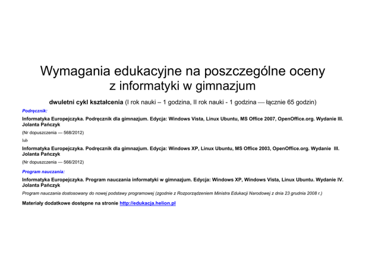 Wymagania edukacyjne na poszczególne oceny z informatyki w gimnazjum dwuletni cykl kształcenia (I rok nauki – 1 godzina, II rok nauki - 1 godzina łącznie 65 godzin) Podręcznik: Informatyka Europejczyka. Podręcznik dla gimnazjum. Edycja: Windows Vista, Linux Ubuntu, MS Office 2007, OpenOffice.org. Wydanie III. Jolanta Pańczyk (Nr dopuszczenia — 568/2012) lub Informatyka Europejczyka. Podręcznik dla gimnazjum. Edycja: Windows XP, Linux Ubuntu, MS Office 2003, OpenOffice.org. Wydanie III. Jolanta Pańczyk (Nr dopuszczenia — 566/2012) Program nauczania: Informatyka Europejczyka. Program nauczania informatyki w gimnazjum. Edycja: Windows XP, Windows Vista, Linux Ubuntu. Wydanie IV. Jolanta Pańczyk Program nauczania dostosowany do nowej podstawy programowej (zgodnie z Rozporządzeniem Ministra Edukacji Narodowej z dnia 23 grudnia 2008 r.) Materiały dodatkowe dostępne na stronie http://edukacja.helion.pl Postanowienia ogólne: I. Ocenie podlegają: 1. Praca na lekcji: ćwiczenia praktyczne; odpowiedzi ustne (znajomość danych zagadnień, posługiwanie się terminami i pojęciami informatycznymi); prezentowanie samodzielnie opracowanych zagadnień; aktywność, systematyczność oraz jakość pracy; współpraca w grupie; stosowanie zasad bezpieczeństwa i właściwej organizacji pracy oraz higieny na stanowisku komputerowym. 2. Sprawdziany i testy wiadomości i umiejętności. 3. Kartkówki. 4. Prace domowe. 5. Prace podejmowane z własnej inicjatywy na przykład: referaty, prezentacje, plansze poglądowe, instrukcje itp. 6. Wykonane prace dodatkowe. 7. Udział w konkursach, olimpiadach. 8. Pomoc w pracach związanych z prawidłowym funkcjonowaniem pracowni. W przypadku nieobecności uczeń ma obowiązek zaliczenia sprawdzianu w terminie nieprzekraczającym dwa tygodnie od momentu przyjścia do szkoły. W przypadku stwierdzenia, że uczeń unika zajęć (wagaruje) nauczyciel może wstawić za brak zaliczenia danego działu programowego ocenę niedostateczną. Uczeń ma jednokrotną możliwość poprawy oceny ze sprawdzianu w terminie ustalonym z nauczycielem. II. Obszary aktywności ucznia będące przedmiotem oceny: posługiwanie się pojęciami, narzędziami oraz prawidłową terminologią informatyczną; stosowanie zasad bezpieczeństwa i właściwej organizacji pracy oraz higieny na stanowisku komputerowym; efektywna praca z poznanymi programami komputerowymi służąca osiąganiu przewidzianych rezultatów; umiejętność rozwiązywania problemów oraz dobór skutecznych metod; zastosowanie zdobytej wiedzy i umiejętności w sytuacjach praktycznych. Szczegółowe kryteria oceniania w zakresie opanowania wiadomości i umiejętności i ich poprawnego stosowania są zgodne z wymaganiami programu z Informatyki wydawnictwa Helion Edukacja. Wymagania edukacyjne z informatyki : I rok nauki 1. Budowa i zastosowanie komputera [6 godz.] Wymagania programowe na: Lp. Temat lekcji Liczba godzin 6 5 4 3 2 1 Regulamin szkolnej pracowni komputerowej. Przedmiotowy system oceniania wiadomości i umiejętności uczniów w 1.1. zakresie informatyki. Uczeń: Uczeń: Uczeń: Uczeń: Uczeń: - wyjaśnia potrzebę poznawania poszczególnych treści programowych na informatyce; - zna tematykę zajęć do realizacji w danym roku szkolnym; - wymienia wybrane zagadnienia, które będą realizowane na informatyce; - stosuje się do zasad regulaminu szkolnej pracowni komputerowej. - stosuje wybrane zasady właściwego zachowywania się w pracowni komputerowej; - nie stosuje się do regulaminu pracowni komputerowej; - zna kryteria oceniania z przedmiotu Informatyka; 1 Znaczenie komputera we współczesnym świecie. Co to jest informatyka i jakie 1.2. są aspekty jej rozwoju? Uczeń: - wymienia cechy oprogramowania komputerowego mające wpływ na szersze zastosowanie komputerów; - zna przedmiotowy - zna wybrane system oceniania w założenia zakresie informatyki; przedmiotowego systemu oceniania; - dostrzega potrzebę stosowania - wymienia komputera oraz dziedziny życia, w odpowiedniego których komputer oprogramowania do pełni ważną rolę; wykonywania - zna dziedziny, w różnorodnych których nie czynności z zakresu wykorzystuje się różnych dziedzin. komputera. - wie, do jakich prac wykorzystuje się komputery. - dostrzega potrzebę stosowania komputerów. - nie zna tematyki zajęć, która będzie realizowana na informatyce; - nie potrafi wymienić żadnych dziedzin, w których komputer znalazł zastosowanie; - wypowiada się na temat roli, jaką może pełnić komputer w przyszłości. 1 - nie zna kryteriów oceniania z przedmiotu; - nie dostrzega potrzeby powszechnego stosowania komputerów. Uczeń: Uczeń: Uczeń: Uczeń: Uczeń: Uczeń: - zna i wyjaśnia pojęcia związane z tematem; - zna pojęcia informatyka, przetwarzanie informacji; - wie na jakie dziedziny życia wpływa rozwój komputeryzacji; - wypowiada się na temat informatyki; - wymienia kilka zastosowań komputerów. - nie potrafi wyjaśnić, co to jest informatyka; - wyjaśnia i uzasadnia do czego może w przyszłości doprowadzić upowszechnienie - wymienia zagrożenia wynikające z rozwoju komputeryzacji. - wyjaśnia, dlaczego rozwój komputeryzacji i internetu pozytywnie wpływają na rozwój państw i - wymienia zastosowania informatyki. - nie rozumie potrzeby rozwoju komputeryzacji. Na czym polega reprezentowanie i przetwarzanie 1.3. informacji przez człowieka i komputer? 1 społeczeństw. komputerów. Uczeń: Uczeń: Uczeń: Uczeń: Uczeń: Uczeń: - wyjaśnia, na czym polega przetwarzanie danych na język zrozumiały dla komputera; - wymienia cyfry niezbędne do komputerowej reprezentacji liczb; - zna pojęcie kod binarny; - rozumie, że komputer przetwarza dane na zrozumiały dla siebie kod. - wie, że komputer przetwarza wprowadzane dane. - nie rozumie, na czym polega przetwarzanie danych na zrozumiały język dla komputera. - wie, w jakiej postaci dane zrozumiałe są dla komputera; - rozumie i wyjaśnia pojęcie 