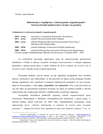 1 Dr hab. Anna Musiała Informacja o współpracy z instytucjami, organizacjami i towarzystwami naukowymi w kraju i za granicą Członkostwo w stowarzyszeniach i organizacjach: 2015 – teraz: 2013 – teraz: recenzent w czasopiśmie Pracownik i Pracodawca członek Stowarzyszenia Henri Capitant; 2006 – teraz: członek Międzynarodowego Stowarzyszenia Prawa Pracy i Zabezpieczenia Społecznego; 2009 – 2010: członek Polskiego Towarzystwa Polityki Społecznej; 2006 – 2010: członek Polskiego Stowarzyszenia Ubezpieczenia Społecznego, członek zarządu wielkopolskiego oddziału stowarzyszenia w kadencji 2007 – 2010. Za wyróżnienie poczytuję zaproszenie mnie do opracowywania prawniczych aktualności z Polski w rubryce Actualités Juridiques Internationales w znanym zagranicą periodyku z zakresu prawa pracy o tytule: Bulletin du Droit Comparé du travail et de la sécurité sociale. Ukazały się już 6 moich opracowań. Prowadząc badania, zawsze staram się jak najpełniej uwzględniać obcy kontekst prawny, orzeczniczy oraz doktrynalny, co ma pozwolić na lepszą ocenę polskiego kształtu danego zagadnienia oraz umożliwić wysunięcie trafniejszych postulatów de lege ferenda. Stąd też skorzystałam z wielu staży, stypendiów czy seminariów. Przy czym pozwoliły mi one nie tylko na prowadzenie kolejnych kwerend, ale także na osobisty kontakt z obcymi naukowcami oraz wygłaszanie referatów i publikowanie swoich prac zagranicą. Szczególnie chciałabym podkreślić ogromną wartość organizowanych przez Uniwersytet Montesquieu w Bordeaux dwutygodniowych seminariów z prawa pracy, w których brałam udział corocznie od 2005 roku, niejednokrotnie prezentując swoje opracowania (m.in. „Libertés individuelles et relations de travail selon l’exemple polonaise”1, „Regulación Polaca sobre igualdad de trata entre hombres y mujeres”2 czy „Le 1 „Libertés individuelles et relations de travail selon l’exemple polonaise”, http://comptrasec.ubordeaux4.fr/static/SEMINAIRES/archives.htm; a także w jęz. hiszp. „Las libertades individuales y las relaciones de trabajo en Polonia”, Revista Latino Americana de Derecho Social 10/2010, s. 389-397. 2 „Regulación Polaca sobre igualdad de trata entre hombres y mujeres”, Revista Latino Americana de Derecho Social 4/2007, s. 239-243. 2 paradigme actuel et futur des relations entre la protection sociale et l’emploi (le modèle de Bismarck de la sécurité sociale selon l’exemple polonais)”3). Istotne znaczenie dla kształtowania mojej sylwetki naukowej miały również odbyte przeze mnie stypendia, jak choćby to – uzyskane od Rządu Republiki Francuskiej w Paryżu czy Uniwersytetu Tokijskiego; na tym ostatnim wygłosiłam wykład zatytułowany: „The evolution of Polish social law and its crucial problems in the European context”4. Uczestniczyłam także we fundamentalnych dla środowiska prawa pracy kongresach prawa pracy: europejskich i światowych, odbywających się na przemian co trzy lata; co do europejskich kongresów: Fryburg (2008), Sewilla (2011), Dublin (2014) co do światowych: Paryż (2006) oraz Sydney (2009). To właśnie tam nawiązałam liczne kontakty naukowe oraz mogłam poznać tematy, z jakimi boryka się światowa nauka. Na kongres we Fryburgu przygotowałam opracowanie o tytule: „The impact of information and communication in the field of labour law”5, które zostało opublikowane w materiałach pokonferencyjnych. W lipcu 2013 zostałam laureatką Programu Mentoring Fundacji na rzecz Nauki Polskiej. Był to dwuletni program współpracy z Prof. Alain Supiot w ramach College de France w Paryżu. Cel współpracy stanowiło kształcenia interdyscyplinarnego ujmowania problematyki prawa zatrudnienia, ze szczególnym uwzględnieniem podejścia historycznego i antropologicznego. Wykaz odbytych stypendiów i staży oraz konferencji Stypendia i staże: 1. 1-31.08.2006: staż naukowy w Międzynarodowej Organizacji Pracy w Genewie, kwerenda biblioteczna w Bibliotece Międzynarodowej Organizacji Pracy w Genewie na temat „Rady społeczno-ekonomiczne w Unii Europejskiej” pod kierunkiem prof. Jean-Claude Javillier; 3 „Le paradigme actuel et futur des relations entre la protection sociale et l’emploi (le modèle de Bismarck de la sécurité sociale selon l’exemple polonais)”, w: A. Y. Salomatin, red., „Political science and jurisprudence: problems of teaching and research”, Penza State University 2007, s. 27-33. 4 „The evolution of Polish social law and its crucial problems in the European context”; materiały Uniwersytetu w Tokio (University of Tokyo) – Newsletter, English Edition No. 1, Autumn – Winter 2008-2009, s. 20-29. 5 „The impact of information and communication in the field of labour law”; referat przygotowany na IX Europejski Kongres Prawa Pracy i Zabezpieczenia Społecznego we Fryburgu – opublikowany w materiałach pokonferencyjnych Kongresu w formie elektronicznej, Fryburg 2008. 3 2. 1-30.11.2006: stypendium naukowe Rządu Republiki Francuskiej na Uniwersytecie w Paryżu (Paris Nanterre X) pod kierunkiem prof. Antoine Lyon-Caen; 3. 22.01–16.03.2007: staż naukowy w Centrum Porównawczego Prawa Pracy i Prawa Socjalnego w Bordeaux (Uniwersytet Montesquieu Bordeaux IV – COMPTRASEC) pod kierunkiem prof. Philippe Auvergnon; 4. 22.01-17.02.2008: staż naukowy w Instytucie Badań Prawnych (Instituto de Investigaciones Jurídicas) Uniwersytetu w Meksyku (Universidad Nacional Autonóma de México) pod kierunkiem prof. Patricia Kurczyn-Villalobos; 5. 24.01-24.02.2009: stypendium naukowe na Wydziale Prawa ( 法 学 部 – Hougakubu) Uniwersytetu w Tokio ( 東 京 大 学 – Tokyo Daigaku) pod kierunkiem prof. Masahiko Iwamura; 6. 09.03-15.03.2009: pobyt na Uniwersytecie w Tuluzie (Université Toulouse 1 Sciences Sociales) w ramach PROGRAMU LLP Erasmus – wymiany pracowników naukowych Programme for Teaching Staff Mobility; wygłoszenie 5-godzinnego wykła
