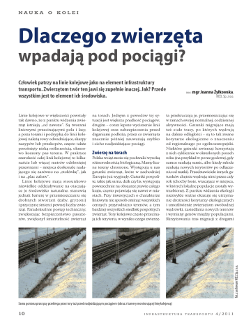 nauka o kolei Dlaczego zwierzęta wpadają pod pociągi? Człowiek patrzy na linie kolejowe jako na element infrastruktury transportu. Zwierzętom twór ten jawi się zupełnie inaczej. Jak? Przede wszystkim jest to element ich środowiska. na torach. Jednym z powodów tej sytuacji jest większa prędkość pociągów, drugim – coraz lepsze wyciszenie linii kolejowej oraz zabezpieczenia przed drganiami podłoża, przez co zwierzęta znacznie później zauważają szybko i cicho nadjeżdżające pociągi. Zwierzę na torach Polska wciąż może się pochwalić wysoką różnorodnością biologiczną. Mamy liczne tereny chronione. Występują u nas gatunki zwierząt, które w zachodniej Europie już wyginęły. Gatunki pospolite, takie jak sarna, dzik czy lis, występują powszechnie na obszarze prawie całego kraju, często pojawiają się nawet w miastach. Przy inwestycjach o charakterze liniowym nie sposób ominąć wszystkich cennych przyrodniczo terenów, a tym bardziej wszystkich siedlisk pospolitych zwierząt. Tory kolejowe często przecinają ich terytoria, w wyniku czego zwierzę- NEEL Sp. z o.o. ta przekraczają je, przemieszczając się w ramach swojej normalnej, codziennej aktywności. Gatunki migrujące mają też stałe trasy, po których wędrują na dalsze odległości – są to tak zwane korytarze ekologiczne o znaczeniu od regionalnego po ogólnoeuropejski. Niektóre gatunki zwierząt korzystają z nich cyklicznie w określonych porach roku (na przykład w porze godowej, gdy samce szukają samic, albo kiedy młode szukają nowych terytoriów po odłączeniu od matki). Przedstawiciele innych gatunków chętnie wędrują nimi przez cały rok (choćby łosie, wracające w miejsca, w których lokalne populacje zostały wytrzebione). Z punktu widzenia ekologii niezwykle ważne okazuje się utrzymanie drożności korytarzy ekologicznych i umożliwienie zwierzętom swobodnej wędrówki, zasiedlania nowych terenów i wymiany genów między populacjami. Skrzyżowania tras migracji z drogami fot. z archiwum NEEL Sp. z o.o. Linie kolejowe w większości powstały tak dawno, że z punktu widzenia zwierząt istnieją „od zawsze”. Są tworami liniowymi przecinającymi pola i lasy, a poza torami i podsypką do linii kolejowej należą rowy odwadniające, skarpy nasypów lub przekopów, często także porośnięty niską roślinnością, okresowo koszony pas terenu. W praktyce szerokość całej linii kolejowej to kilkanaście lub więcej metrów odsłoniętej przestrzeni – miejsca doskonale nadającego się zarówno na „stołówkę”, jak i na „plac zabaw”. Linie kolejowe mają stosunkowo niewielkie oddziaływanie na otaczające je środowisko naturalne, stanowią jednak barierę w przemieszczaniu się drobnych stworzeń (żaby, gryzoni) i przyczynę śmierci pewnej liczby zwierząt. Paradoksalnie postęp techniczny, zwiększając bezpieczeństwo pasażerów, zwiększył śmiertelność zwierząt tekst: mgr Joanna Żyłkowska, Sarna goniona przez psy przebiega przez tory tuż przed nadjeżdżającym pociągiem (obraz z kamery monitorującej linię kolejową) 10 infrastruktura transportu 4/2011 nauka i liniami kolejowymi są miejscami, gdzie szczególnie łatwo o wypadek z udziałem przedstawicieli cennych przyrodniczo gatunków zwierząt. Zwierzęta przekraczają tory również w sytuacjach wymuszonych – kiedy są gonione przez drapieżnika (albo są właśnie tym drapieżnikiem goniącym ofiarę) lub gdy zostaną spłoszone przez ludzi. W obliczu zagrożenia życia liczy się tylko to, aby zdążyć uciec. Gonione zwierzę biegnie niemal na oślep, ma więc wtedy większą szansę wpaść pod pociąg, gdyż w mniejszym stopniu zwraca uwagę na otoczenie. Pociąg wydaje mu się zagrożeniem nieistotnym w porównaniu z drapieżnikiem za plecami. Na uciekające w panice zwierzę nie zadziałają urządzenia mające zapobiegać śmiertelności zwierząt (takie jak tak zwane „wilcze oczy” czy urządzenia akustyczne) – wysyłane przez nie bodźce są bowiem nieporównywalnie mniej istotne od żywego drapieżnika. Tego typu sytuację zarejestrowały zamieszczone przy torach kamery monitoringu – wybrane klatki filmu przedstawiają fot.1-3. Na uwagę zasługuje także problem zwierząt żyjących w stadach i trzymających się razem (sarny, jelenie, dziki). Dokąd idzie przewodnik stada, tam pójdą wszyscy jego członkowie. Czasem przewodnik przekracza drogę lub linię kolejową, gdy nie widać jeszcze nadjeżdżającego pojazdu, ale kiedy drogę pokonuje ostatnie zwierzę, pojazd jest już blisko. Pojedyncze zwierzę stara się za wszelką cenę uniknąć rozdzielenia od reszty stada i woli podjąć ryzyko przebiegnięcia tuż przed nadjeżdżającym pociągiem, niż zostać po drugiej stronie torów. Zazwyczaj samo torowisko jest mało przyjaznym miejscem dla zwierząt, zdarzają się jednak sytuacje, że zwabia je ono do siebie. Zimą, kiedy wszędzie zalega gruba pokrywa śnieżna, odśnieżone tory okazują się najwygodniejszą drogą wędrówki. Wiosną, podczas niedoborów pożywienia, skarpy pokryte niską roślinnością stanowią cenne pastwisko. Zwierzęta wszystkożerne (lisy, dziki) mogą też penetrować tory w poszukiwaniu wyrzuconych resztek pokarmu. Postrzeganie pociągu przez zwierzęta Ze środowiska bezustannie napływa fala bodźców oddziałujących na wszystkie zmysły. Większość jest tylko tłem dla ważnych informacji. Nie zwracamy uwagi na stałe, niezmienne elementy otoczenia, nie przykładamy większej wagi do ogólnego szumu informacyjnego – i podobnie czynią zwierzęta. Jeżeli jakiś zapach lub dźwięk nie wiąże się ani z niczym pożądanym, ani z niczym groźnym, to zwierzę wydaje się go nie dostrzegać. Brak reakcji nie musi oznaczać, że zwierzę czegoś nie widzi lub nie słyszy – może po prostu ignorować daną rzecz jako nieistotną. Aby zrozumieć zachowania zwierząt, należy pamiętać, że wprawdzie ich zmysł
