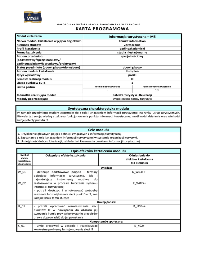 MAŁOP OLSKA WYŻSZ A SZ KOŁA E KONOMICZNA W TARN OW IE KARTA PROGRAMOWA Moduł kształcenia Informacja turystyczna – M5 Nazwa modułu kształcenia w języku angielskim Kierunek studiów Profil kształcenia Forma kształcenia Poziom przedmiotu (podstawowy/specjalnościowy/ ogólnouczelniany/kierunkowy/praktyczny) Status przedmiotu (obowiązkowy/do wyboru) Poziom modułu kształcenia Język wykładowy Semestr realizacji modułu Liczba punktów ECTS Liczba godzin Tourist information Zarządzanie ogólnoakademicki studia niestacjonarne specjalnościowy obowiązkowy II stopień polski III 1 Forma modułu: wykład Forma modułu: ćwiczenia - 10 Jednostka realizująca moduł Moduły poprzedzające Katedra Turystyki i Rekreacji Współczesne formy turystyki Syntetyczna charakterystyka modułu W ramach przedmiotu student zapoznaje się z rolą i znaczeniem informacji turystycznej na rynku usług turystycznych. Utrwala też swoją wiedzę z zakresu funkcjonowania punktu informacji turystycznej, możliwości działania oraz wielkości swojej oferty punktu IT. Cele modułu 1. Przybliżenie głównych pojęć i definicji związanych z informacją turystyczną. 2. Zapoznanie z rolą i znaczeniem informacji turystycznej w systemie organizacji turystyki. 3. Umiejętność doboru lokalizacji, zakładania i kierowania punktami informacji turystycznej. Opis efektów kształcenia modułu Symbol efektu kształcenia dla modułu Osiągnięte efekty kształcenia Odniesienie do efektów kształcenia dla kierunku Wiedza: W_01 W_02 U_01 K_01 - definiuje podstawowe pojęcia i terminy opisujące informację turystyczną, jak i najważniejsze instrumenty możliwe do zastosowania w procesie tworzenia systemu informacji turystycznej - potrafi dostrzec i umotywować potrzebę założenia lub zwiększenia sieci punktów IT, zna kolejne kroki temu służące Umiejętności: - potrafi opracować rozmieszczenie sieci punktów IT w nawiązaniu do obszaru jej tworzenia i umie przy wykorzystaniu przepisów prawa doprowadzić do jej powstania Kompetencje społeczne: - umie pracować w zespole i rozwiązywać konkretne problemy funkcjonowania sieci IT K_W03+++ K_W07++ K_U08++ K_K02+ Treści kształcenia modułu Forma modułu: wykład - Literatura podstawowa Literatura uzupełniająca Forma modułu: ćwiczenia 1. Informacja turystyczna jako przedmiot badań. Rola i znaczenie informacji turystycznej w systemie organizacji turystyki. 2. Prawidłowe i logiczne zakładanie sieci punktów informacji turystycznej na planie wybranych miast Polski. Zasady doboru miejsca punktów informacji turystycznej i poprawne ich oznakowanie. 3. Organizacja pracy w centrum informacji turystycznej. Praca zespołowa nad zagospodarowaniem przestrzeni w centrum informacji z polegająca na pełnym i logicznym wykorzystaniu przestrzeni przeznaczonej dla interesantów oraz obszaru roboczego przeznaczonego wyłącznie dla personelu. 4. Odbiorcy informacji turystycznej. Najważniejsze narzędzia systemu informacji turystycznej. Sposoby przekazu informacji turystycznej i ich ocena na przykładzie katalogów turystycznych różnych biur podróży, jak i informacji medialnych zawartych w dodatkach turystycznych do najbardziej poczytnych polskich gazet. 1. Kruczek Z., Walas B., 2010, Promocja i informacja turystyczna, Proksenia, Kraków. 2. Panasiuk A., 2010, Informacja turystyczna, Wyd. C.H. Beck, Warszawa. 1. Piotrowski J.P., Traczyk M., 1999, Promocja i informacja turystyczna. Wybrane zagadnienia, Instytut Turystyki, Centrum Edukacji Kadr Turystycznych, Kraków. 2. Panasiuk A. red., 2005, Marketing usług turystycznych, PWN, Warszawa. 3. Merski J., 2002, Informacja turystyczna, Almamer, Warszawa. Metody dydaktyczne Metody podające z wykorzystaniem rzutnika slajdów (prezentacje multimedialne), dyskusja na zadane tematy związane z problematyką informacji turystycznej; ćwiczenia wykonywane przez studentów.
