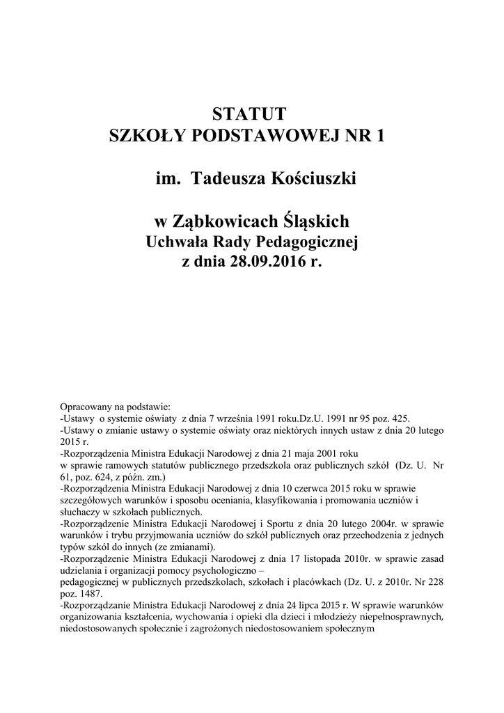 STATUT SZKOŁY PODSTAWOWEJ NR 1 im. Tadeusza Kościuszki w Ząbkowicach Śląskich Uchwała Rady Pedagogicznej z dnia 28.09.2016 r. Opracowany na podstawie: -Ustawy o systemie oświaty z dnia 7 września 1991 roku.Dz.U. 1991 nr 95 poz. 425. -Ustawy o zmianie ustawy o systemie oświaty oraz niektórych innych ustaw z dnia 20 lutego 2015 r. -Rozporządzenia Ministra Edukacji Narodowej z dnia 21 maja 2001 roku w sprawie ramowych statutów publicznego przedszkola oraz publicznych szkół (Dz. U. Nr 61, poz. 624, z późn. zm.) -Rozporządzenia Ministra Edukacji Narodowej z dnia 10 czerwca 2015 roku w sprawie szczegółowych warunków i sposobu oceniania, klasyfikowania i promowania uczniów i słuchaczy w szkołach publicznych. -Rozporządzenie Ministra Edukacji Narodowej i Sportu z dnia 20 lutego 2004r. w sprawie warunków i trybu przyjmowania uczniów do szkół publicznych oraz przechodzenia z jednych typów szkól do innych (ze zmianami). -Rozporządzenie Ministra Edukacji Narodowej z dnia 17 listopada 2010r. w sprawie zasad udzielania i organizacji pomocy psychologiczno – pedagogicznej w publicznych przedszkolach, szkołach i placówkach (Dz. U. z 2010r. Nr 228 poz. 1487. -Rozporządzanie Ministra Edukacji Narodowej z dnia 24 lipca 2015 r. W sprawie warunków organizowania kształcenia, wychowania i opieki dla dzieci i młodzieży niepełnosprawnych, niedostosowanych społecznie i zagrożonych niedostosowaniem społecznym NAZWA SZKOŁY § 1. 1. Nazwa szkoły zawiera: - określenie: Szkoła Podstawowa - numer porządkowy: 1 - imię: Tadeusza Kościuszki - siedzibę: Siedzibą Szkoły Podstawowej nr 1 jest budynek nr 9 położony w Ząbkowicach Śląskich na działce nr 7224. INNE INFORMACJE O SZKOLE PODSTAWOWEJ § 2. 1. Organem prowadzącym Szkołę Podstawową nr 1 jest Gmina w Ząbkowicach Śl. 2. Organem sprawującym nadzór pedagogiczny jest Kuratorium Oświaty we Wrocławiu. 3. Cykl kształcenia trwa w szkole podstawowej sześć lat. 4. Zajęcia dydaktyczne odbywają się na jedną zmianę. 5. Czas rozpoczynania i zakończenia zajęć dydaktycznych oraz przerw i ferii określa Minister Edukacji Narodowej w drodze rozporządzenia w sprawie organizacji roku szkolnego. CELE I ZADANIA SZKOŁY PODSTAWOWEJ § 3. 1. Szkoła podstawowa realizuje cele i zadania określone w ustawie o systemie oświaty oraz w przepisach wykonawczych wydanych na jej podstawie, a w szczególności: 1.1 Umożliwia zdobycie wiedzy i umiejętności niezbędnych do uzyskania świadectwa ukończenia szkoły podstawowej poprzez: - atrakcyjny i nowatorski proces nauczania, - udział w warsztatach językowych, - udział w konkursach przedmiotowych - uczestnictwo w życiu kulturalnym i sportowym. 1.2 Umożliwia absolwentom dalsze kształcenie na poziomie gimnazjalnym poprzez: - poradnictwo psychologiczno-pedagogiczne, - rozwijanie zainteresowań na zajęciach pozalekcyjnych. 1.3 Kształtuje środowisko wychowawcze sprzyjające realizowaniu celów i zasad określonych w ustawie, stosownie do warunków szkoły i wieku ucznia poprzez: - zapewnienie odpowiedniej bazy dla uczniów, - systematyczne diagnozowanie i monitorowanie zachowań uczniów, - realizowanie programu wychowawczego i profilaktyki szkoły podstawowej stanowiącej. 1.4 Sprawuje opiekę nad uczniami odpowiednio do ich potrzeb poprzez: - zorganizowanie zajęć świetlicowych, - umożliwienie spożywania posiłków, - system zapomóg i stypendiów, - prowadzenie zajęć dydaktyczno-wyrównawczych, - prowadzenie zajęć z gimnastyki korekcyjnej. Zajęcia o których mowa wyżej, prowadzone są na podstawie diagnozy dokonanej przez Poradnię Psychologiczno-Pedagogiczną w Ząbkowicach Śl. oraz w miarę potrzeb posiadanych środków finansowych. 1.5 Oddział przedszkolny realizuje cele wynikające z przepisów prawa, a w szczególności w zakresie: - udzielania dzieciom pomocy psychologiczno - pedagogicznej, - umożliwienia dzieciom poczucia tożsamości narodowej, etnicznej, językowej i religijnej, - objęcia opieką wszystkich dzieci i zapewnienia im bezpieczeństwa oraz optymalnych warunków do prawidłowego rozwoju, - stymulowania rozwoju wychowanków, - kształtowania i rozwijania aktywności dziecka wobec siebie i innych ludzi oraz otaczającego świata, - współdziałania z rodzicami w celu ujednolicenia oddziaływań wychowawczych, - przygotowania dzieci do nauki szkolnej, - organizowania opieki nad dziećmi niepełnosprawnymi. 1.6 Oddział przedszkolny realizuje zadania wynikające z przepisów prawa, w szczególności w zakresie: - kształtowania czynnej postawy dzieci wobec własnego zdrowia i bezpieczeństwa oraz rozwijanie sprawności ruchowej, - budzenia wrażliwości emocjonalnej i świadomości moralnej oraz wzmacniania więzi emocjonalnej z rodziną, - integrowania treści edukacyjnych, - wspomagania indywidualnego rozwoju dziecka z wykorzystaniem jego własnej inicjatywy, - prowadzenia działalności diagnostycznej dotyczącej rozwoju wychowanka, - współpracy z poradnią psychologiczno - pedagogiczną w celu udzielania pomocy specjalistycznej, - wspomagania rodziny w wychowaniu dziecka i przygotowaniu go do nauki szkolnej, a w przypadku dzieci niepełnosprawnych ze szczególnym uwzględnieniem stopnia i rodzaju niepełnosprawności. ORGANY SZKOŁY PODSTAWOWEJ § 4. 1.Organami szkoły podstawowej są: - Dyrektor szkoły - Rada Pedagogiczna - Rada Rodziców - Samorząd Uczniowski - Pedagog szkoły - Koordynator do spraw bezpieczeństwa. 2. Rada Pedagogiczna Szkoły Podstawowej Nr 1 w Ząbkowicach Śl. jest kolegialnym organem szkoły w zakresie realizacji zadań dot. kształcenia, wychowania i opieki. 2.1 W skład Rady Pedagogicznej wchodzą wszyscy nauczyciele zatrudnieni w Szkole Podstawowej. 2.2 Rada Pedagogiczna ustala REGULAMIN swojej działalności, a jej posiedzenia są protokołowane. Zał. nr 1 2.3 Uchwały podejmowane są zwykłą większością głosów, w obecności co najmniej ½ członków rady, którzy są zobowiązani do nie u