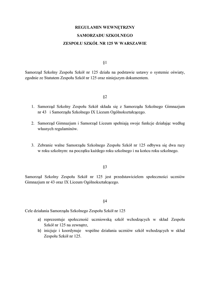 REGULAMIN WEWNĘTRZNY SAMORZADU SZKOLNEGO ZESPOŁU SZKÓŁ NR 125 W WARSZAWIE §1 Samorząd Szkolny Zespołu Szkół nr 125 działa na podstawie ustawy o systemie oświaty, zgodnie ze Statutem Zespołu Szkół nr 125 oraz niniejszym dokumentem. §2 1. Samorząd Szkolny Zespołu Szkół składa się z Samorządu Szkolnego Gimnazjum nr 43 i Samorządu Szkolnego IX Liceum Ogólnokształcącego. 2. Samorząd Gimnazjum i Samorząd Liceum spełniają swoje funkcje działając według własnych regulaminów. 3. Zebranie walne Samorządu Szkolnego Zespołu Szkół nr 125 odbywa się dwa razy w roku szkolnym: na początku każdego roku szkolnego i na końcu roku szkolnego. §3 Samorząd Szkolny Zespołu Szkół nr 125 jest przedstawicielem społeczności uczniów Gimnazjum nr 43 oraz IX Liceum Ogólnokształcącego. §4 Cele działania Samorządu Szkolnego Zespołu Szkół nr 125 a) reprezentuje społeczność uczniowską szkół wchodzących w skład Zespołu Szkół nr 125 na zewnątrz, b) inicjuje i koordynuje wspólne działania uczniów szkół wchodzących w skład Zespołu Szkół nr 125. REGULAMIN SAMORZADU SZKOLNEGO IX LICEUM OGÓLNOKSZTAŁCĄCEGO im. KLEMENTYNY HOFFMANOWEJ W WARSZAWIE wraz z ordynacją wyborczą. Rozdział I POSTANOWIENIA OGÓLNE §1 Uczniowie IX Liceum Ogólnokształcącego tworzą wspólnotę samorządową, której jedynym przedstawicielem jest Samorząd Szkolny. §2 Samorząd Szkolny działa na podstawie ustawy o systemie oświaty, statutu szkolnego oraz niniejszego dokumentu. §3 Samorząd może posiadać siedzibę wyznaczoną przez Dyrektora Liceum w zależności od możliwości lokalowych szkoły. §4 Samorząd realizuje niniejsze cele: a) reprezentuje społeczność uczniowską Szkoły, b) dba o przestrzeganie praw ucznia, c) inicjuje działalność oświatową, kulturalną, sportową, turystyczną, rozrywkową i charytatywną w porozumieniu i za zgodą Dyrektora. §5 Organami Samorządu Szkolnego są: a) b) c) d) Przewodniczący Samorządu Szkolnego, Rada Uczniów, Prezydium Samorządu Szkolnego, Opiekun Samorządu Szkolnego. Rozdział II PRZEWODNICZĄCY SAMORZĄDU SZKOLNEGO §6 Tryb i zasady wyboru Przewodniczącego Samorządu Szkolnego reguluje ordynacja wyborcza. §7 Przewodniczący rozpoczyna swoją kadencję w dniu ogłoszenia przez Szkolną Komisję Wyborczą ostatecznych wyników wyborów. §8 Do obowiązków Przewodniczącego należy: a) realizacja celów określonych w art.4 b) kierowanie pracą i reprezentowanie Samorządu Szkolnego c) informowanie uczniów i Dyrekcji o bieżących pracach Samorządu. §9 Do kompetencji Przewodniczącego należy: a) zwoływanie i przewodniczenie obradom Rady Uczniów, b) powoływanie i kierowanie pracą Prezydium Samorządu, c) występowanie do Dyrekcji z propozycjami i opiniami dotyczącymi spraw uczniowskich, d) ewentualne występowanie, z zachowaniem drogi służbowej, do odpowiedniego organu władzy szkolnej w imieniu zainteresowanego ucznia, e) powoływanie i odwoływanie przewodniczących sekcji celem realizacji celów określonych w art.4., f) składanie wniosków do wychowawców klas o podniesienie oceny z zachowania uczniom wyróżniającym się w pracy Samorządu, g) występowanie do Dyrekcji o zwolnienie odpowiednich uczniów z zajęć, celem wykonania przez nich pilnych prac Samorządu. § 10 Nie później niż 14 dni po objęciu urzędu Przewodniczący przedstawia na forum Rady Uczniów roczny plan pracy Samorządu. § 11 1. W wypadku rezygnacji Przewodniczącego z zajmowanej funkcji, jego kompetencje i obowiązki przejmuje wyznaczony przez niego zastępca. W wypadku braku zastępcy kompetencje i obowiązki przejmuje najstarszy, posiadający bierne prawo wyborcze, członek Rady Uczniów. 2. Kadencja tak wyłonionego Przewodniczącego jest skrócona o czas sprawowania urzędu przez ustępującego Przewodniczącego. 3. Przewodniczący podaje do publicznej wiadomości przyczyny swojej rezygnacji, jak również imię i nazwisko osoby przejmującej urząd. 4. W wypadku przedłużającej się nieobecności Przewodniczącego – minimum 2 tygodnie – jego obowiązki czasowo przejmuje zastępca lub odpowiedni członek Rady Uczniów patrz § 13. p.1. 5. Zastępca sprawuje urząd z obowiązkami i kompetencjami Przewodniczącego do momentu powrotu zwierzchnika. 6. Przewodniczący może zostać odwołany z funkcji decyzją ¾ Rady Uczniów przy obecności wszystkich członków Rady na wniosek Opiekuna Samorządu, Dyrektora lub więcej niż jednego członka Rady Uczniów. 7. Dyrektor może zarządzić skrócenie kadencji przewodniczącego w przypadku rażącego naruszenia Statutu Szkoły przez Przewodniczącego. 8. W sytuacji przewidzianej w ust. 6 i 7 zarządza się nowe wybory Przewodniczącego. § 12 Przewodniczący dysponuje pieczątką Samorządu, przechowywaną w szkole. Rozdział III RADA UCZNIÓW § 13 1. Rada Uczniów stanowi organ uchwałodawczy Samorządu Szkolnego i może podejmować uchwały w sprawach wymienionych w art.4. 2. Rada Uczniów wspomaga Przewodniczącego w realizacji jego celów statutowych. § 14 W skład Rady Uczniów wchodzą przewodniczący samorządów wszystkich klas Liceum powoływani na rok szkolny. § 15 Decyzje Rady Uczniów są dla Samorządu wiążące. § 16 1. Rada Uczniów podejmuje swoje decyzje na protokołowanych obradach większością głosów. 2. W przypadku równej liczby głosów decyduje głos Przewodniczącego Samorządu. § 17 1. Wniosek pod głosowanie ma prawo zgłosić Przewodniczący Samorządu i każdy członek Rady. 2. Debatę nad każdym wnioskiem prowadzi Przewodniczący Samorządu. 3. Wyniki głosowania podaje się do wiadomości publicznej. § 18 1. W przeciągu 20 dni od ogłoszenia ostatecznych wyników wyborów Rada Uczniów głosuje nad uchwaleniem absolutorium dla poprzedniego Przewodniczącego. 2. Wyniki głosowania podaje się do wiadomości publicznej. Rozdział IV PREZYDIUM SAMORZĄDU § 19 Prezydium Samorządu jest organem wspomagającym Przewodni