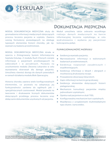 E S K U L A P System Informatyczny Szpitala D o k u m e t a c j a M e d y c z n a MODU£ DOKUMENTACJA MEDYCZNA s³u¿y do Modu³ umo¿liwia tak¿e zebranie wszelkiego gromadzenia informacji medycznych dotycz¹cych rodzaju procesu leczenia pacjenta w szpitalu. Zawiera informacyjnej leczenia szpitalnego, w celu szereg formularzy pozwalaj¹cych na obs³ugê wydrukowania typowych elementów historii choroby, jak np. koñcz¹cemu pobyt. danych i medycznych wydania jej na karcie pacjentowi wywiad czy badania przedmiotowe. f u n k c j o n a l n o æ m o d u ³ u MODU£ DOKUMENTACJA MEDYCZNA dzia³a w oparciu o Zintegrowany System Informatyczny ® Ewidencja wywiadu pacjenta; Szpitala Eskulap. Z modu³u Ruch Chorych czerpie ® Wprowadzanie informacje o pacjentach przebywaj¹cych na oddzia³ach i w poradniach. Pozwala na uruchomienie modu³u Zlecenia Lekarskie w celu wystawiania skierowañ dla danego pacjenta. Umo¿liwia równie¿ dostêp do danych powsta³ych w ramach dzia³ania modu³u Blok Operacyjny. Historia choroby zawiera wiele konfigurowalnych elementów, co pozwala na adaptacjê jej funkcjonalnoœci zarówno do ogólnych jaki i specjalistycznych zastosowañ. Modu³ pozwala na tworzenie i drukowanie licznych dokumentów informacji o wykonanych badaniach przedmiotowych; ® Ewidencja rozpoznañ zasadniczych i wspó³istniej¹cych; ® Ewidencja informacji o lekach i alergiach z mo¿liwoœci¹ drukowania recept; ® Prowadzenie obserwacji lekarskich; ® Zapis informacji na karcie gor¹czkowej; ® Ewidencja elementów dotycz¹cych historii pielêgniarskiej; ® Mechanizm konsultacji pacjentów miêdzy jednostkami szpitalnymi; dotycz¹cych przebiegu procesu leczenia oraz ® Opieka nad pacjentem w skali TISS; do³¹czanie dokumentów uzyskanych od pacjenta. ® Konfigurowalny mechanizm kart szpitalnych; ® Wspó³praca z urz¹dzeniami multimedialnymi typu skaner, karta wideo. Zastrzega siê prawo wprowadzenia zmian do treœci niniejszego dokumentu bez uprzedniego powiadomienia. Wszystkie firmy, nazwiska i inne dane u¿ywane w przyk³adach s¹ fikcyjne, o ile nie zaznaczono, ¿e jest inaczej. Politechnika Poznañska Instytut Informatyki jest w³aœcicielem wszystkich praw do niniejszego dokumentu i rozwi¹zañ w nim przedstawionych. Wszystkie nazwy firm i produktów wymienione w niniejszym dokumencie mog¹ byæ znakami towarowymi zarejestrowanymi przez ich w³aœcicieli. Wiêcej na stronie: www.eskulapsystem.pl