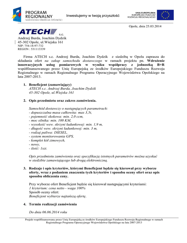 Inwestujemy w twoją przyszłość Opole, dnia 25.03.2014 s.c. Andrzej Burda, Joachim Dydzik 45-302 Opole, ul.Wiejska 161 NIP: 754-18-97-732 REGON : 531113339 Firma ATECH s.c. Andrzej Burda, Joachim Dydzik z siedzibą w Opolu zaprasza do składania ofert na zakup samochodu dostawczego w ramach projektu pn. Wdrożenie innowacyjnych usług pomiarowych w wyniku współpracy z jednostką B+R współfinansowanego przez Unię Europejską ze środków Europejskiego Funduszu Rozwoju Regionalnego w ramach Regionalnego Programu Operacyjnego Województwa Opolskiego na lata 2007-2013. 1. Beneficjent (zamawiający) ATECH s.c. Andrzej Burda, Joachim Dydzik 45-302 Opole, ul.Wiejska 161 2. Opis przedmiotu oraz zakres zamówienia. Samochód dostawczy o następujących parametrach: - dopuszczalna masa całkowita: max 3,5t, - pojemność skokowa: min. 2,0 ccm, - moc silnika: min. 100 KM, - wysokość wew. skrzyni ładunkowej: min. 1,9 m, - długość wew. skrzyni ładunkowej: min. 3 m, - rodzaj paliwa: DIESEL, - system monitorowania GPS, - komplet kół zimowych, - nowy, - ilość: 1szt. Opis przedmiotu zamówienia oraz specyfikację istotnych parametrów można uzyskać w siedzibie zamawiającego lub drogą elektroniczną. 3. Rodzaje i opis kryteriów, którymi Beneficjent będzie się kierował przy wyborze oferty, wraz z podaniem znaczenia tych kryteriów i sposobu oceny ofert oraz opis sposobu obliczenia ceny. Przy wyborze ofert Beneficjent będzie się kierował następującymi kryteriami: 1 kryterium: cena netto - waga 100% Sposób oceny ofert: Beneficjent wybierze najtańszą ofertę. 4. Termin realizacji zamówienia Do dnia 06.06.2014 roku Projekt współfinansowany przez Unię Europejską ze środków Europejskiego Funduszu Rozwoju Regionalnego w ramach Regionalnego Programu Operacyjnego Województwa Opolskiego na lata 2007-2013 Inwestujemy w twoją przyszłość 5. Miejsce, sposób i termin składania ofert Ofertę należy sporządzić na druku „Formularz ofertowy” stanowiącym załącznik nr 1 do niniejszego ogłoszenia, w języku polskim, w formie pisemnej, czytelnie, wypełniając nieścieralnym atramentem lub długopisem, maszynowo lub komputerowo. Oferty należy przesłać na adres spółki, emailem: [email protected] lub złożyć osobiście w siedzibie firmy w terminie do dnia 01.04.2014 do godziny 12.00. 6. Opis warunków udziału w postępowaniu: O zamówienie może ubiegać się wykonawca, który: - posiada uprawnienia do wykonywania określonej działalności lub czynności, jeżeli ustawy nakładają obowiązek posiadania takich uprawnień Oferta musi zawierać minimum takie informacje jak: - dane oferenta - dane beneficjenta, do którego skierowana jest oferta - nazwę urządzenia - wyszczególnione parametry urządzenia - cenna netto oraz cena brutto - warunki dostawy - warunki gwarancji - datę realizacji zamówienia - datę sporządzenia oferty - datę ważności oferty - podpis i pieczęć oferenta 7. Rozstrzygniecie postępowania i zlecenie realizacji zamówienia Postępowanie ofertowe zostanie rozstrzygnięte w dniu 01.04.2014 do godz. 17.00. Po tym dniu zostanie wysłane zlecenie realizacji zamówienia do firmy, która spełniła warunki ogłoszenia i jednocześnie przedstawiła najkorzystniejszą ofertę. W przypadku wątpliwości prosimy o kontakt w godzinach 10-15 pod numerem telefonu 077 456 84 84 wew. 32. Projekt współfinansowany przez Unię Europejską ze środków Europejskiego Funduszu Rozwoju Regionalnego w ramach Regionalnego Programu Operacyjnego Województwa Opolskiego na lata 2007-2013 Inwestujemy w twoją przyszłość Załącznik nr 1 – Formularz ofertowy (Pieczęć oferenta) …………………………………….… (miejscowość, data) Dane Oferenta: Nazwa Adres Osoba do kontaktu Imię i nazwisko: …………………………………..………………………….. Telefon: ………………………………Fax: …………………….…………… E-mail: ……………...………………………………………………………… W nawiązaniu do ogłoszenia firmy ATECH s.c. Andrzej Burda, Joachim Dydzik z dnia 25.03.2014r. o składaniu ofert na zakup samochodu dostawczego w ramach projektu pn. Wdrożenie innowacyjnych usług pomiarowych w wyniku współpracy z jednostką B+R współfinansowanego przez Unię Europejską ze środków Europejskiego Funduszu Rozwoju Regionalnego w ramach Regionalnego Programu Operacyjnego Województwa Opolskiego na lata 2007-2013, przedstawiam następującą ofertę realizacji w/w przedmiotu: Nazwa i opis przedmiotu :……………………………………………………………………….. …………………………………………………………………………………………………… …………………………………………………………………………………………………… Wartość brutto ( tj. z podatkiem VAT):………………………………………..........................zł; (słownie:………………………………………………………………………………….………) Wartość netto…………………………………………………………………………………..zł (słownie:………………………………………………………………………………….………) Warunki dostawy:…………………………………………………………………………………. …………………………………………………………………………………………………….. Warunki gwarancji:………………………………………………………………………………... ……………………………………………………………………………………………………... ……………………………………………………………………………………………………... Data realizacji zamówienia:………………………